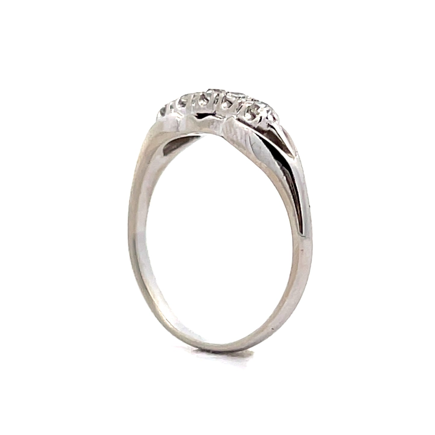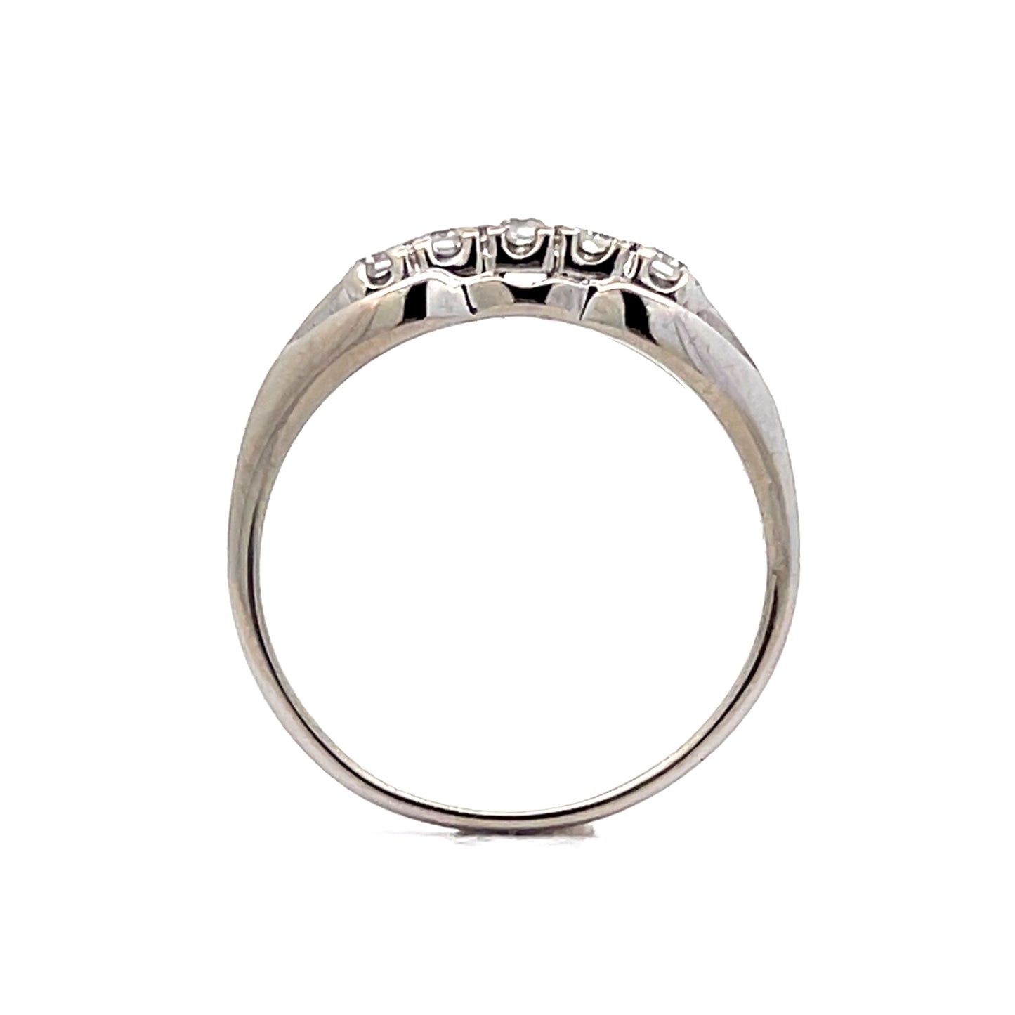 This vintage Mid-Century five-stone wedding band is a graceful representation of retro design. Made from 14 karat white gold, the ring features five single-cut diamonds arranged to maximize sparkle With clean lines and balanced proportions, this piece works beautifully on its own or as a complement to an engagement ring.