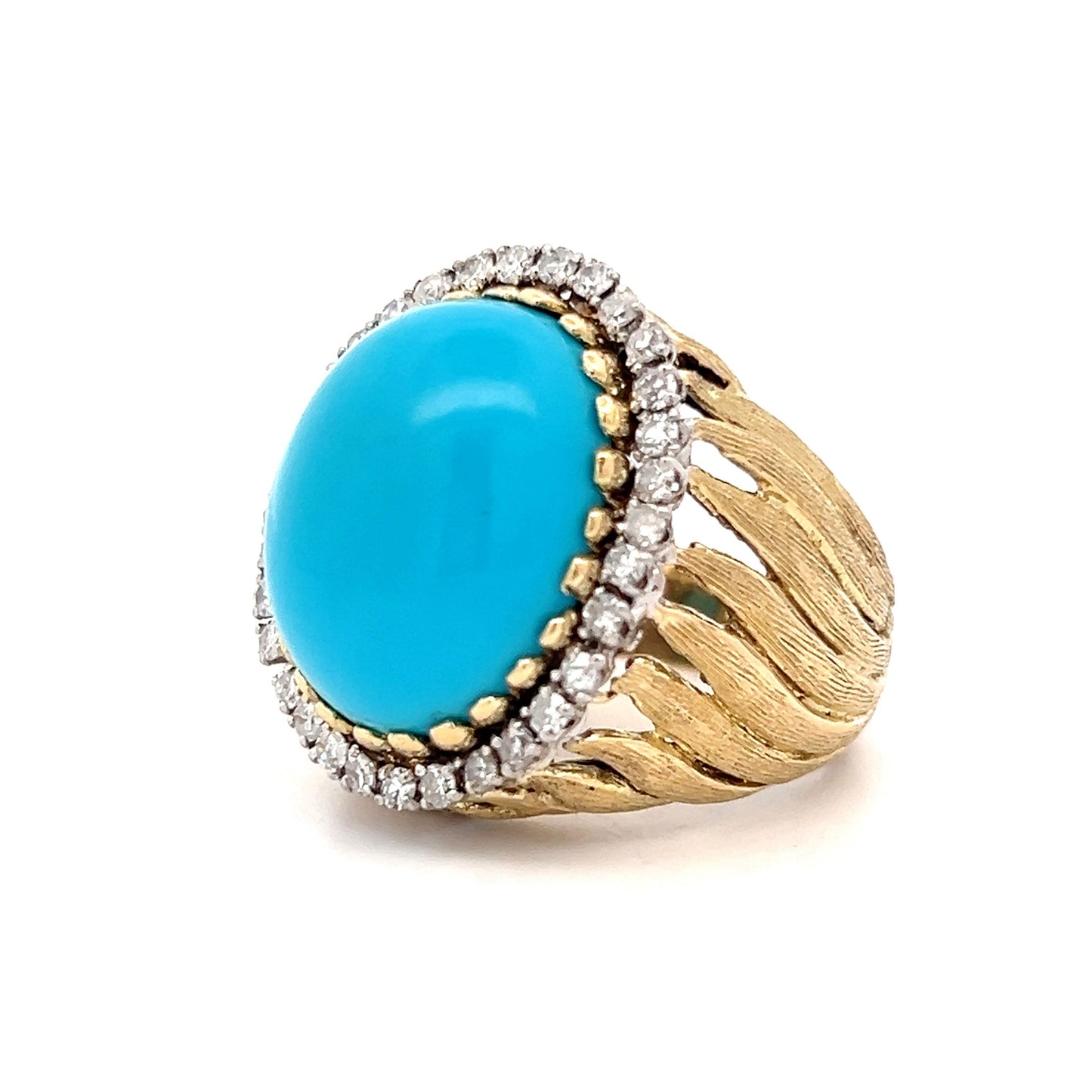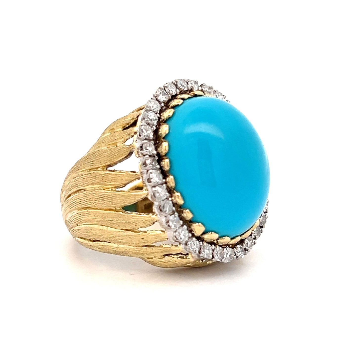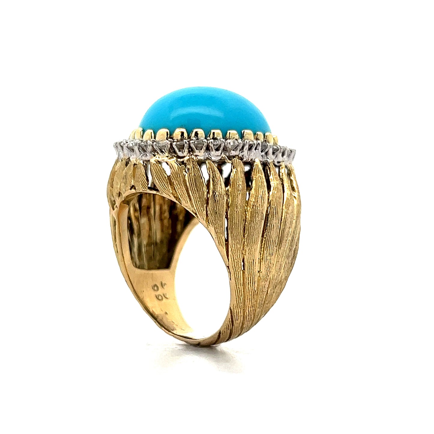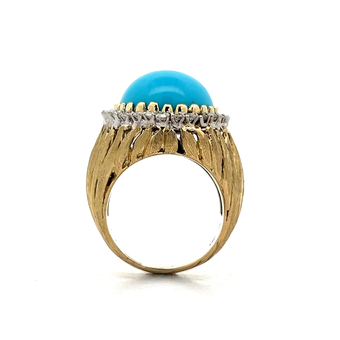 Make a statement with this stunning vintage cocktail ring! Crafted in 14 karat yellow gold, this Mid-Century piece features a richly textured band and an oval cabochon cut turquoise as the centerpiece. At 16.87 carats, the cabochon cut turquoise exudes a captivating blue hue, making it a standout in any crowd. Surrounding the turquoise are thirty-two (32) accenting natural diamonds, each measuring 1.8mm and weighing .025 carats, for a total accent stone weight of .80 carats. The diamonds add a touch of sparkle and elegance to this vintage beauty. This ring is a perfect representation of mid-century style, with its bold colors and glamorous design.