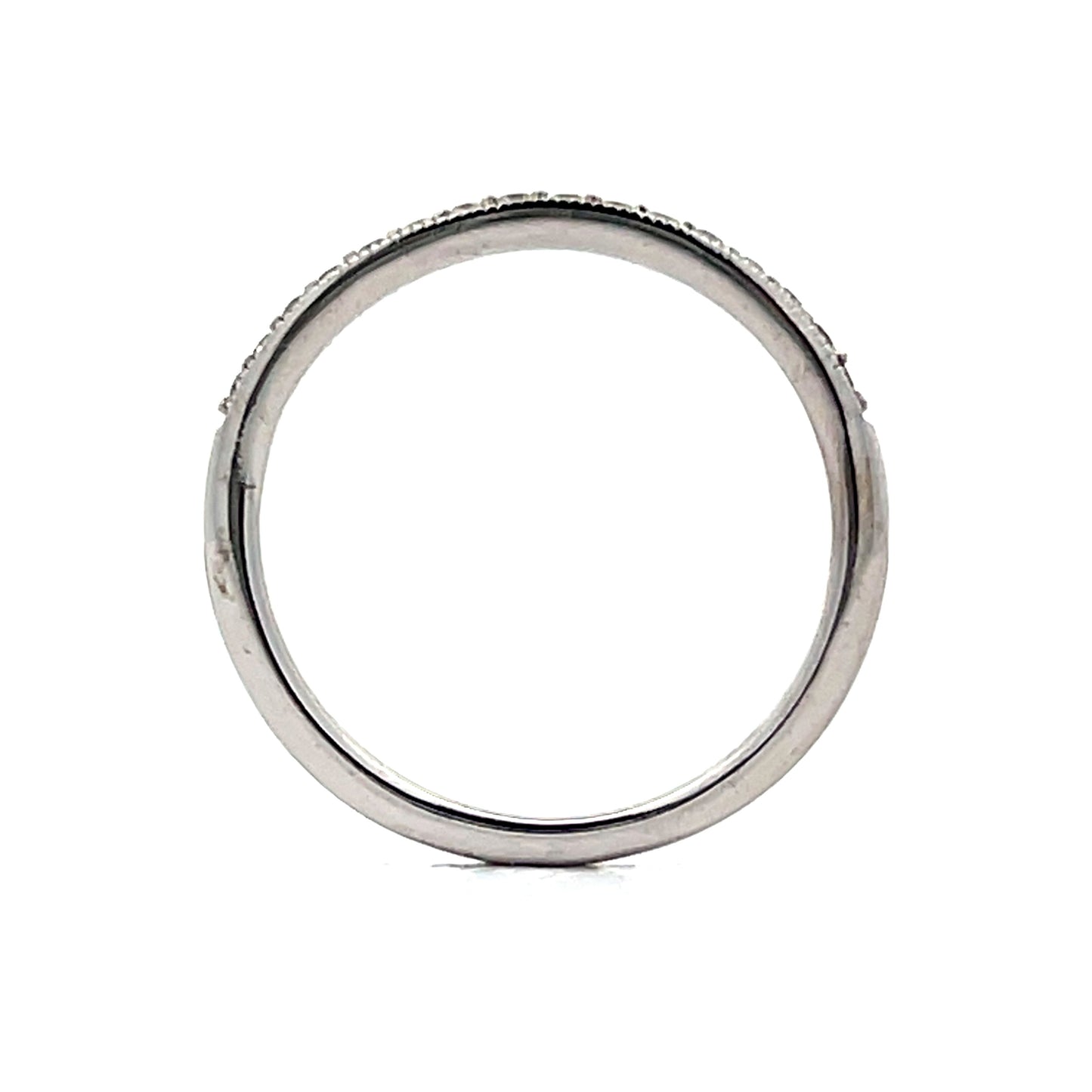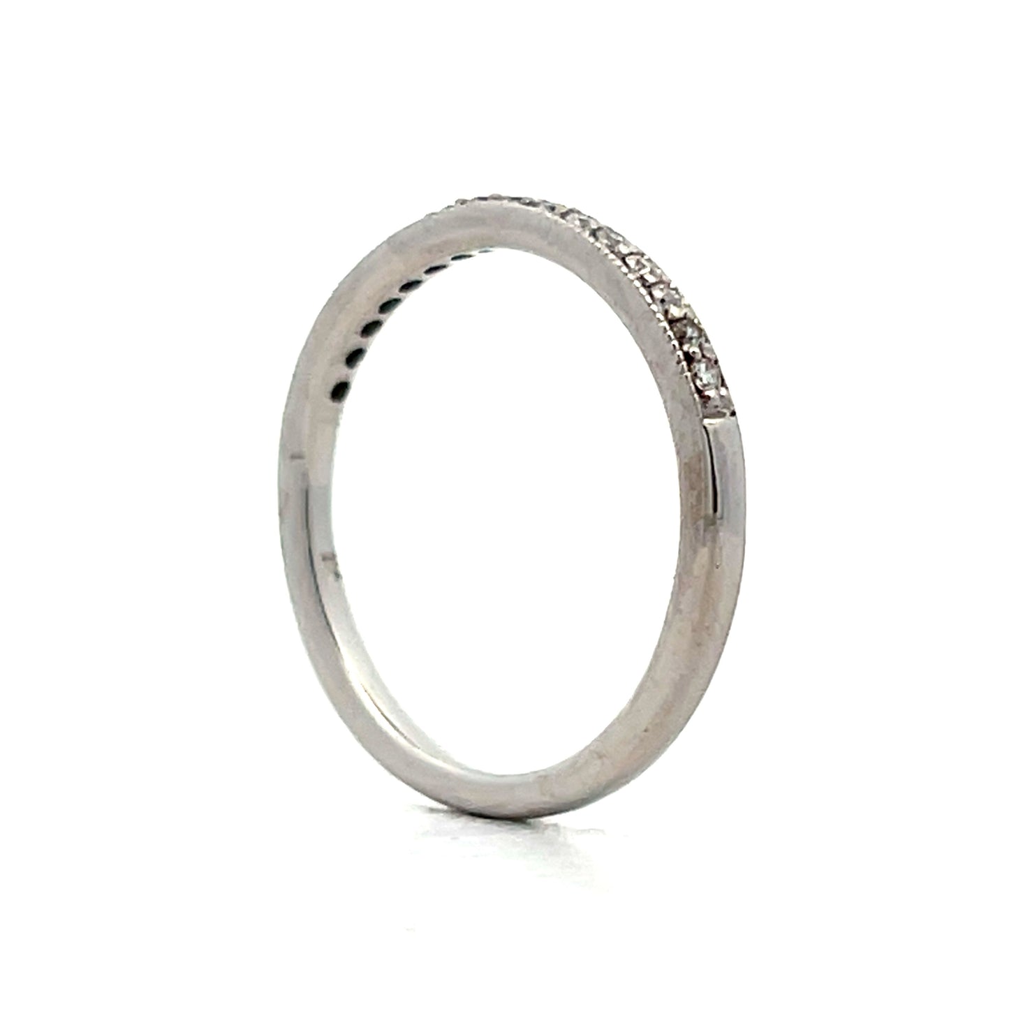 This 14 karat white gold wedding band features channel-set round brilliant cut diamonds with H color. A delicate milgrain edge adds texture to the band, highlighting the diamonds’ seamless sparkle. Whether worn solo or paired with other rings, this band stands as a symbol of unity and elegance, blending tradition with contemporary style.
