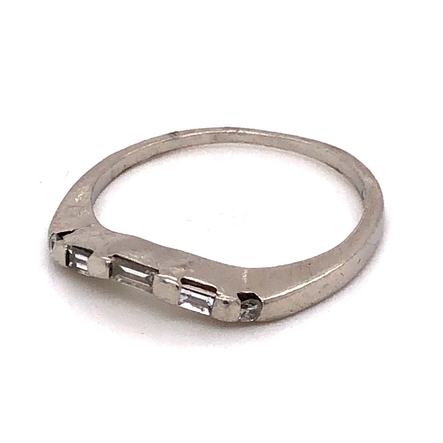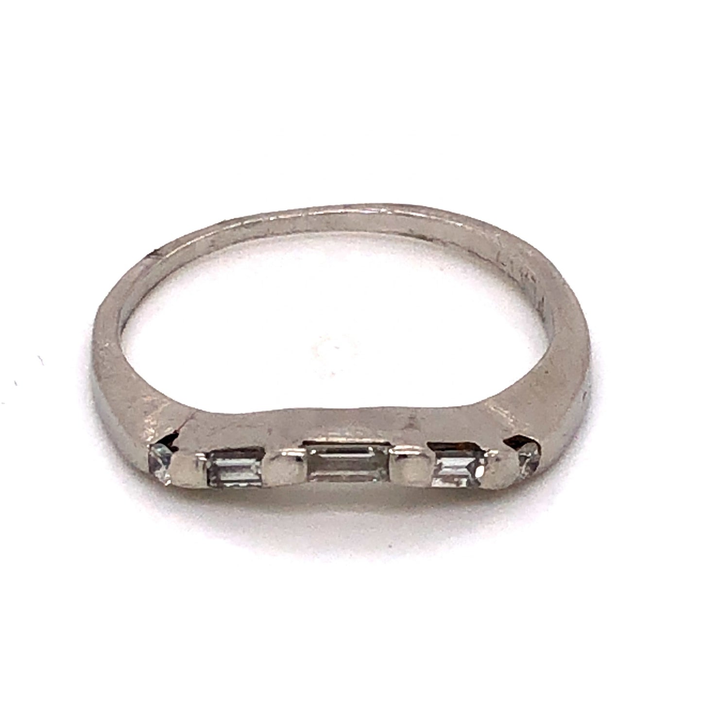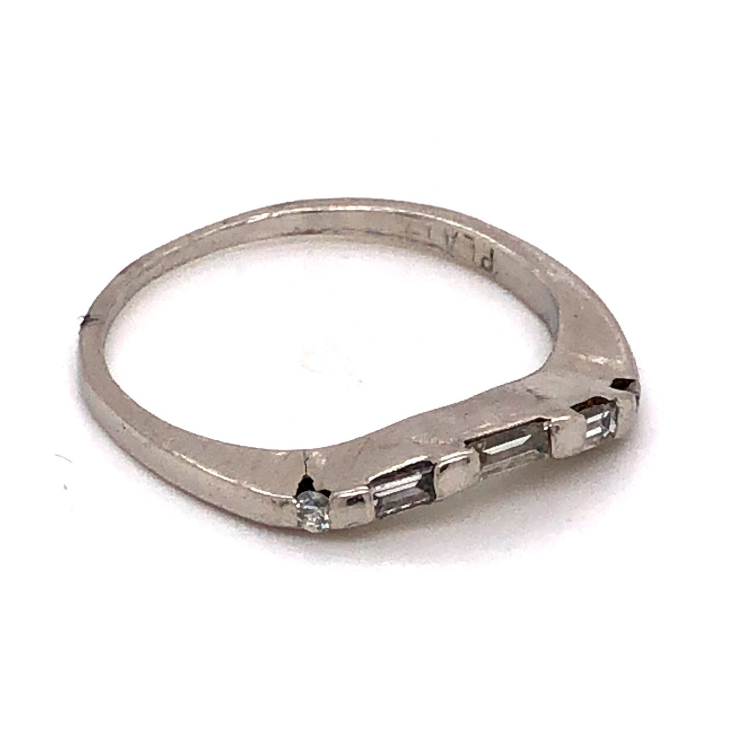 .16 Contoured Art Deco Diamond Wedding Band in Platinum. This antique Art Deco wedding band features .16 carats of diamonds finished on a contoured platinum band. The primary diamond weighs .055 carats and is accented by two (2) .04 carat and two (2) .015 carat diamonds. The diamonds are set in thick, stylish platinum prongs. Measuring 2.42 mm in width, this ring would look great as a wedding band or as one in a set of stacking bands.