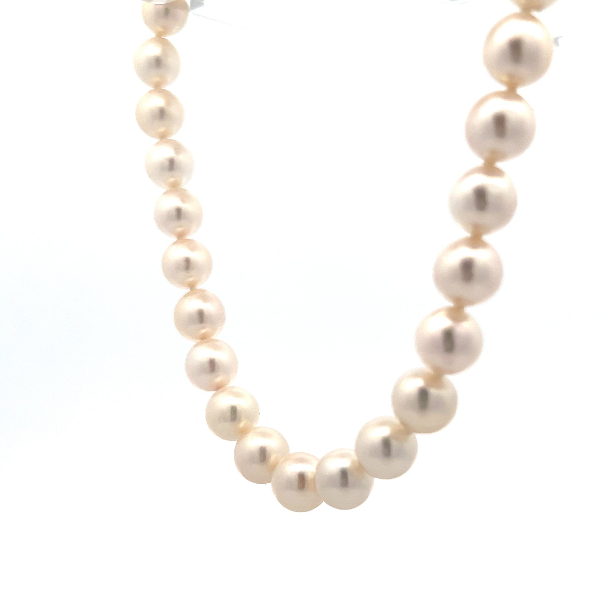 This 16-inch cultured pearl necklace features 46 pearls ranging from 8.5 to 9.0mm, each displaying a soft pink luster and secured with a 14-karat yellow gold ball clasp. The pearls are carefully matched for size and color consistency throughout the strand, creating a uniform appearance from clasp to clasp. The bead-style stringing allows each pearl to sit naturally against the next, while the gold clasp provides both security and a complementary metal accent.