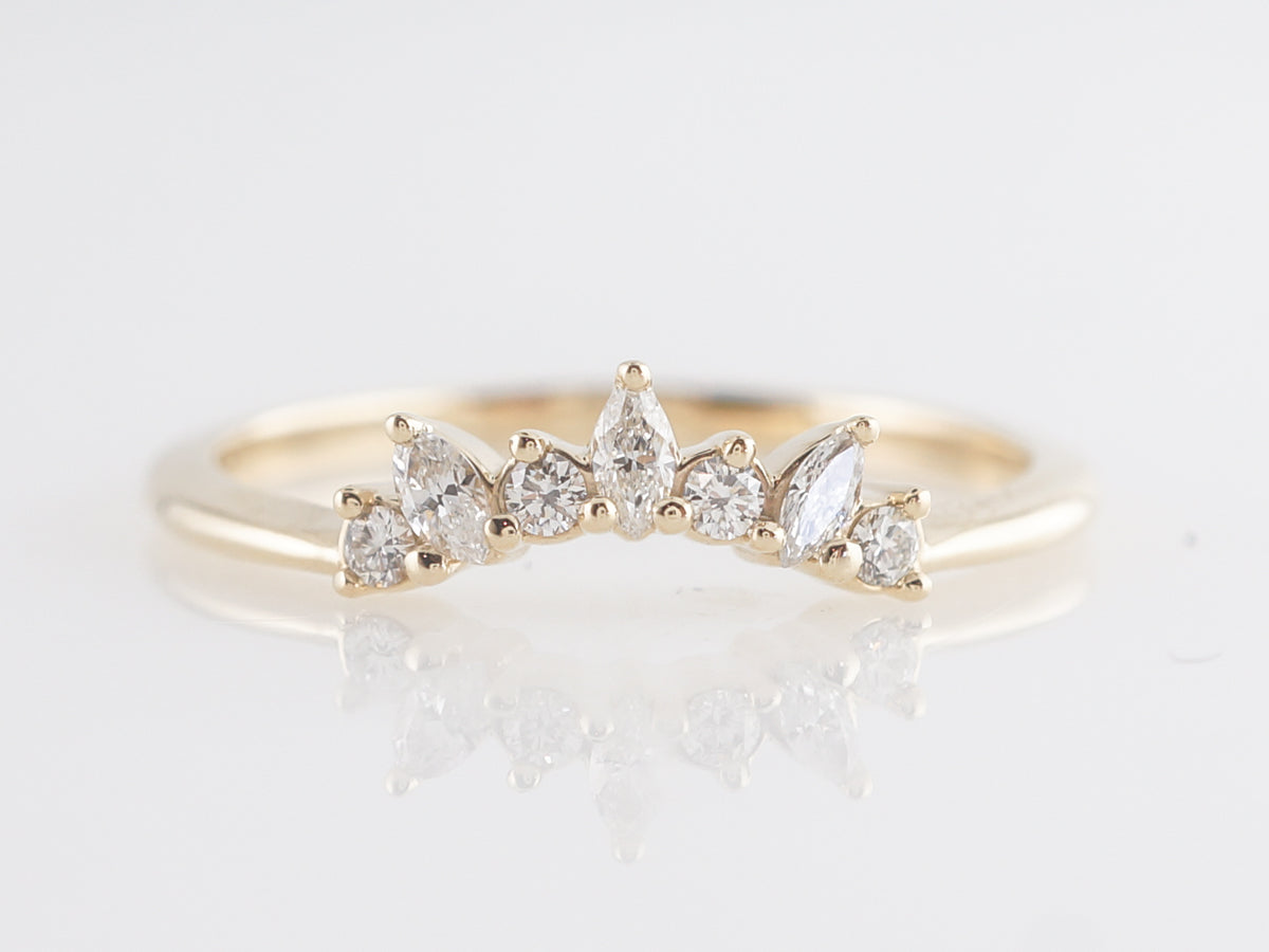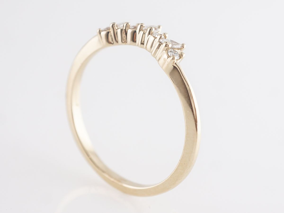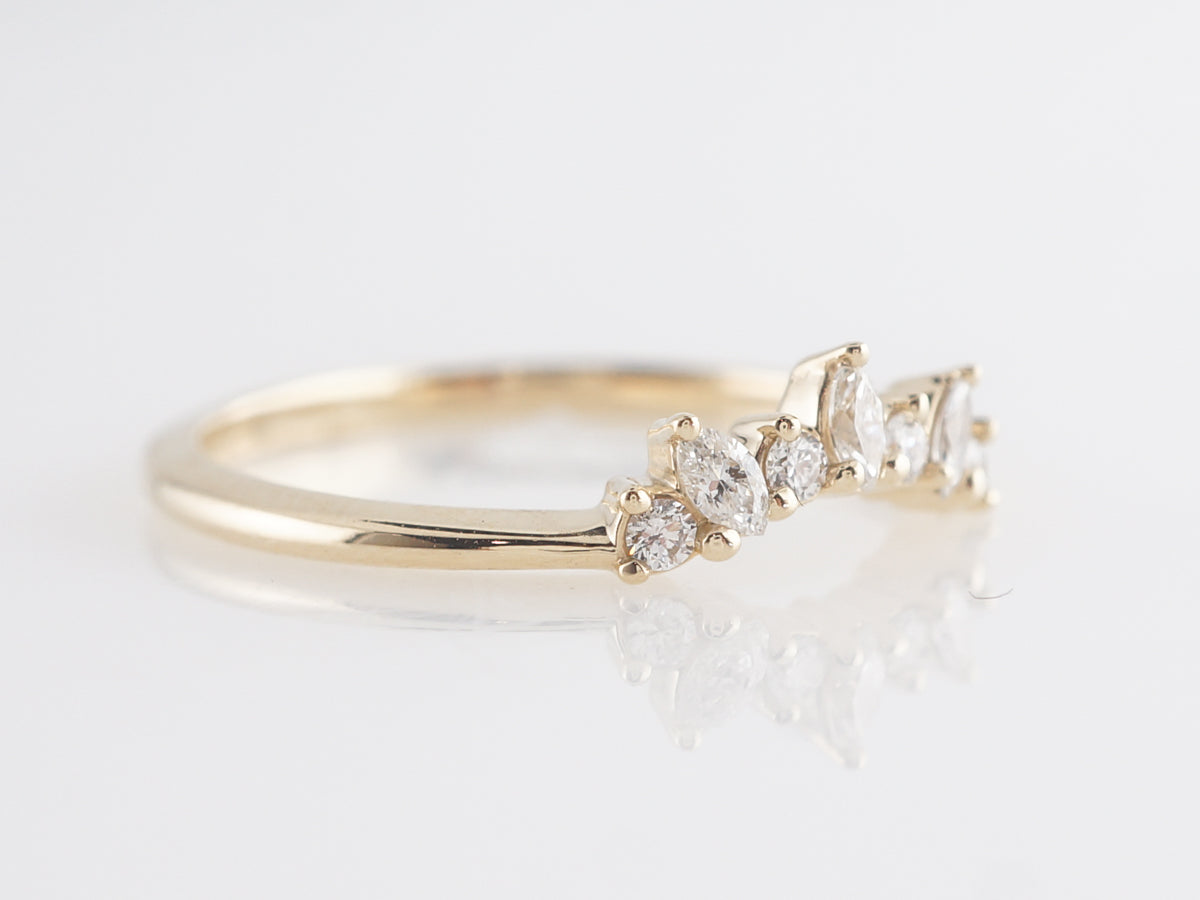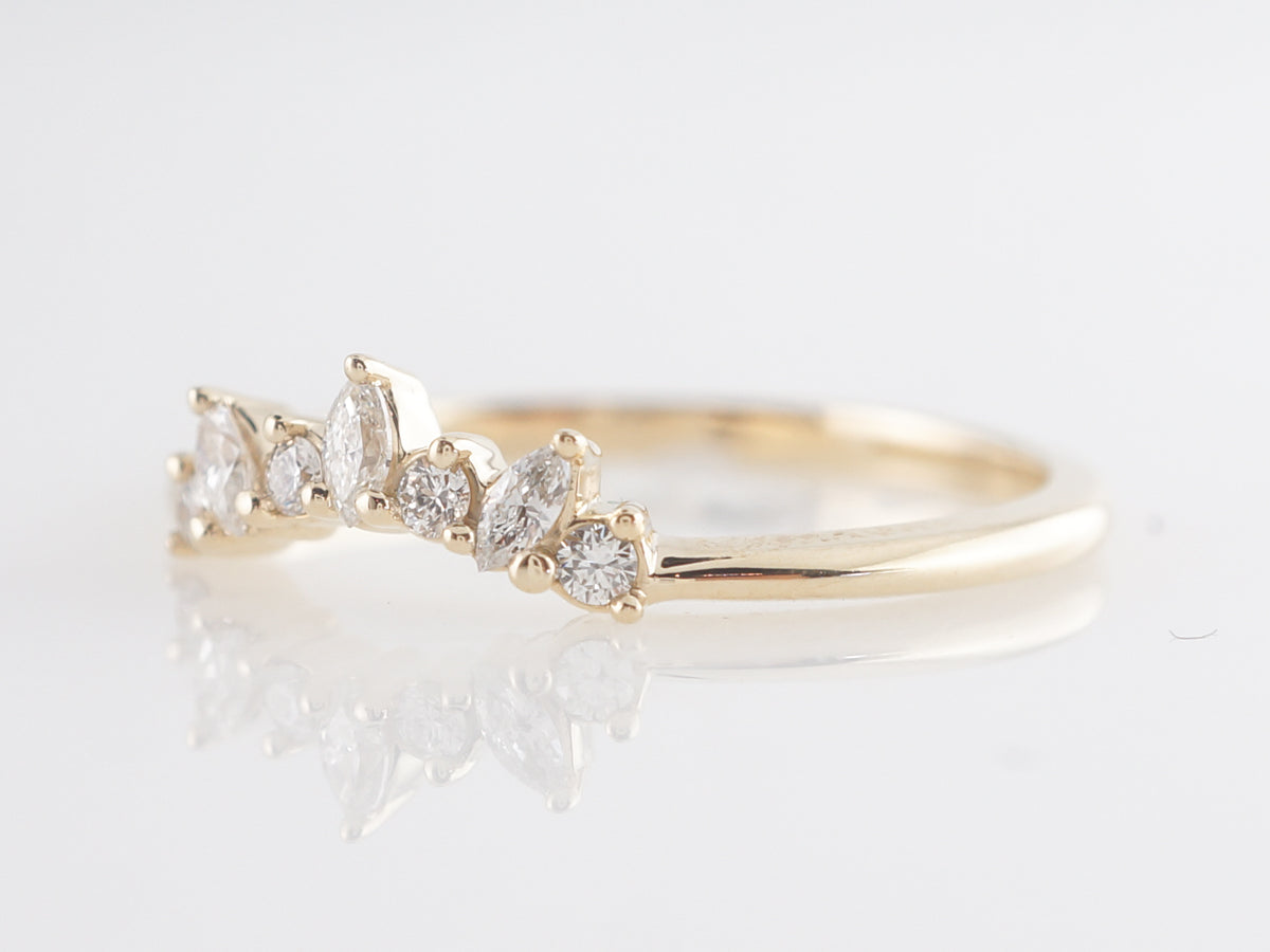 .16 Curved Diamond Wedding Band in 14k Yellow Gold. This modern tiara wedding band features .15 carats of round and marquise cut diamonds and is finished in 14 karat yellow gold. The diamonds are bead set and neatly curved to allow an engagement ring to snuggle up for a nice pair. This could also be worn on the end of a stack of bands for a nice shape to cap it off.
