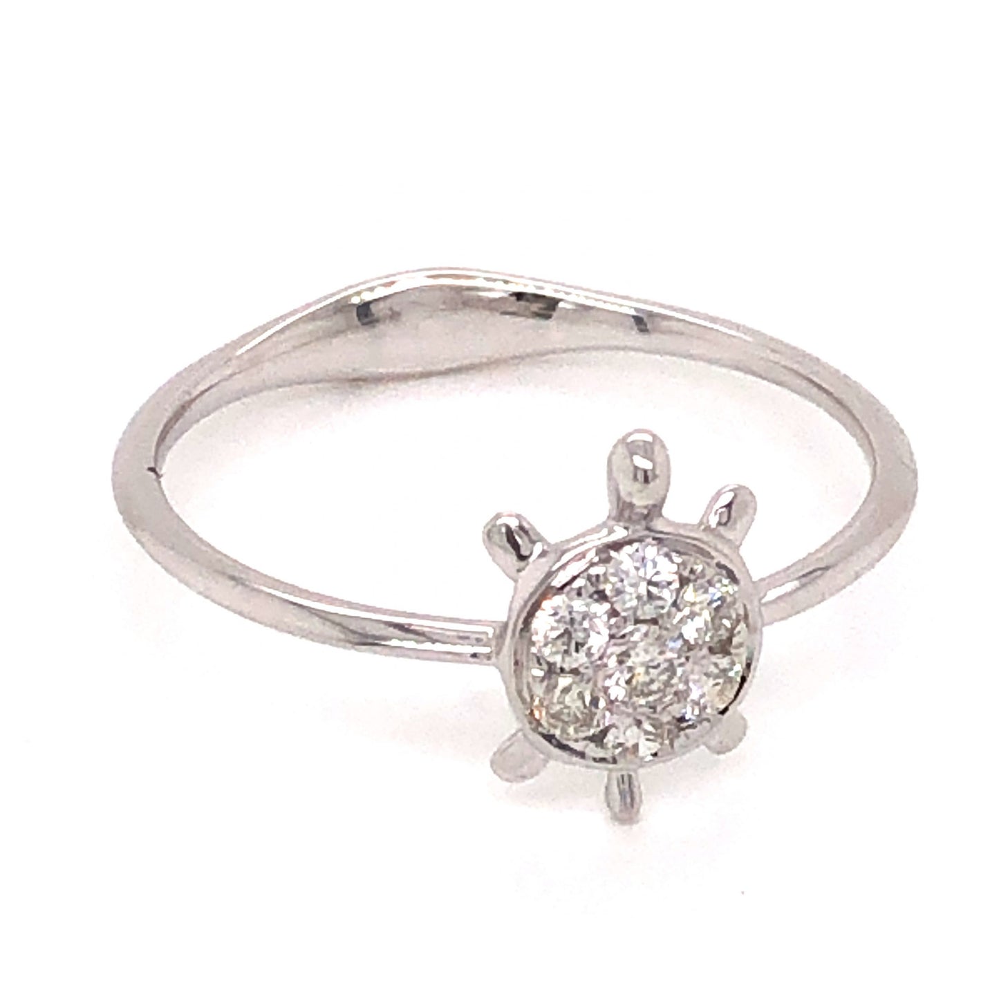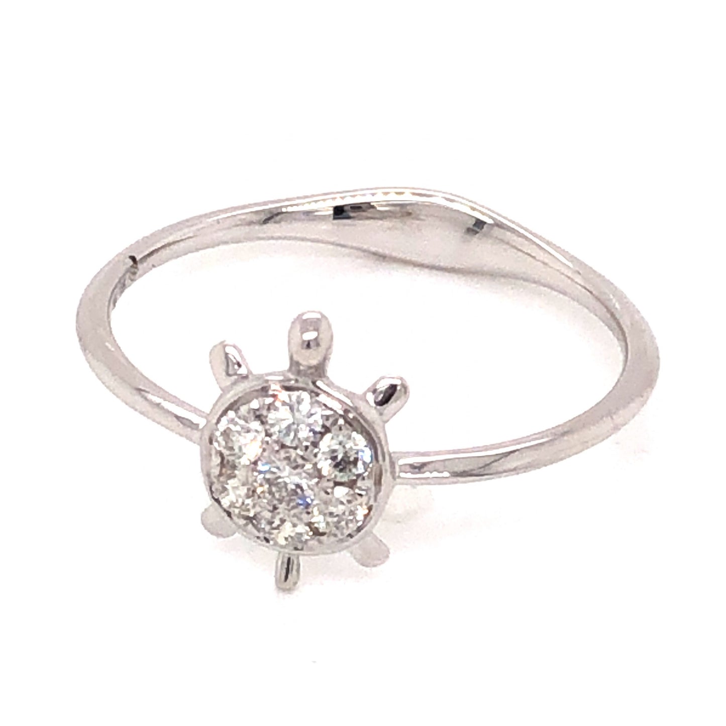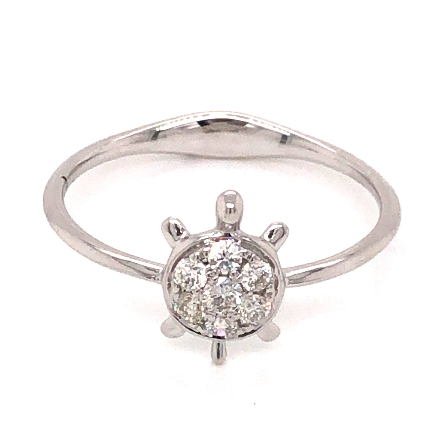 .16 Diamond Turtle Stacking Ring in 18k White Gold. This fashionable stacking ring features .16 carats of sparkling diamonds finished in polished 18 karat white gold. Seven (7) .0228 carat diamonds are set at the head of the ring. The mounting detail of the ring is shaped like a turtle, with the diamonds set in surface prongs on the shell of the body. Finished on a thin, 18k white gold band, this stylish stacking ring would make a one of a kind gift for any diamond lover in your life!
