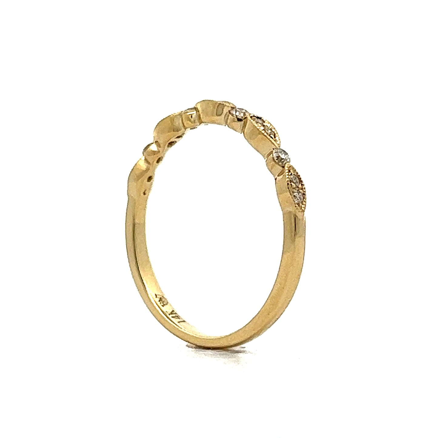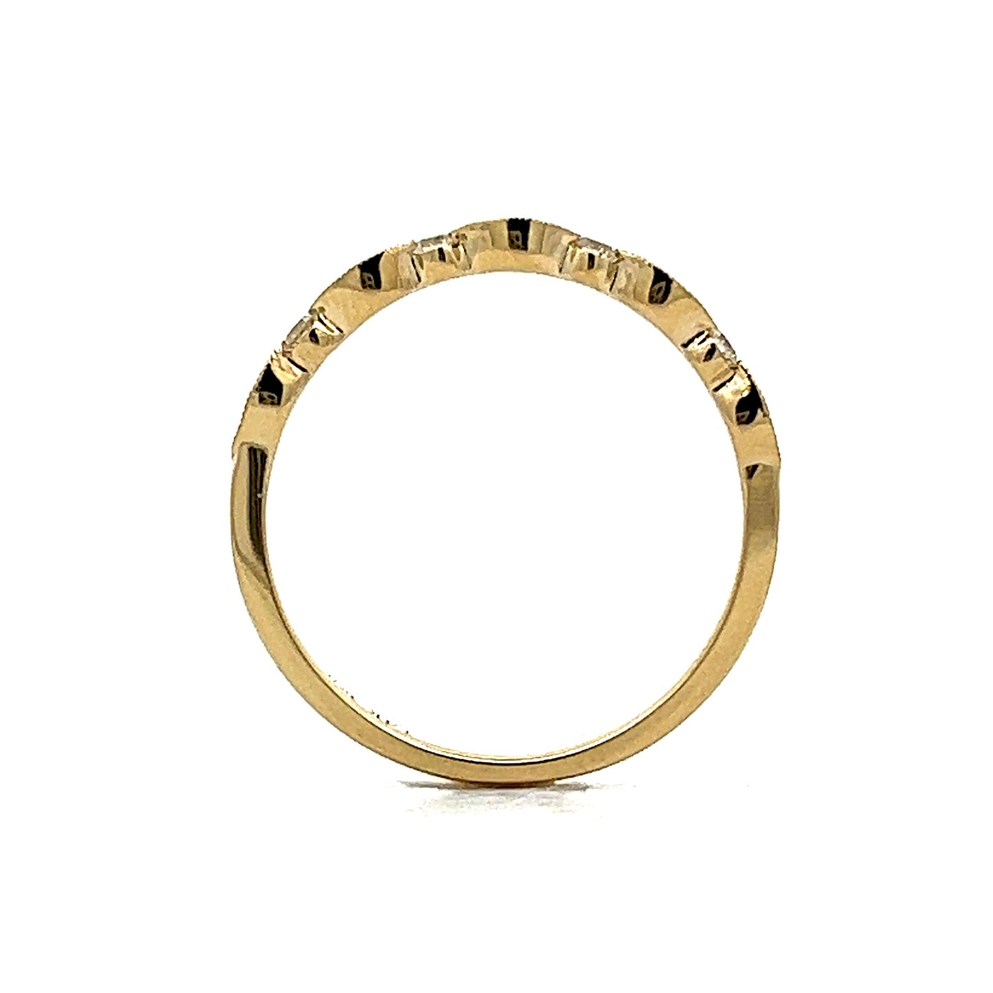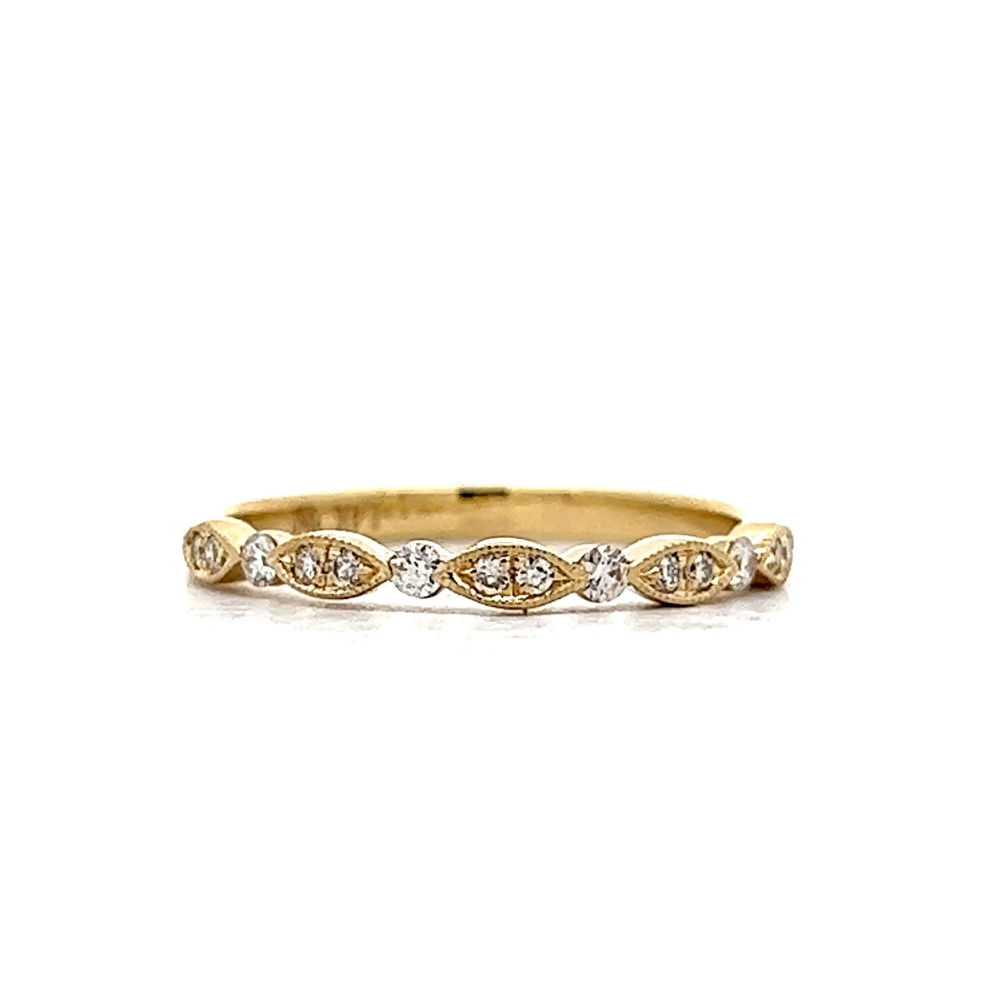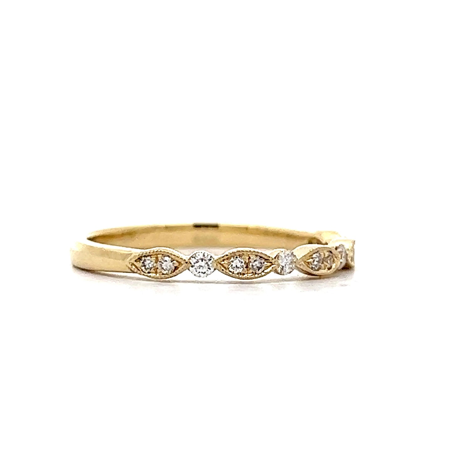 .16 Diamond Wedding Band in 14k Yellow Gold. This modern wedding band features .16 carats of round brilliant cut diamond set across the top of the band in 14 karat yellow gold. The diamonds give the ring a gorgeous geometric feel and the slight shared prongs give some texture and dimension. This ring will pair nicely with an engagement ring or in a stack of bands.