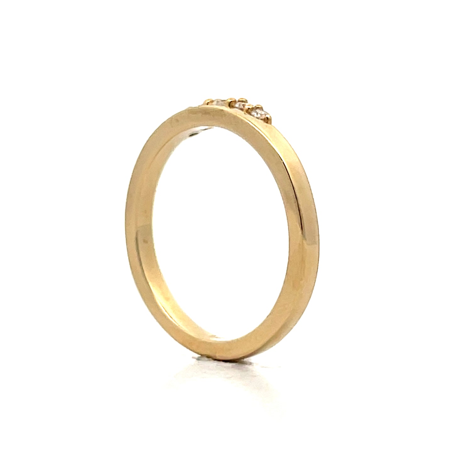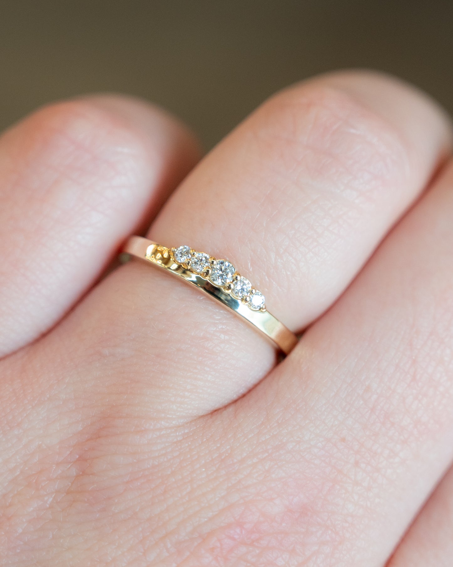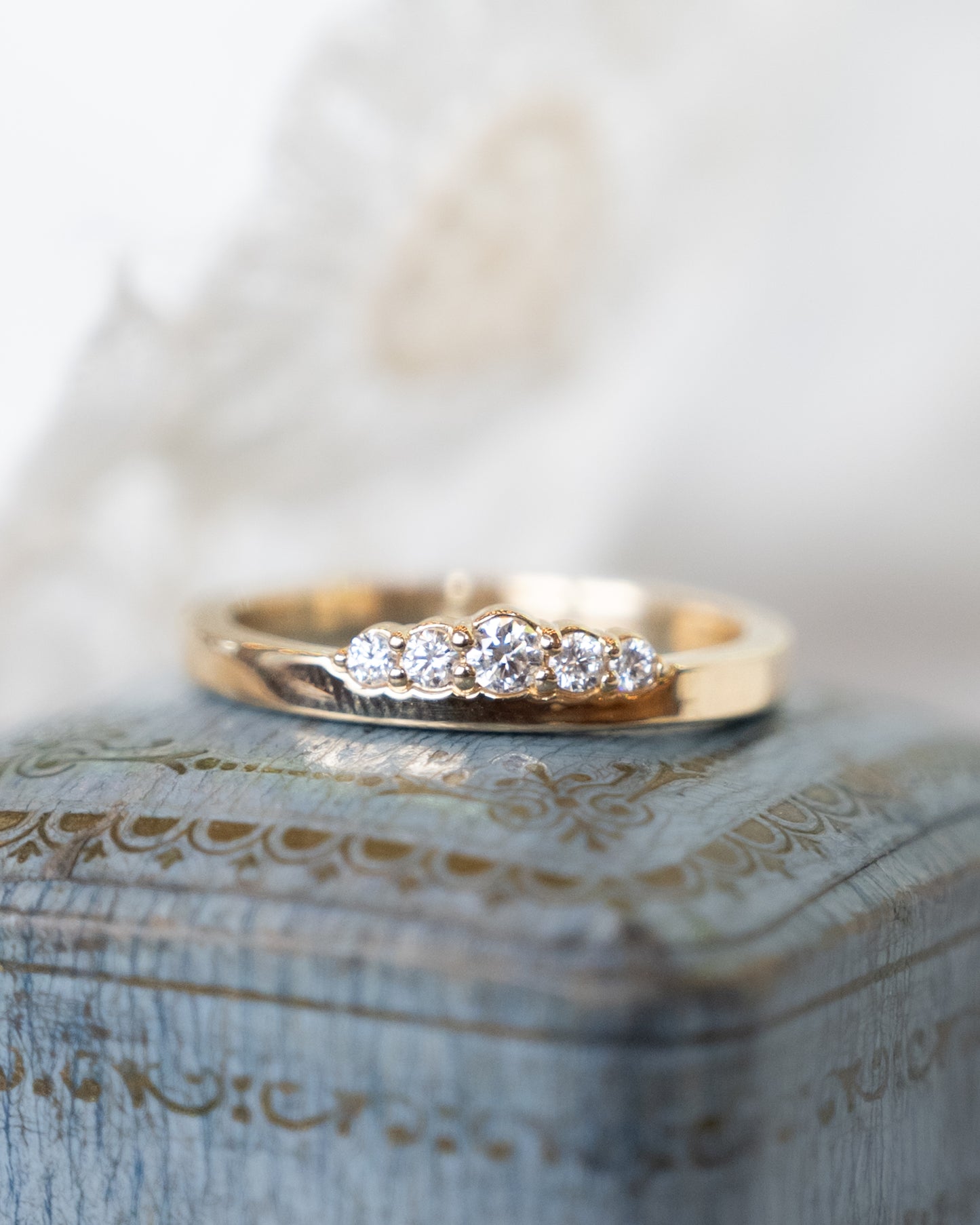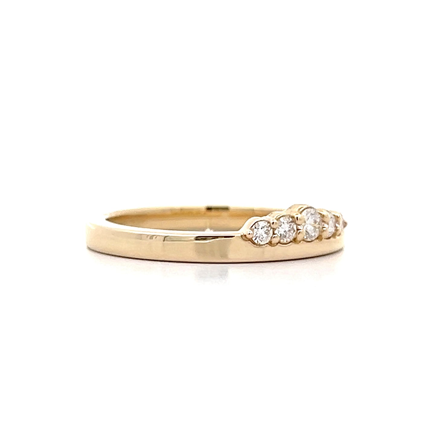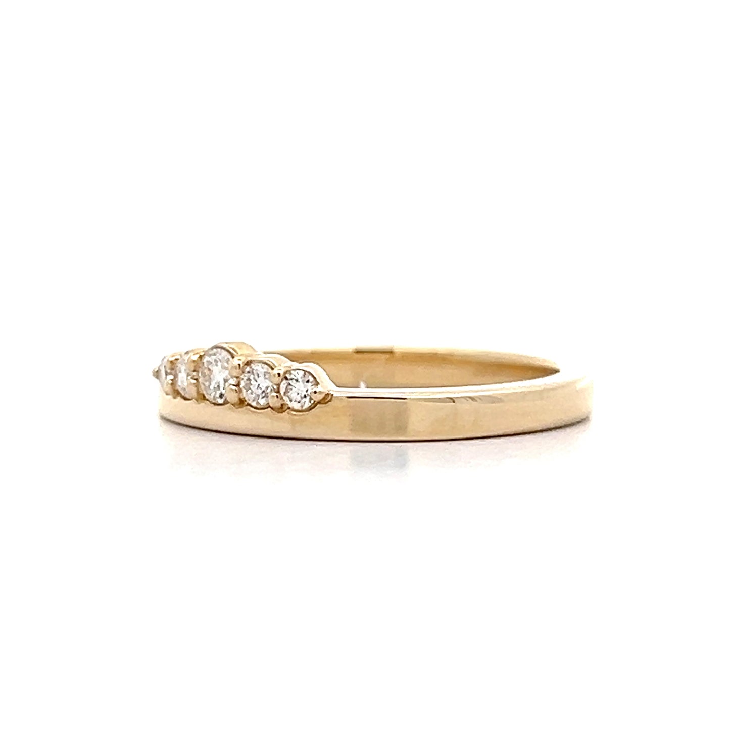 This five stone wedding band is made from 14 karat yellow gold with a total of .16 carats of round brilliant cut diamonds. The ring has H/I color and SI1 clarity diamonds that add sparkle to your daily wear. The design features two 2.0 mm accent diamonds (.03 carats each) in prong settings at the edges, plus three center diamonds (.06 carats each) arranged in a gradually increasing size pattern. The band has a flat edge and measures 2.2mm wide, making it good for stacking with other rings. The simple design lets the natural diamonds stand out while the unique arrangement of differently sized stones gives the ring its own special look.