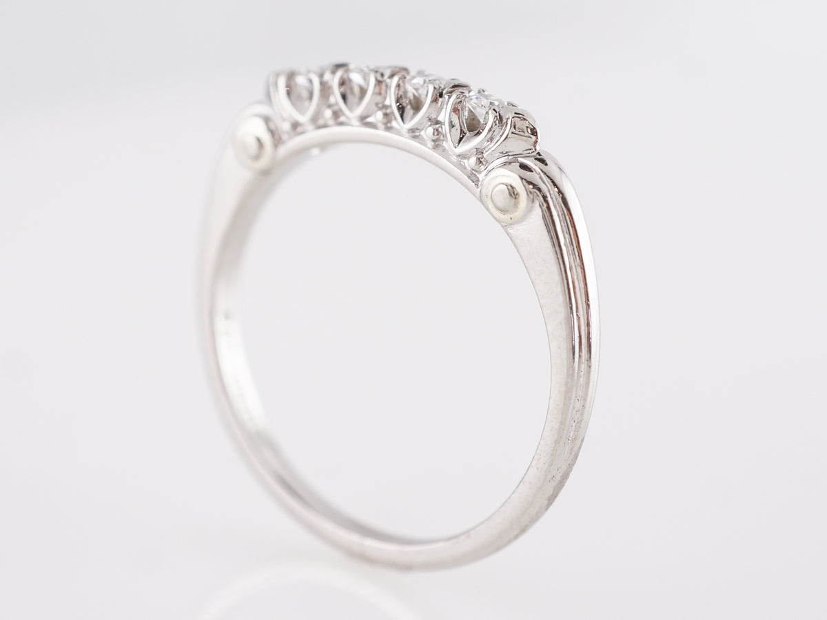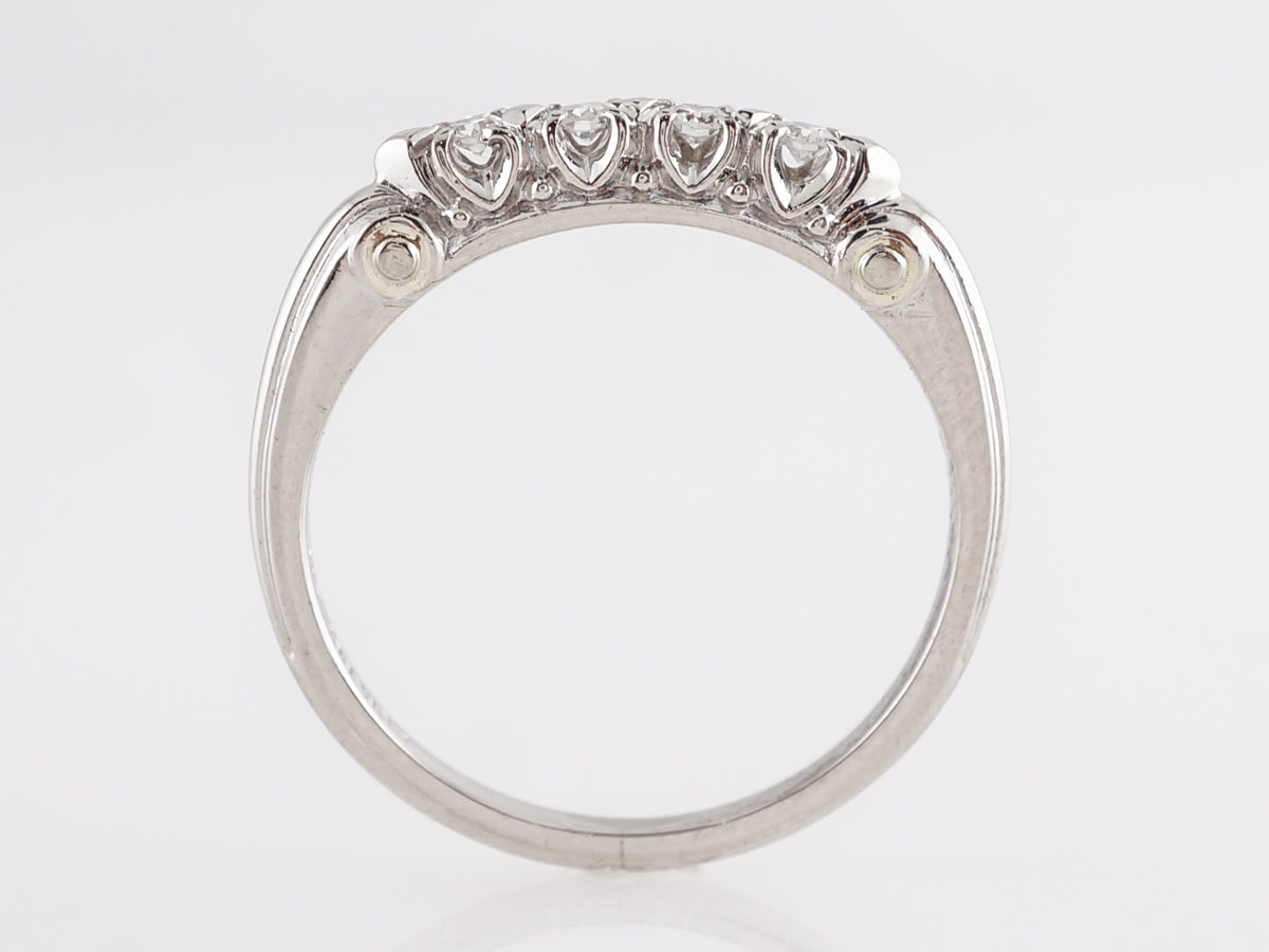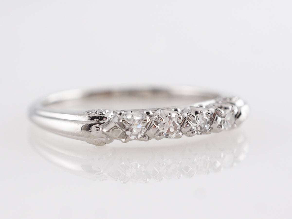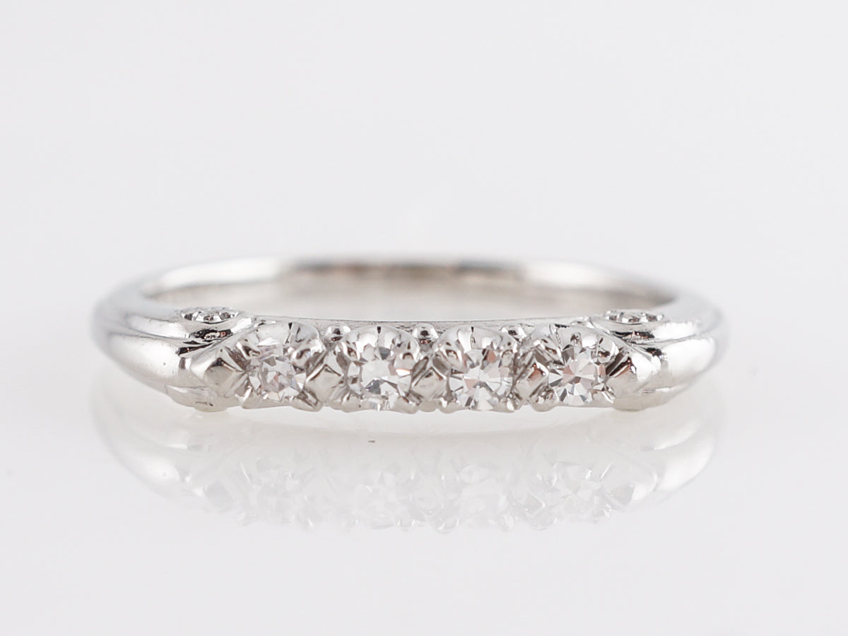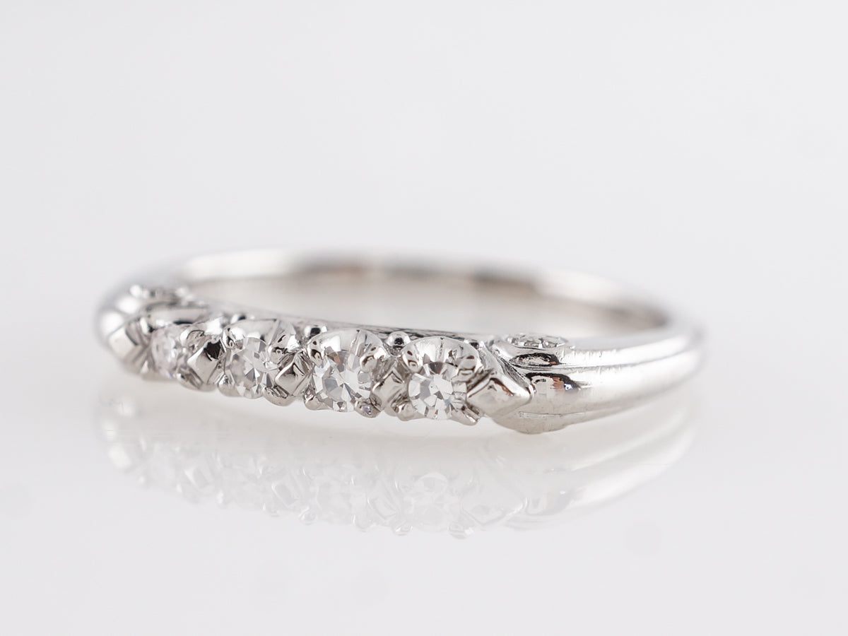 .16 Mid-Century Diamond Wedding Band in Platinum. This Mid-Century platinum and diamond wedding band a beautiful example of vintage charm and craftsmanship. The band is set with four (4) round cut diamonds across the bridge of the finger with a total weight .16 carats. There are additional white gold design elements on the shoulder of the band.
