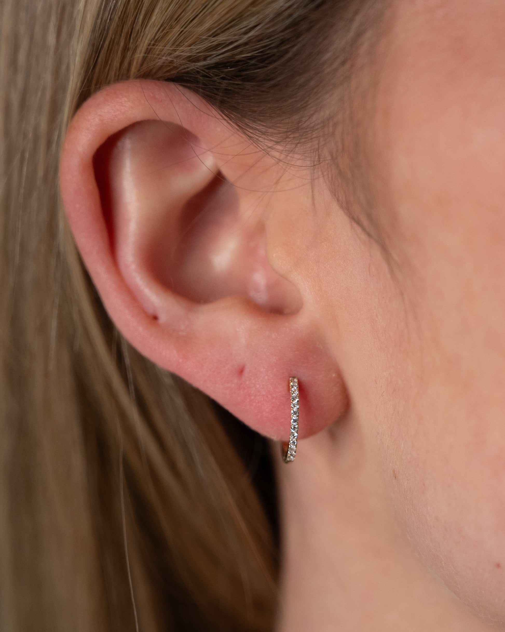 The round brilliant cut maximizes light return, creating plenty of sparkle as you move. At 13mm in length, these hoops sit close to the earlobe—large enough to make an impact but small enough for everyday wear.