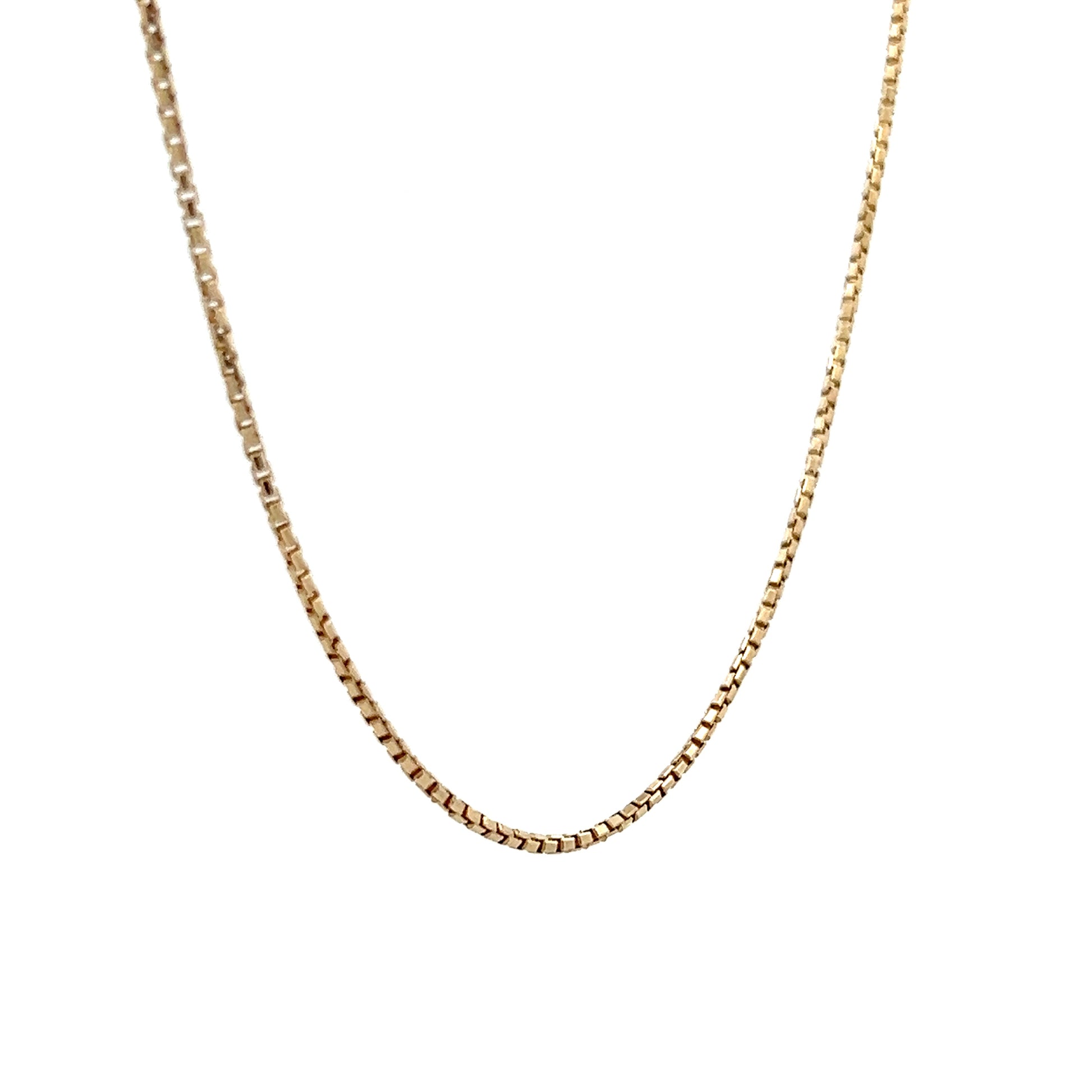 This 14K yellow gold box chain necklace measures 16 inches long and 1.15mm wide with a lobster clasp closure. The box chain style features square links that connect to create a smooth, uniform appearance along the entire length. At 1.15mm wide, the chain is delicate but durable enough for daily wear.