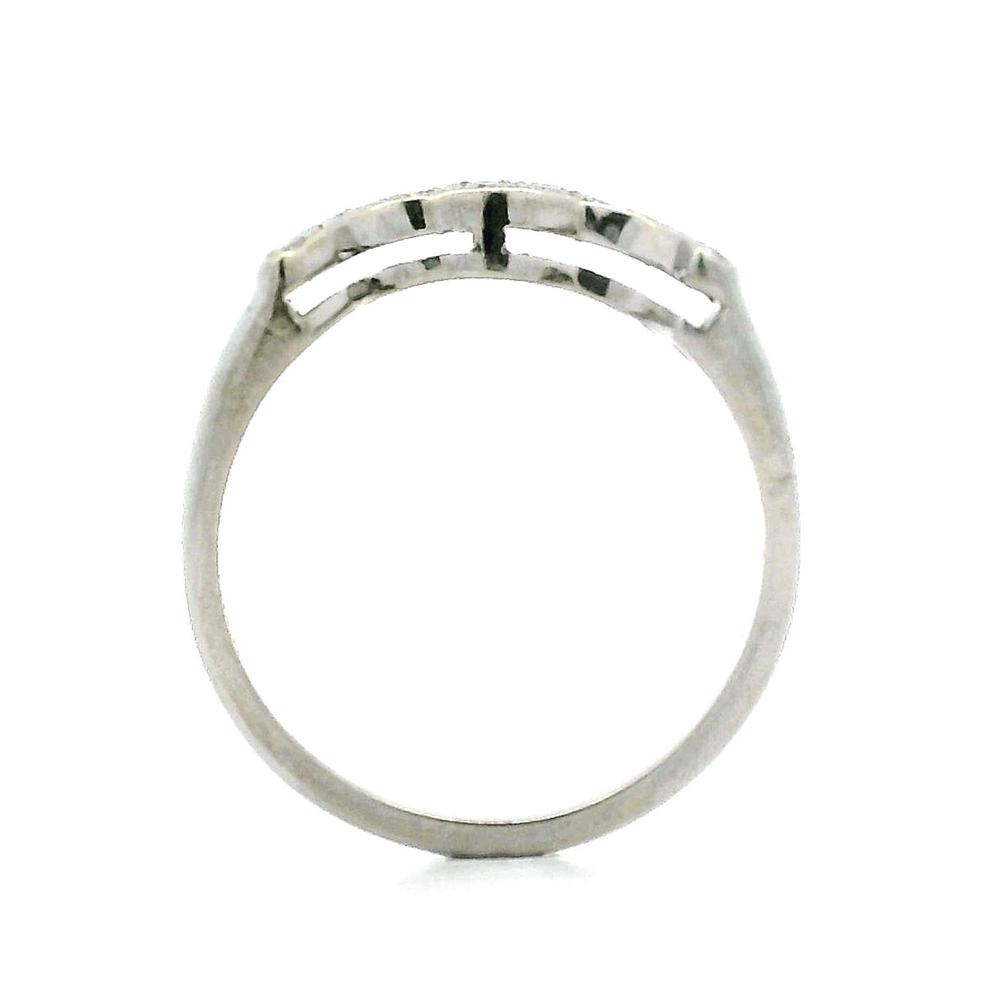 This 14 karat white gold wedding band features a contoured shape with a scalloped edge design and channel-set single cut diamonds totaling .16 carats. The diamonds grade SI1 to SI2 clarity with H color, and their round brilliant cut creates consistent light reflection across the band. The channel setting secures each diamond within the metal framework while keeping the stones flush with the band's surface.
