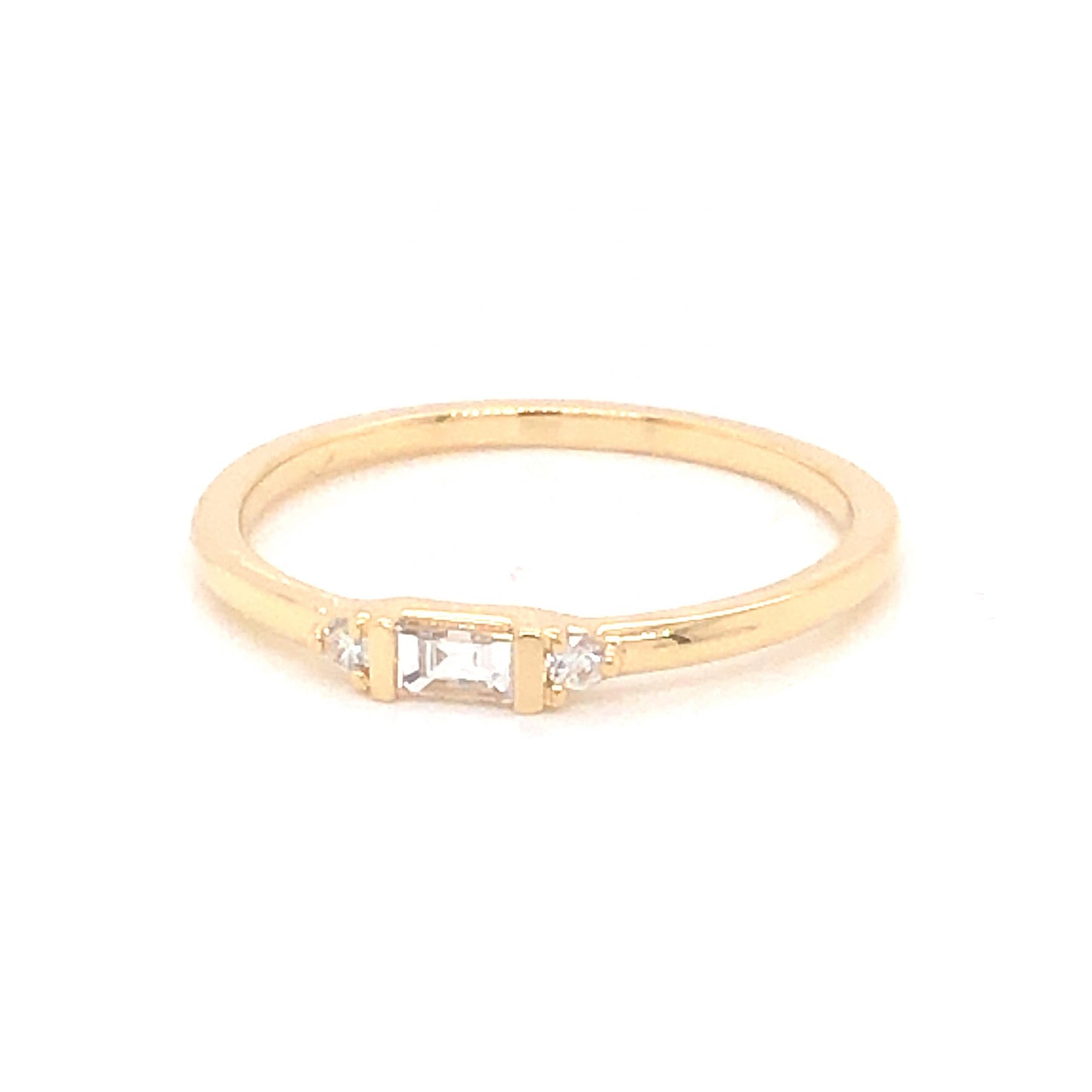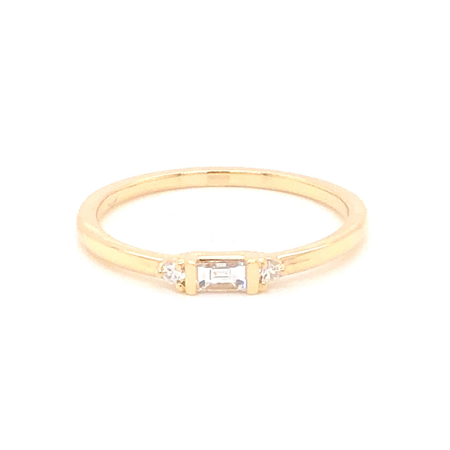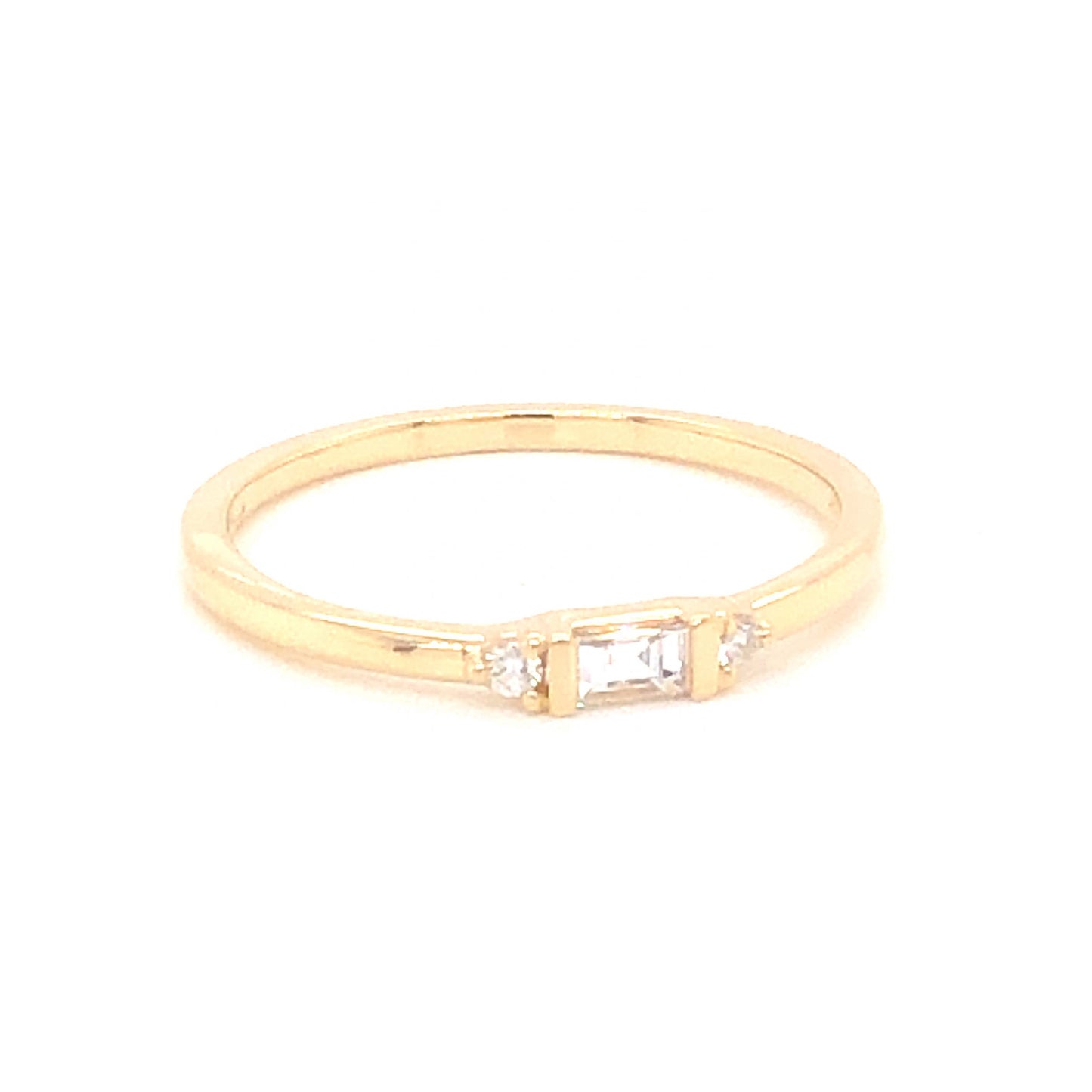 .17 Baguette Diamond Wedding Band in 14k Yellow Gold. This modern wedding / stacking band features .17 carats of diamonds finished in high polished 14 karat yellow gold. The primary diamond is near colorless and weighs .13 carats. The square cut primary diamond is channel bar set and flanked by two (2) .02 carat accent diamonds. The accent diamonds are prong set on the shoulders of the band. The band measures 2.57mm wide and reaches 1.97mm above the finger. A small inscription of “14k” is stamped inside the ring, ensuring it is 14 karat yellow gold.