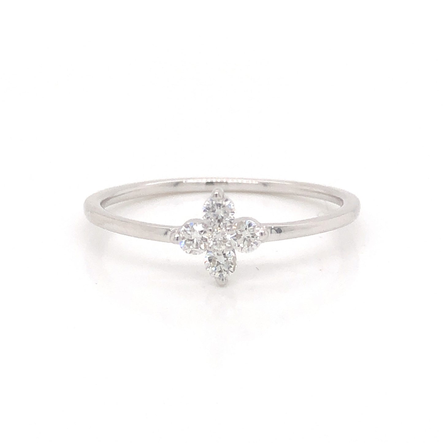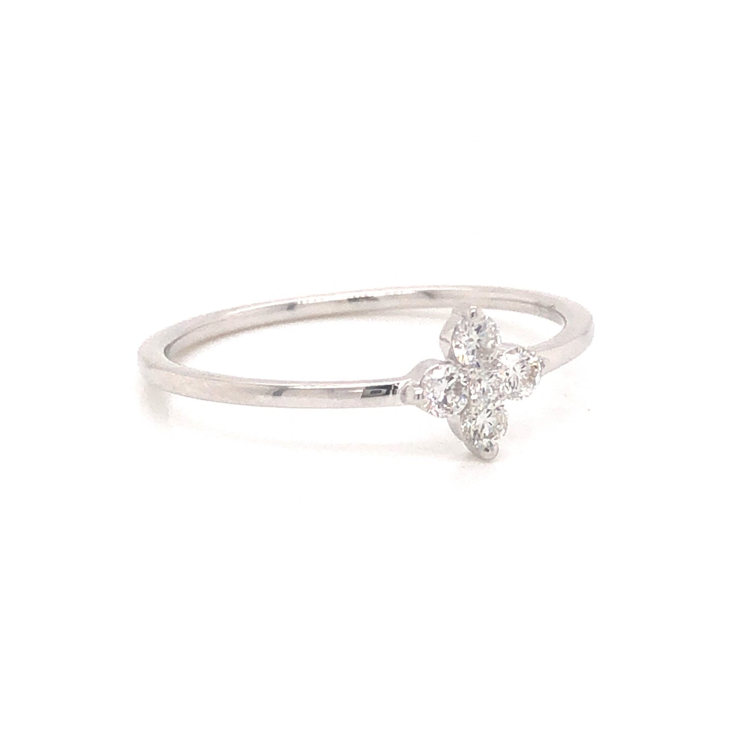 This beautiful floret stacking ring features .17 carats of diamonds set in shimmering 14 karat white gold. One (1) .01 carat diamond is set in the center of four (4) .04 carat diamonds. The diamonds are clustered together into a small flower shape, set on a petite 14K white gold band. This ring has an elegance and sleek design. A perfect gift idea for any loved one!