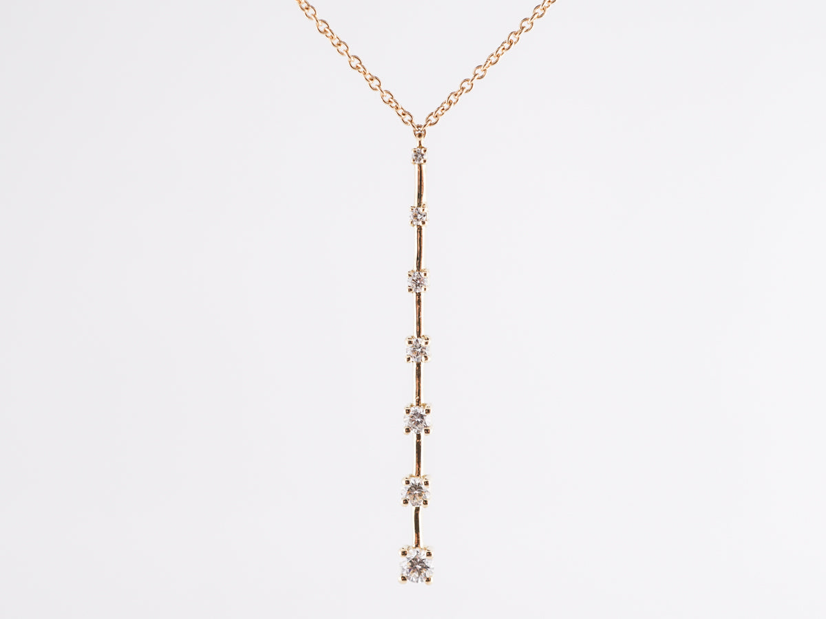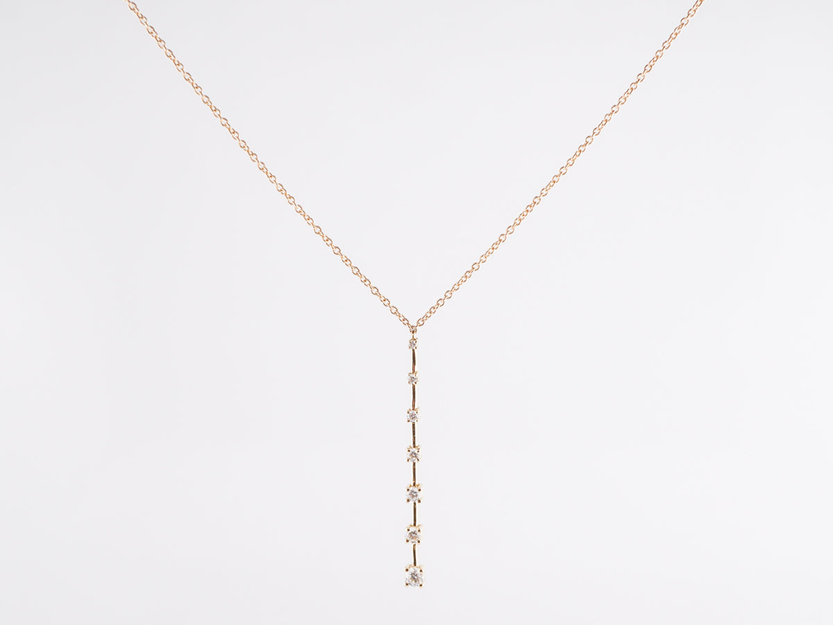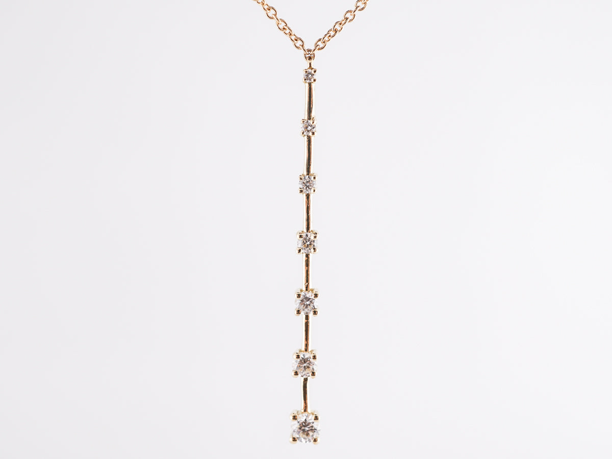 .17 Diamond Pendant Necklace in 18K Yellow Gold. This graceful, 18” stick pendant necklace features seventeen diamonds in 18k yellow gold. Prong set and structured, this statement necklace is versatile and will complement a plunging neckline or a flowy summer dress for a timeless look.