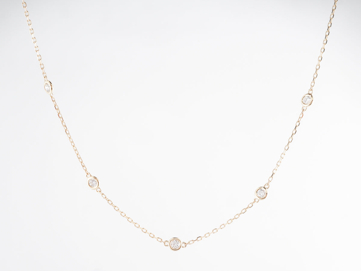 17 Inch Necklace w/ Diamonds in 14k Yellow Gold. This delicate chain necklace features .18 carats of round brilliant cut diamonds set in 14 karat yellow gold. The necklace is quite versatile and has rings to connect at 16 inches and 17 inches depending on how you would like it to hang. The diamonds are neatly spaced 1 inch apart and add a hint of sparkle. This would be a perfect necklace to layer with a longer chain for a stylish look.