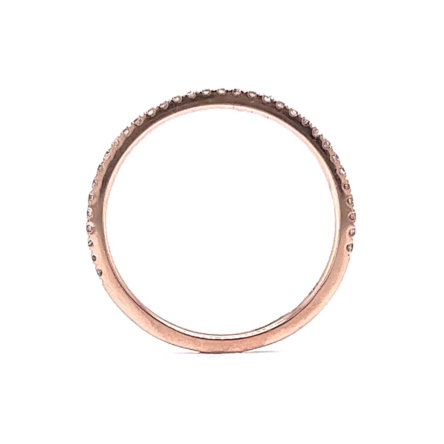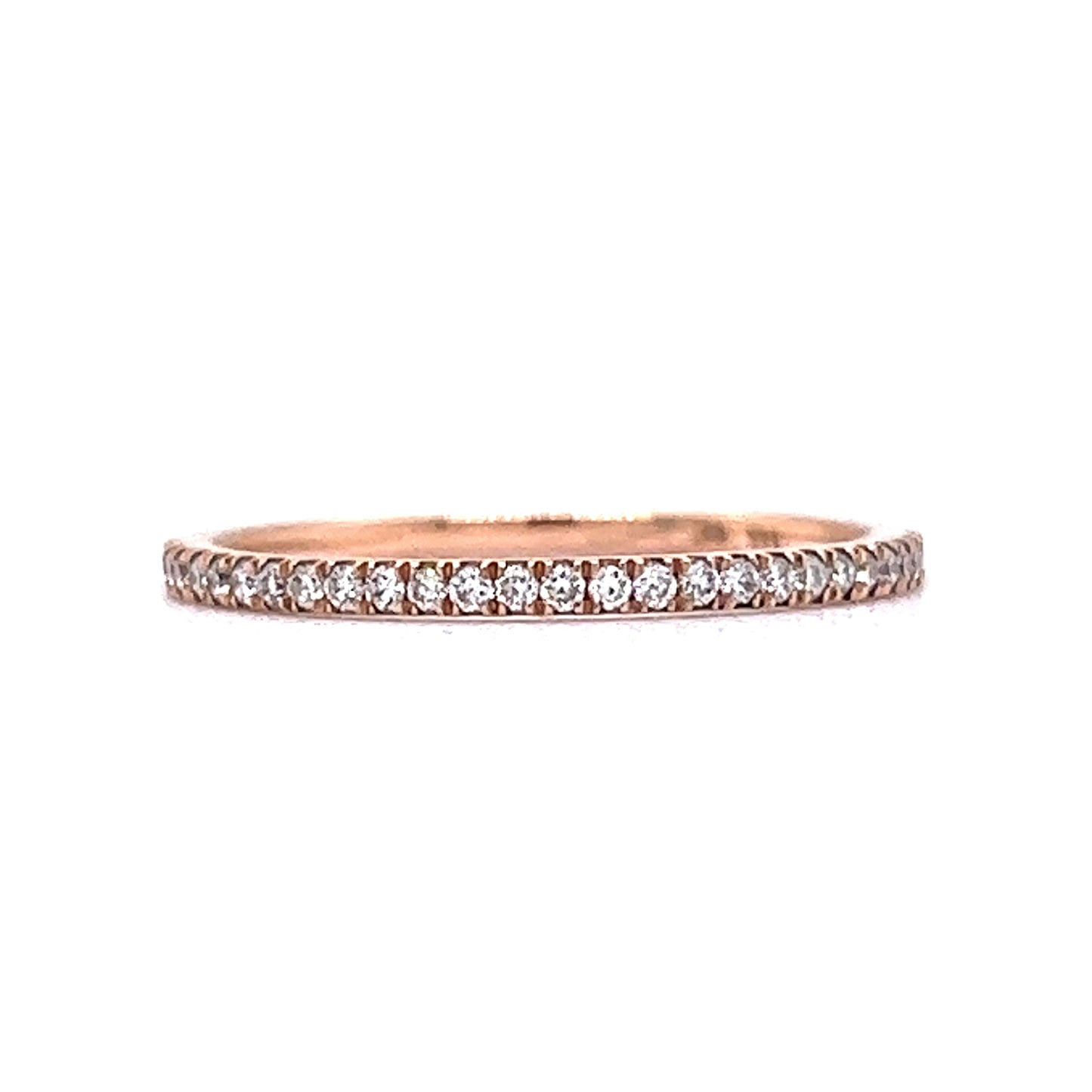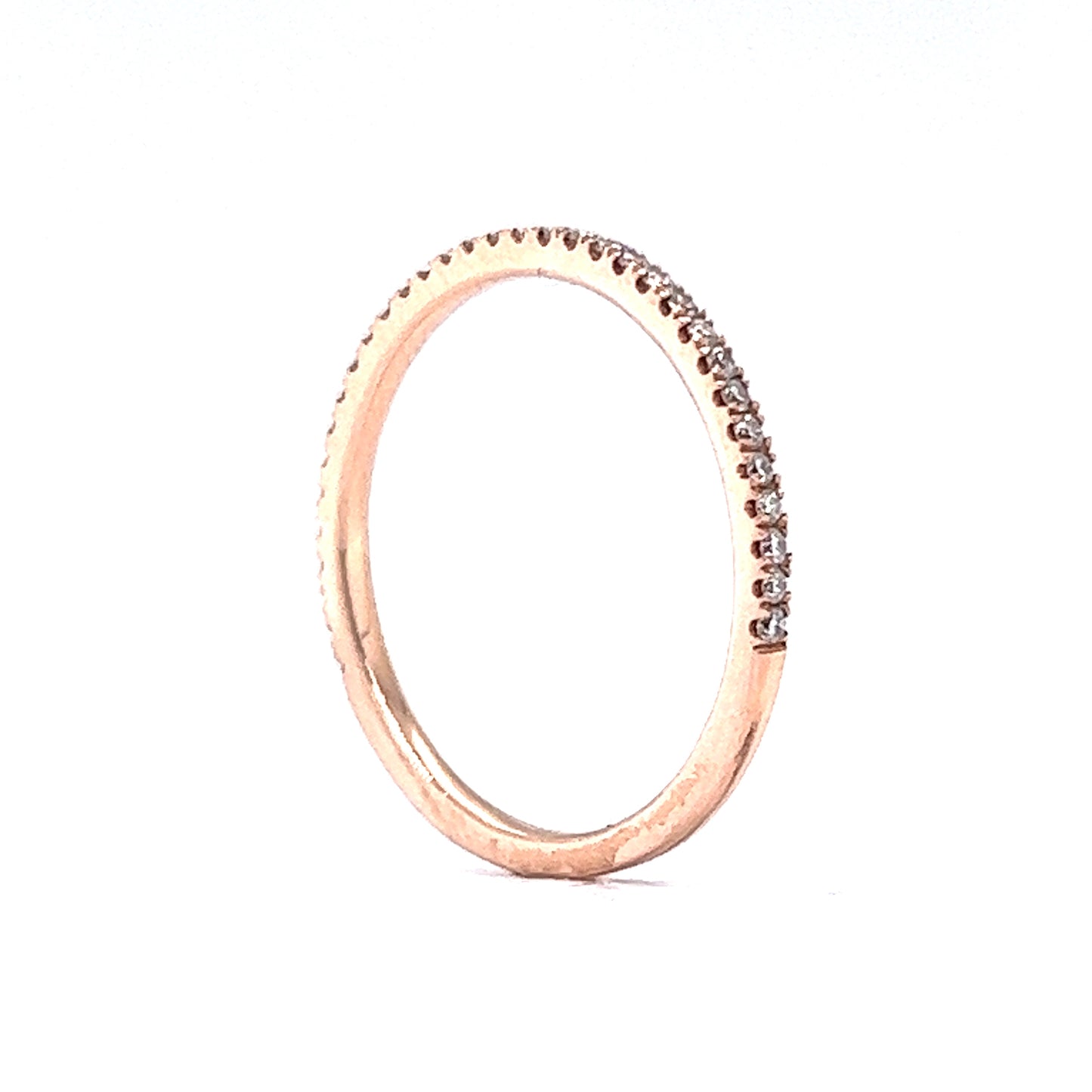 .17 Thin Half-Eternity Diamond Wedding Band in 14k Rose Gold. This petite and chic wedding band features .17 carats of sparkling diamonds finished in 14 karat rose gold. Twenty-seven (27) .00515 carat near colorless diamonds are set in fishtail settings on the front half of the band. Finished in polished rose gold, this wedding ring will look romantic paired with an engagement ring or can be worn as an everyday stacking band.
