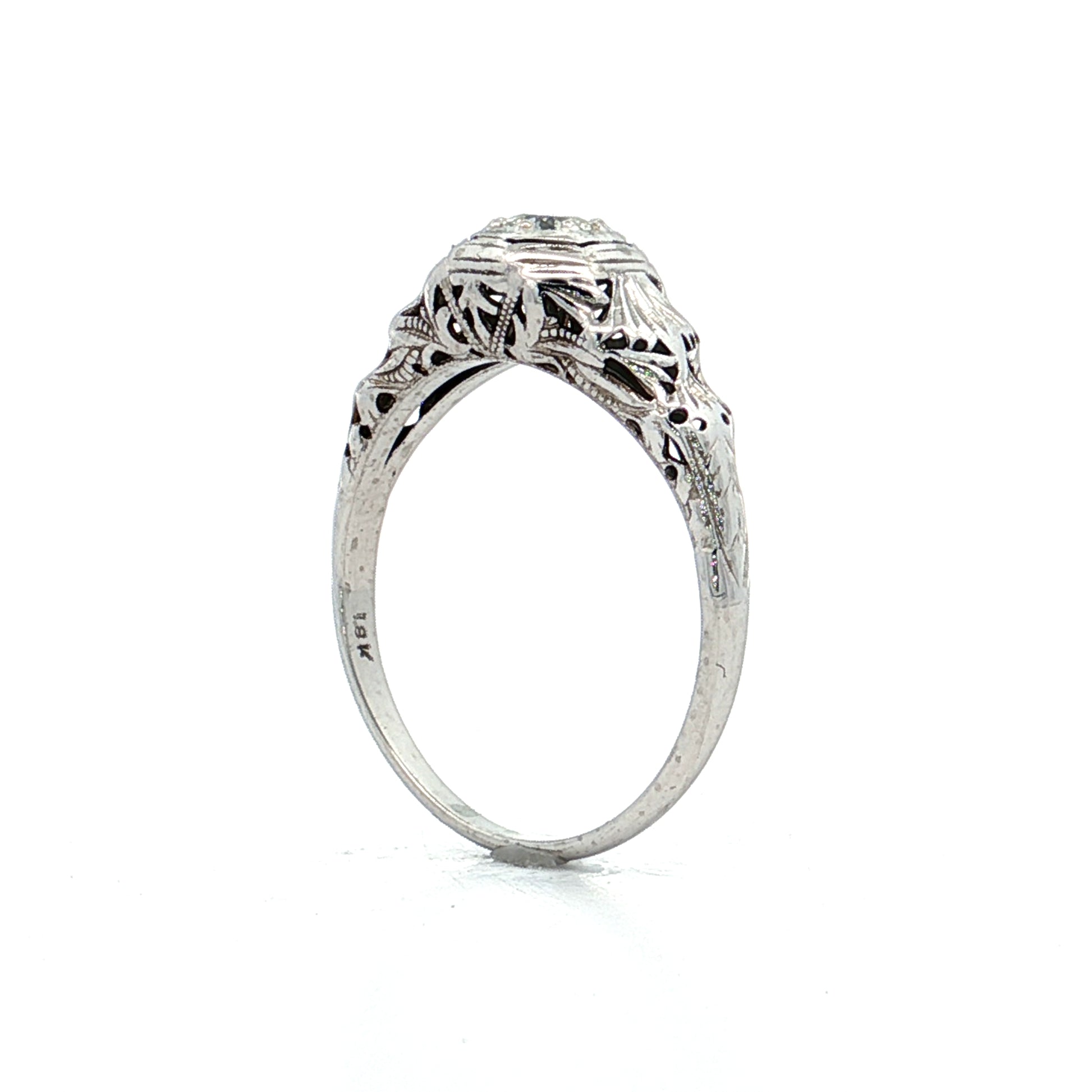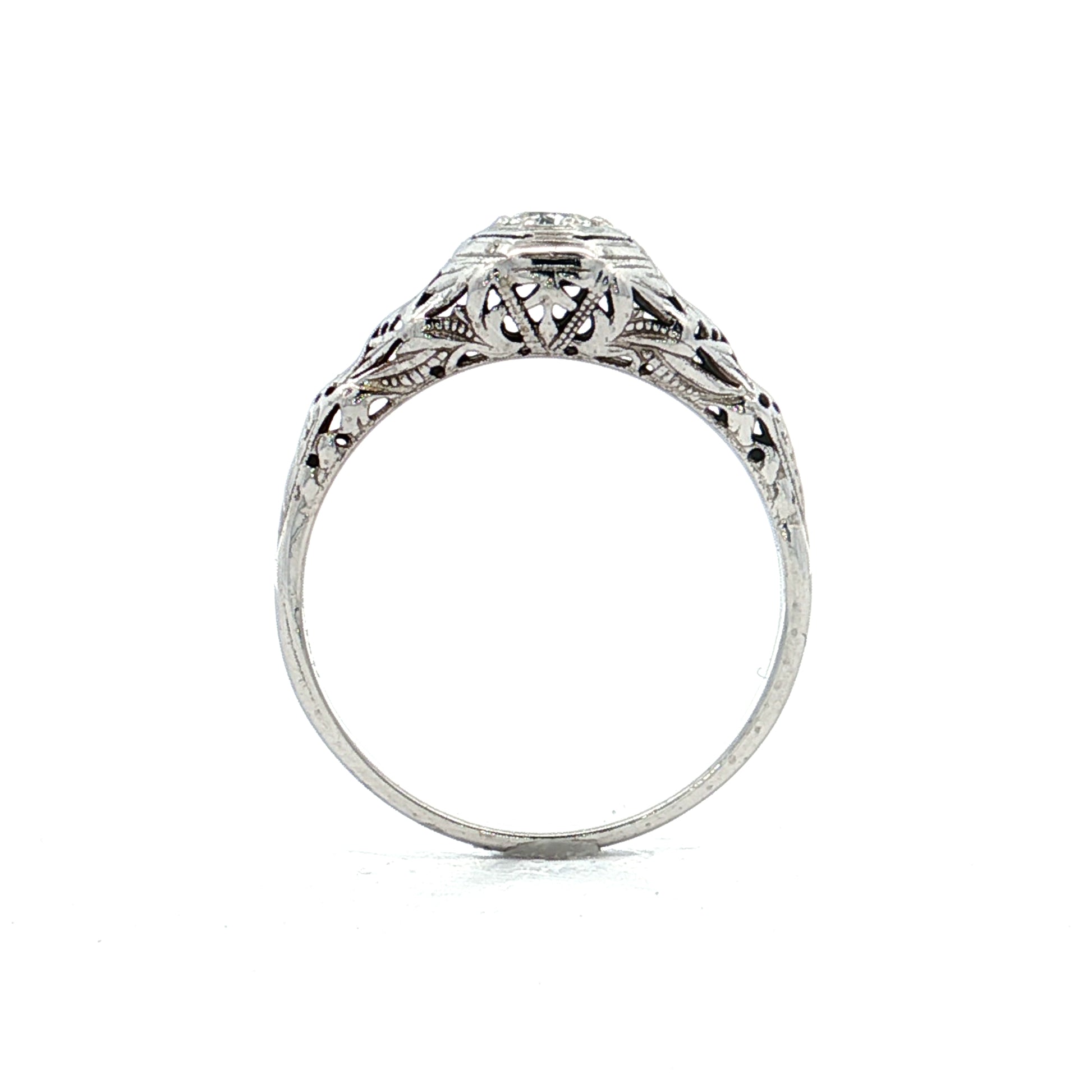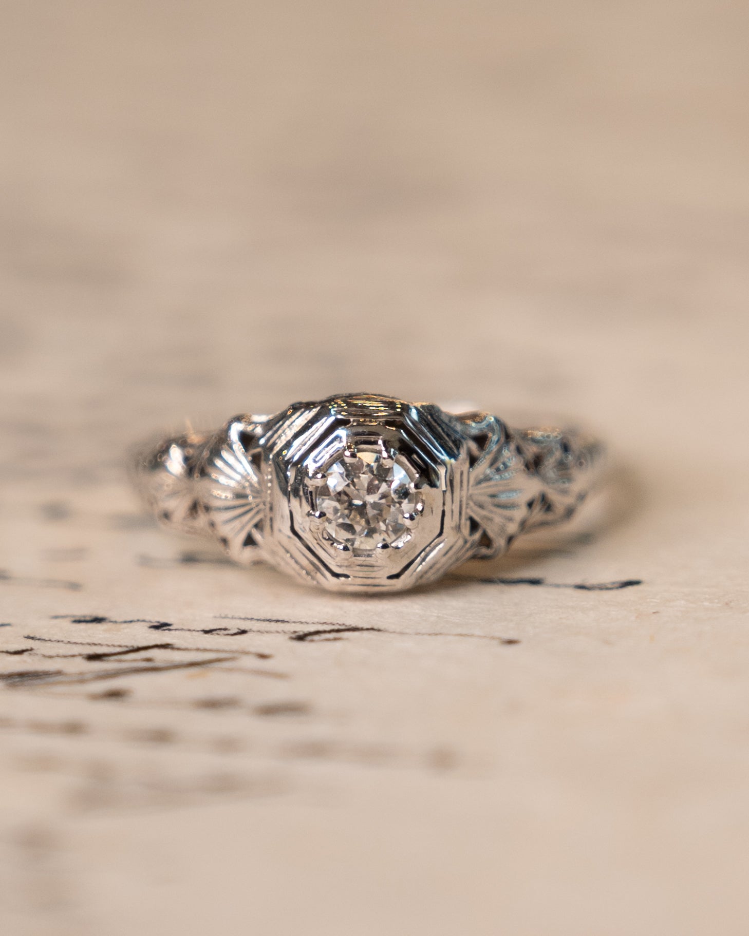 This Art Deco solitaire engagement ring features a .17 carat old European cut diamond set in 18 karat white gold with an octagonal head and filigree throughout the band. The diamond has VS2 clarity, which means it's clean to the naked eye, and G color, appearing white with no yellow tint visible when worn.