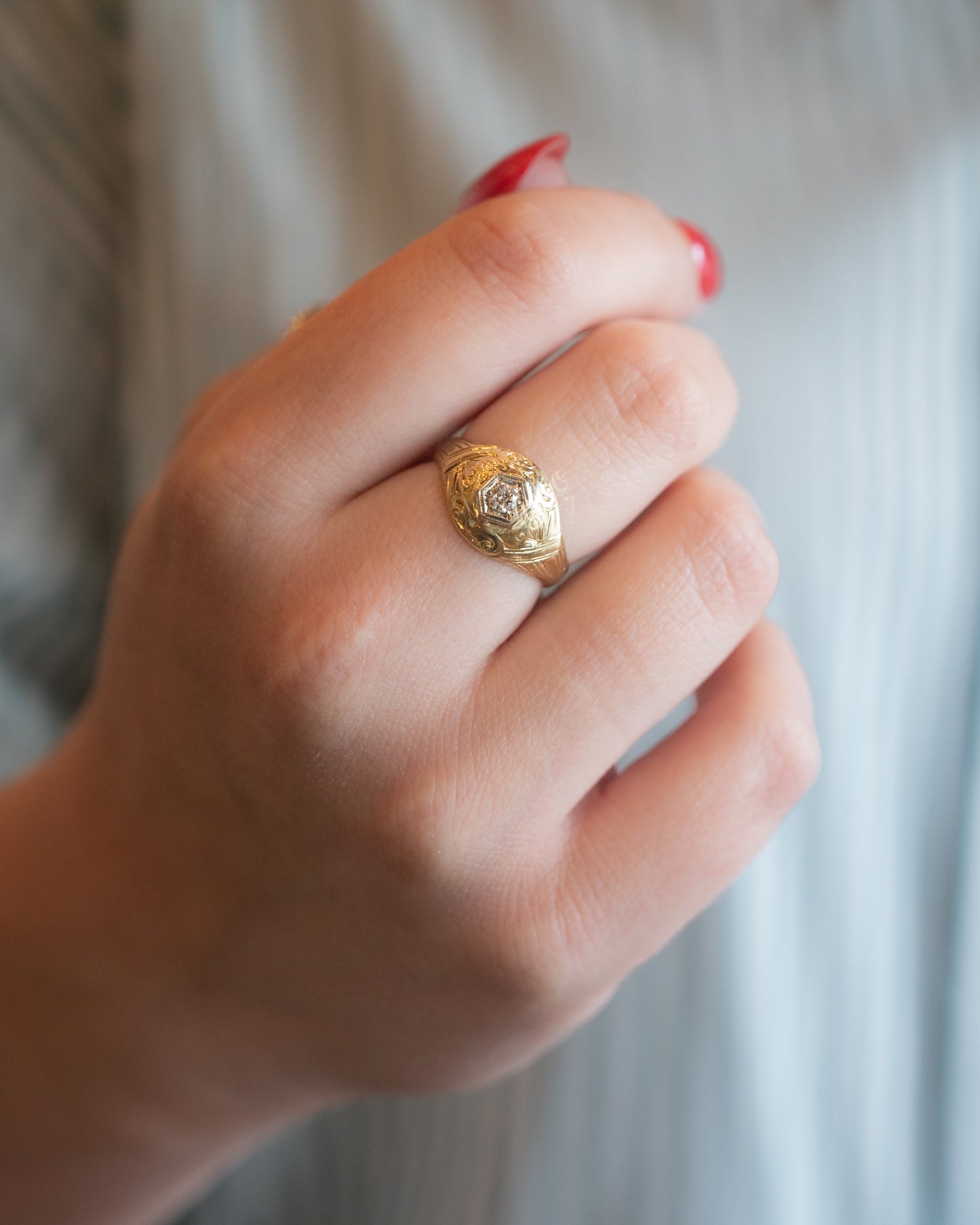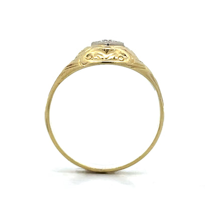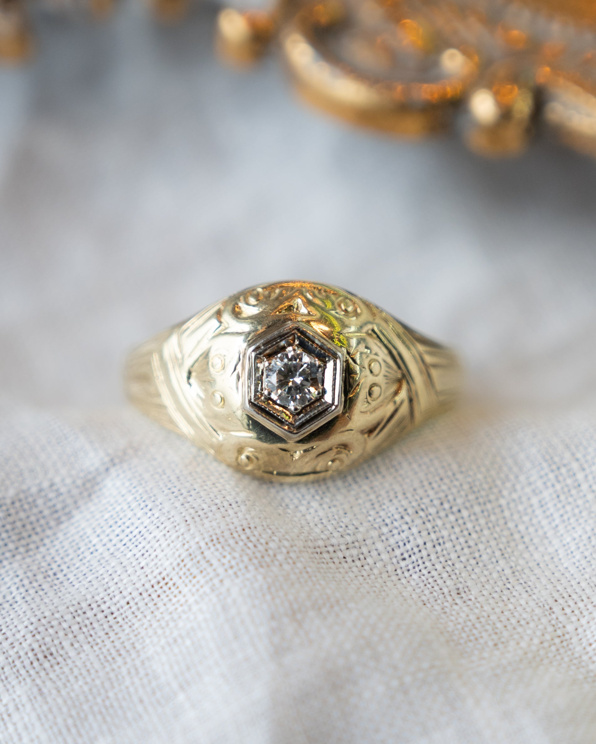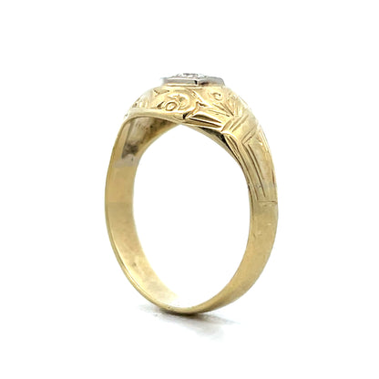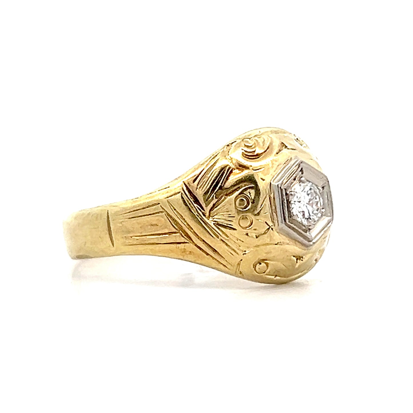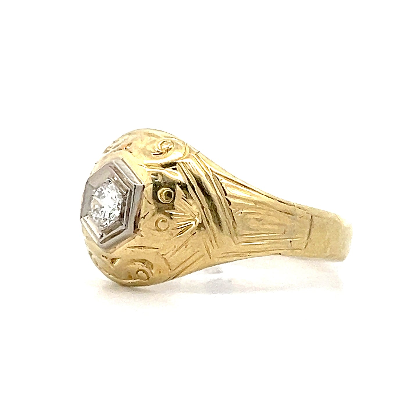 This Retro engagement ring features a .17 carat round brilliant cut diamond (I color, VS2 clarity) set in a unique hexagon-shaped bezel made of 14 karat yellow and white gold. The ring includes intricate decorative engraving throughout the band and mounting, creating texture and detail that reflects the bold design aesthetic of the Retro era. The combination of the geometric hexagon setting with ornate engraving work makes this piece stand out from traditional round solitaire settings, offering a distinctive alternative that captures the creative spirit of mid-20th century jewelry design.