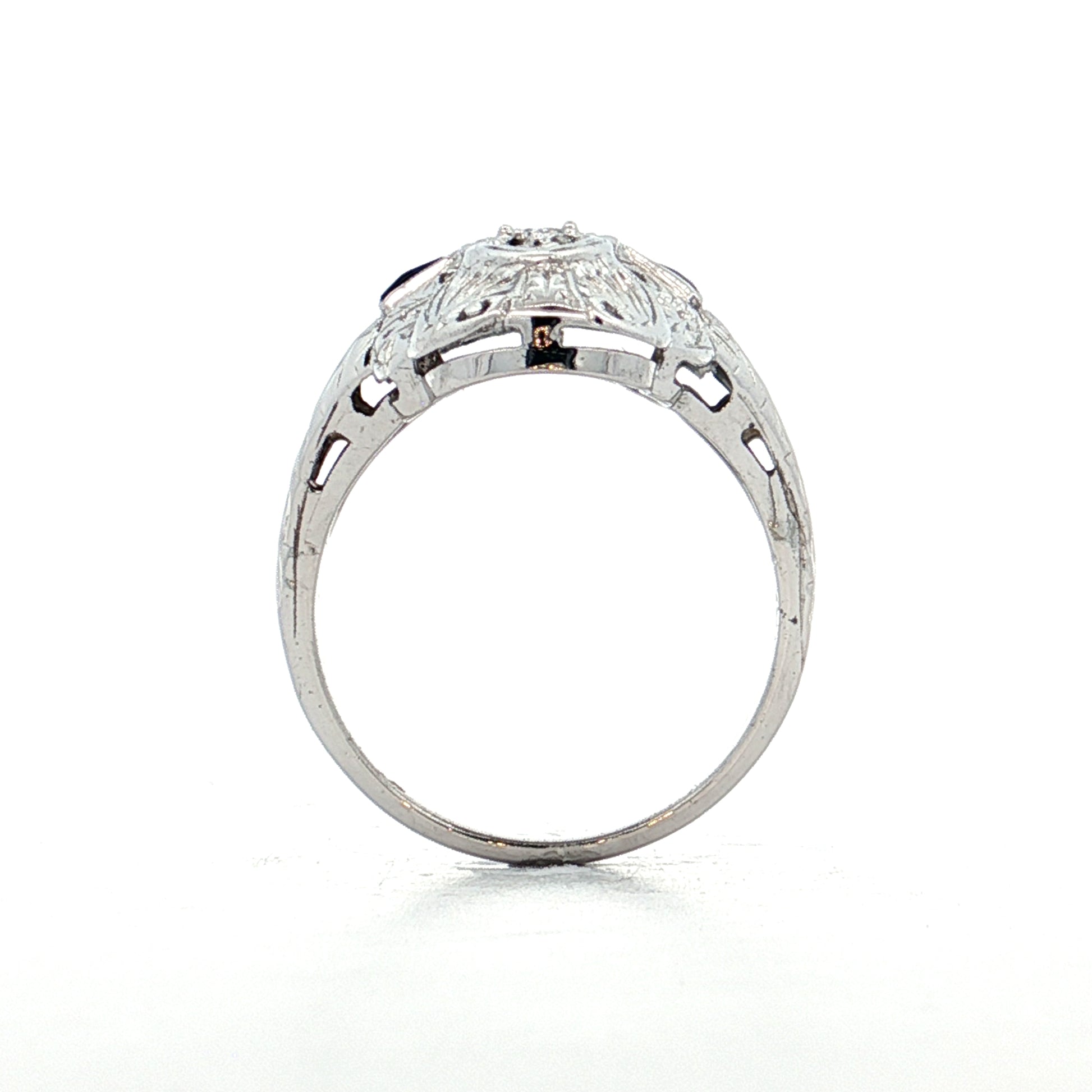 This Art Deco navette cocktail ring is made of 18 karat white gold with intricate filigree engravings throughout. Three round brilliant cut diamonds totaling .18 carats are set down the center in a square and heart-shaped design. Two triangle-cut blue sapphires weighing .07 carats each are set on either side of the diamonds. One sapphire shows abrasion from age and the ring is sold as-is.