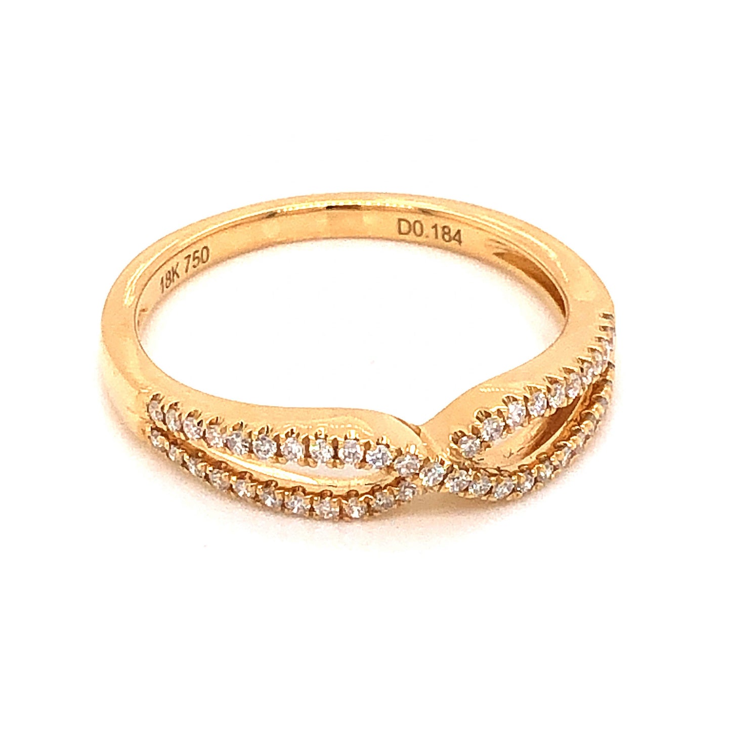 .18 Crossover Diamond Wedding Band in 18k Yellow Gold. This modern wedding ring features .18 carats of diamonds finished in 18 karat yellow gold. Forty-six (46) .0039 carat diamonds are set in French V split prongs. The band features a unique crossover design that adds some openwork detail to the head of the ring. Finished in polished 18 karat yellow gold, this wedding band can also be worn as a glittering stacking ring!