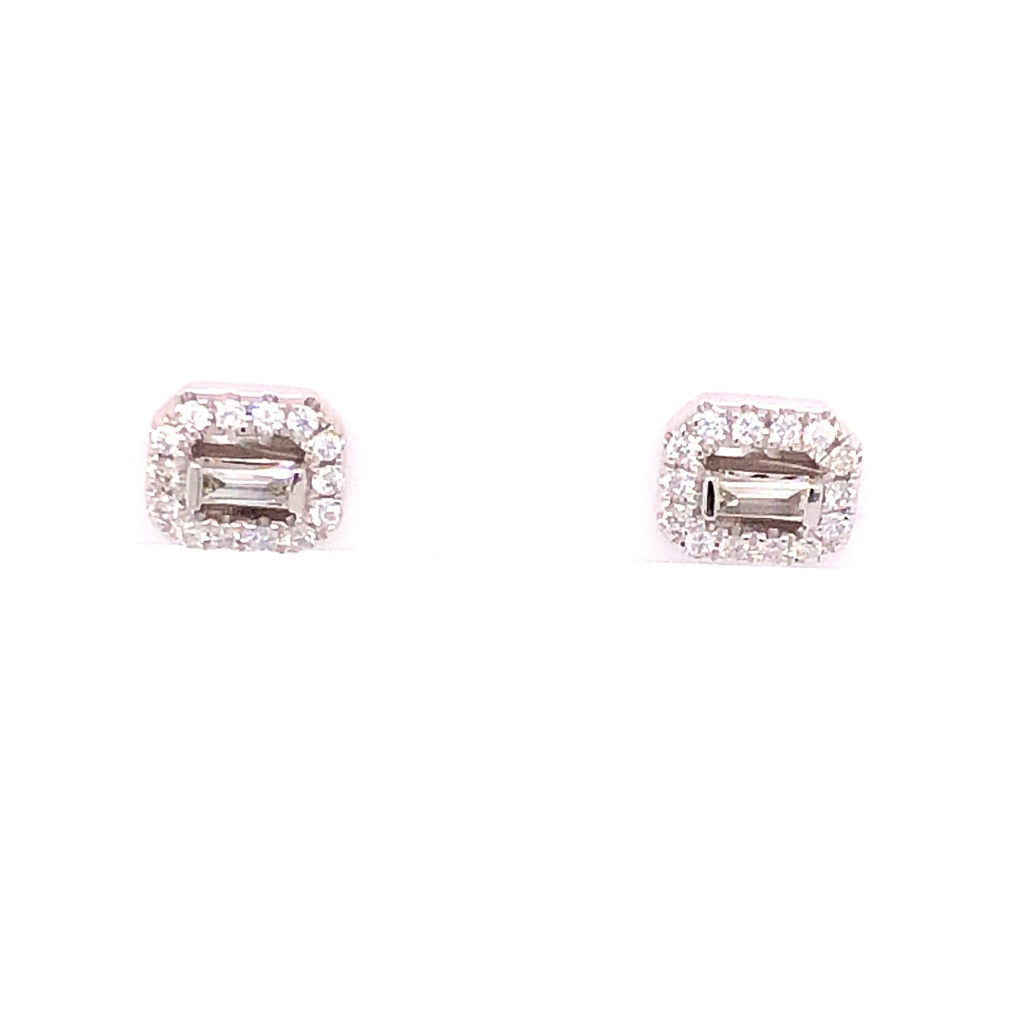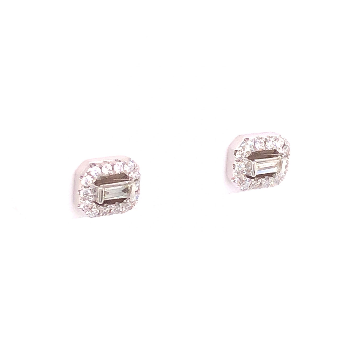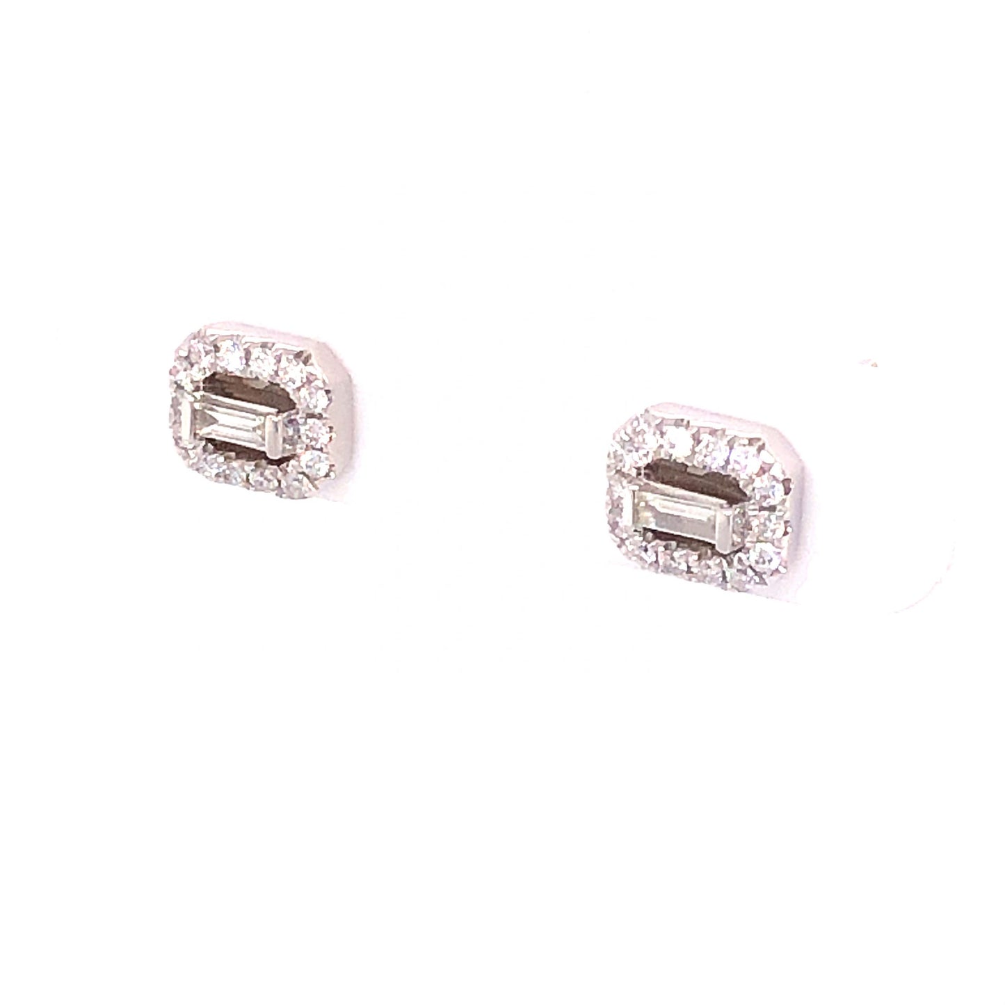 These lovely diamond studs feature .18 carats of glittering diamonds finished in 18 karat white gold. Two (2) .025 carat diamonds are set in channel bars and haloed by twenty-eight (28) .004 carat diamonds. The collection of diamonds are highly brilliant and multifaceted. Diamond studs are the perfect accent to any outfit, for any occasion!