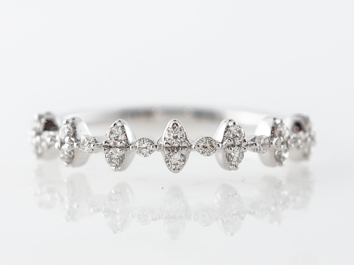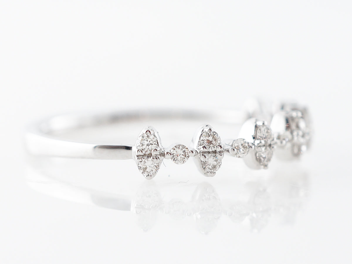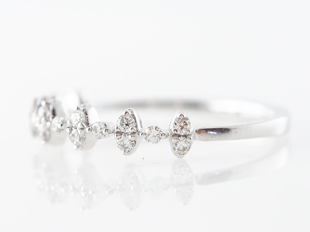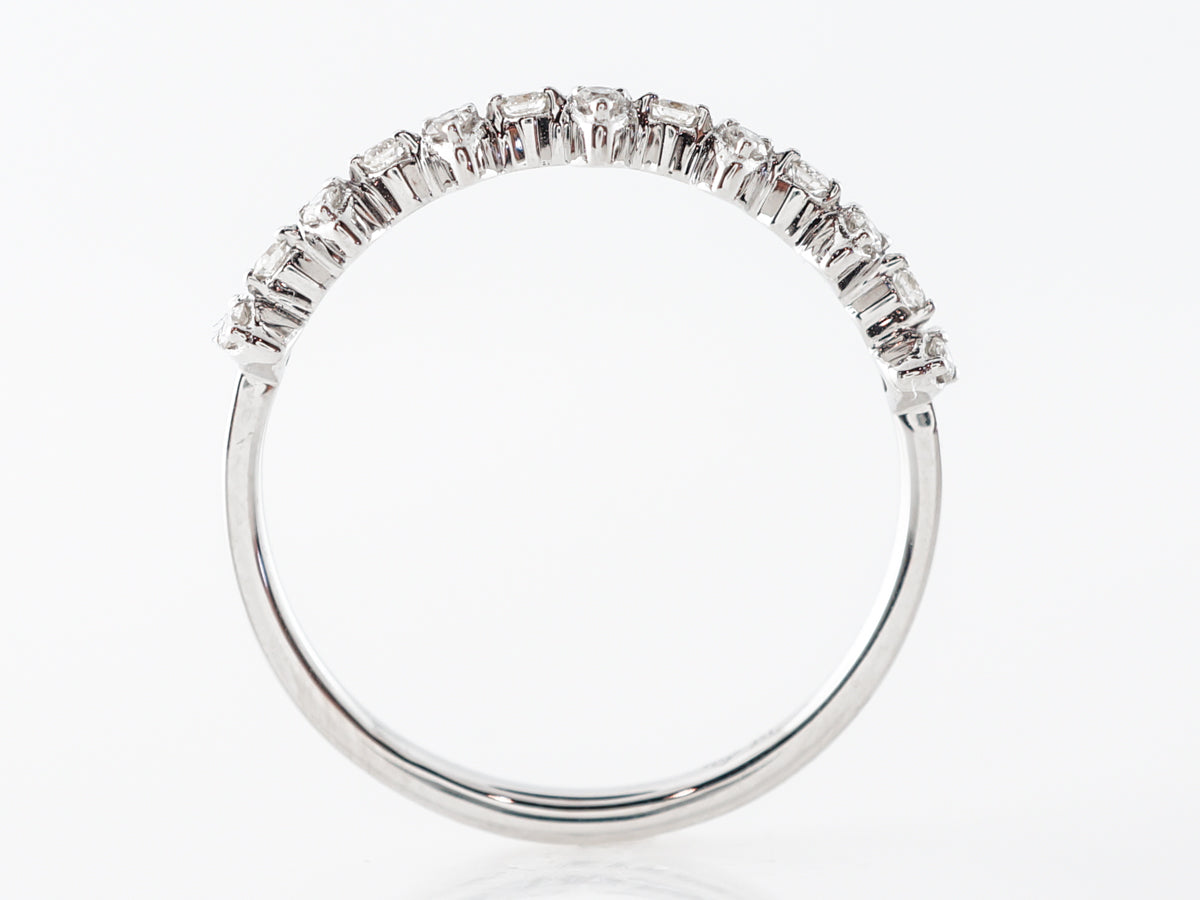.18 Diamond Wedding Band in 18k White Gold. This darling modern wedding band features .18 carats of round brilliant cut diamonds and is set in 18 karat white gold. The design of repeating offset open spaces provides a flashy detail that would add to any engagement ring. This ring would be fabulous to wear on its own or in a stack on your right hand as well.