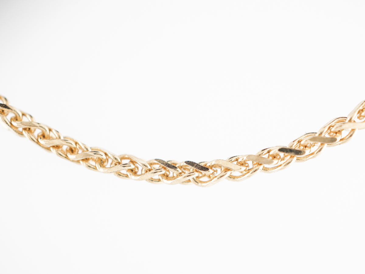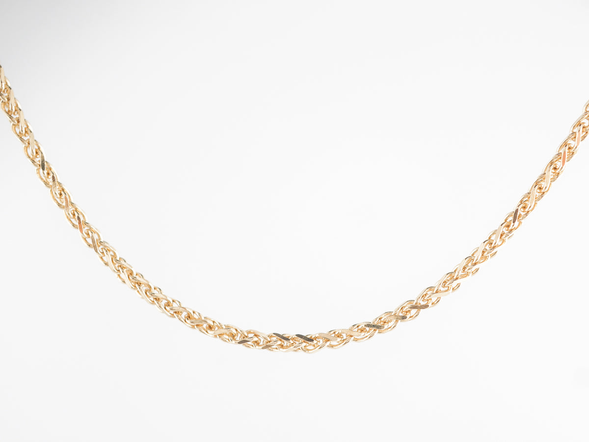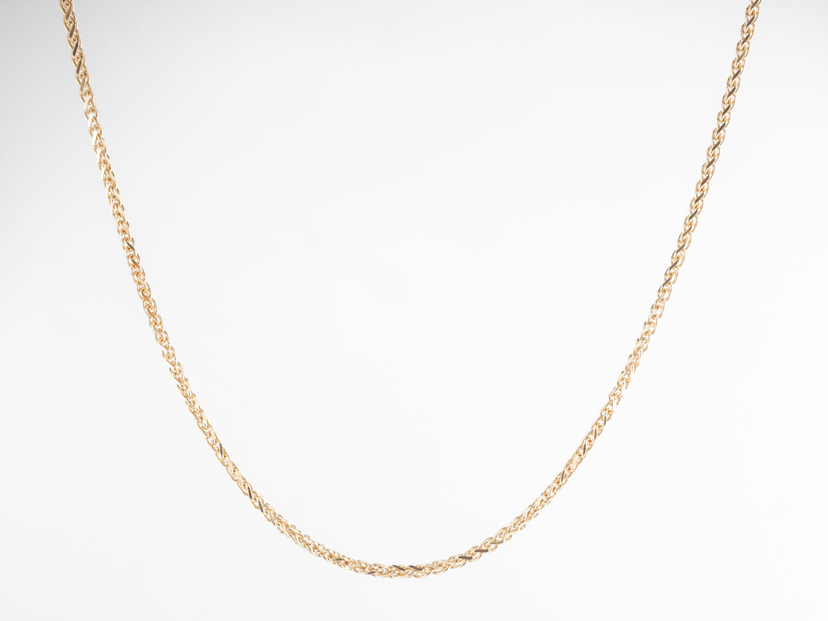 18 inch Chain Necklace 14k Yellow Gold. This modern chain necklace measures 18 inches in length and comes in 14 karat yellow gold. A wheat chain necklace that was made in India and would look great holding your favorite pendant.