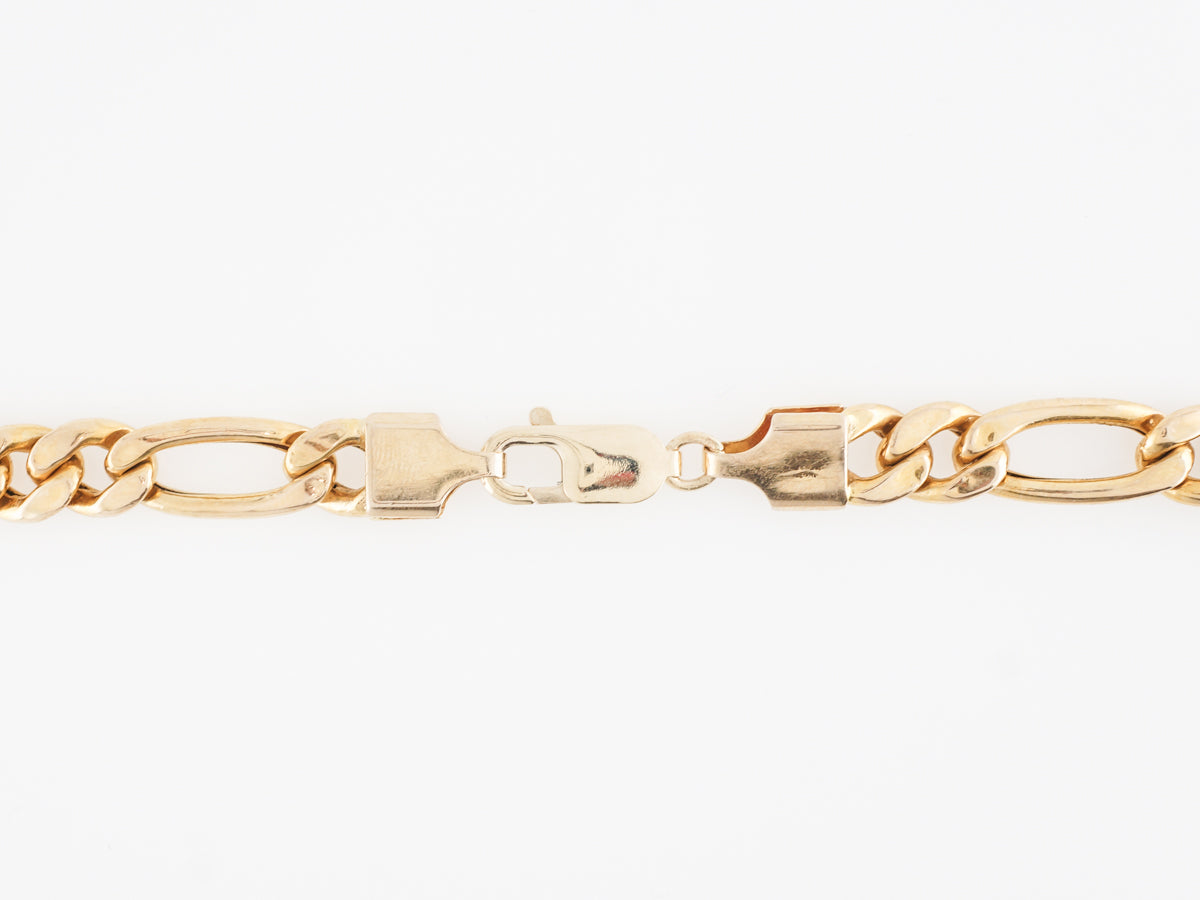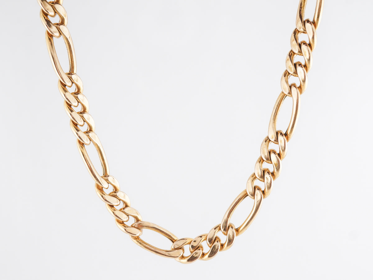 18 Inch Figaro Chain Necklace in 14k Yellow Gold. This modern figaro chain is finished in 14 karat yellow gold and measures 18 inches in length. The links are very thick and give this chain a tremendous gold look, weighing in at 25.8 grams.