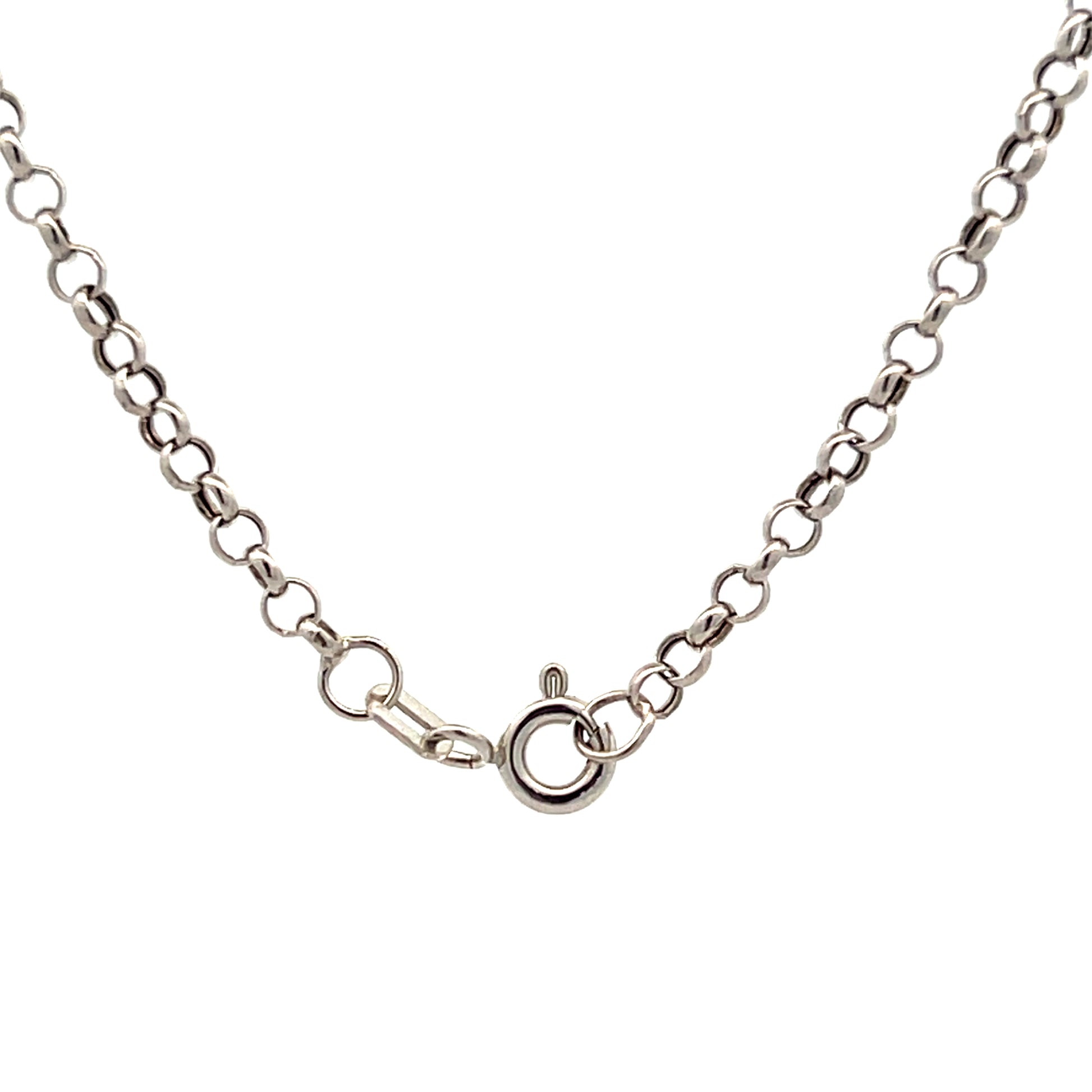 The 18-inch length sits at the base of the neck, making it ideal for wearing alone or adding a pendant. White gold provides a bright, silvery finish that pairs with platinum and silver jewelry. The rolo links catch light from multiple angles as the chain moves, and the spring ring clasp keeps everything secure throughout the day.
