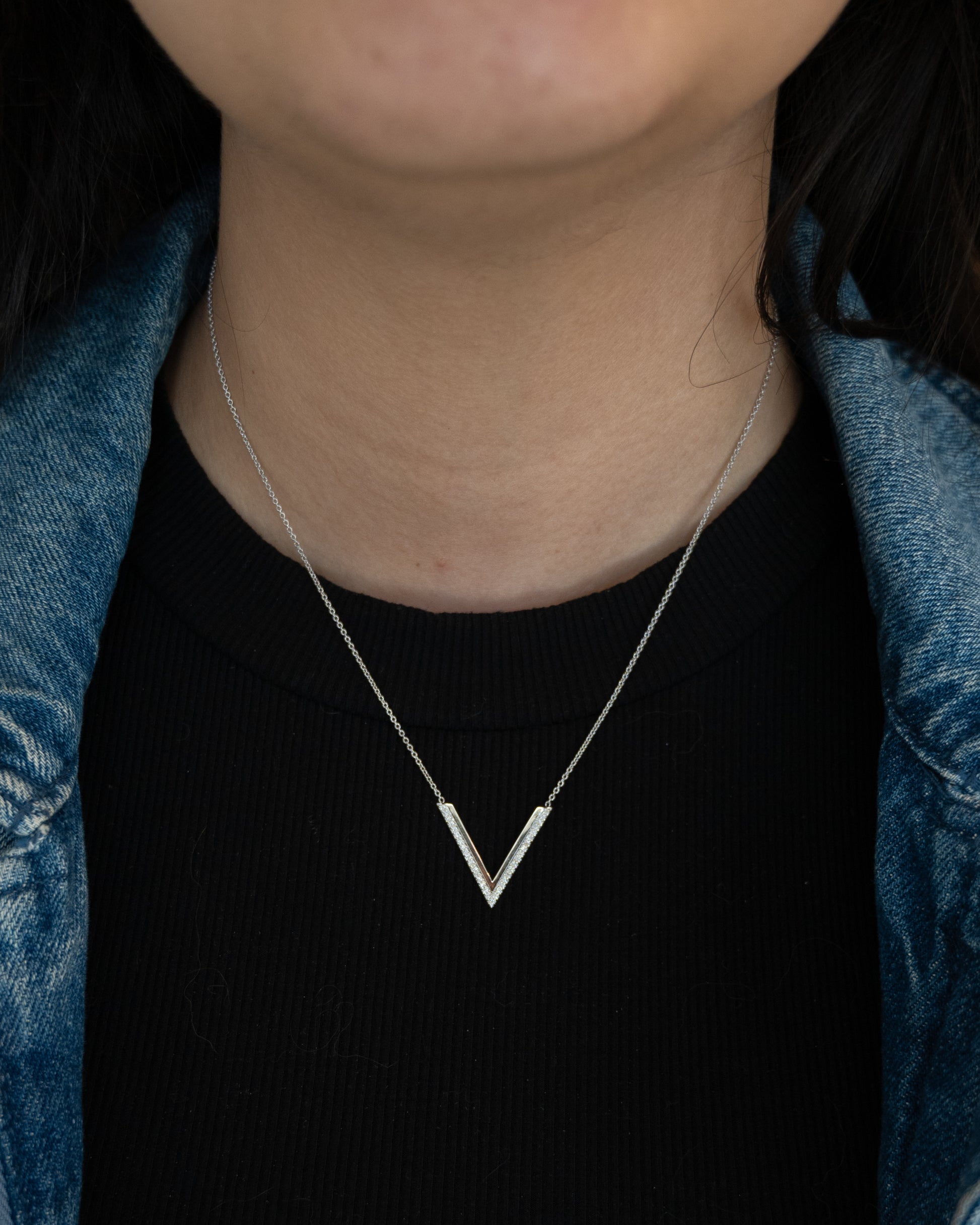 This modern V-shaped bar pendant necklace is made from 18 karat white gold with 35 round brilliant cut diamonds, each measuring 1.0mm and weighing .005 carats. All diamonds have the same SI1 clarity and G-H color grade (near colorless), creating a consistent sparkle throughout the V-shaped bar. The diamonds are arranged in a pavé setting that allows maximum light reflection while maintaining a smooth overall appearance.