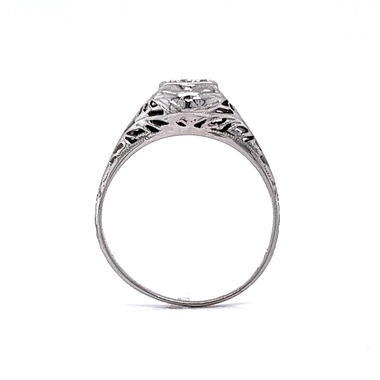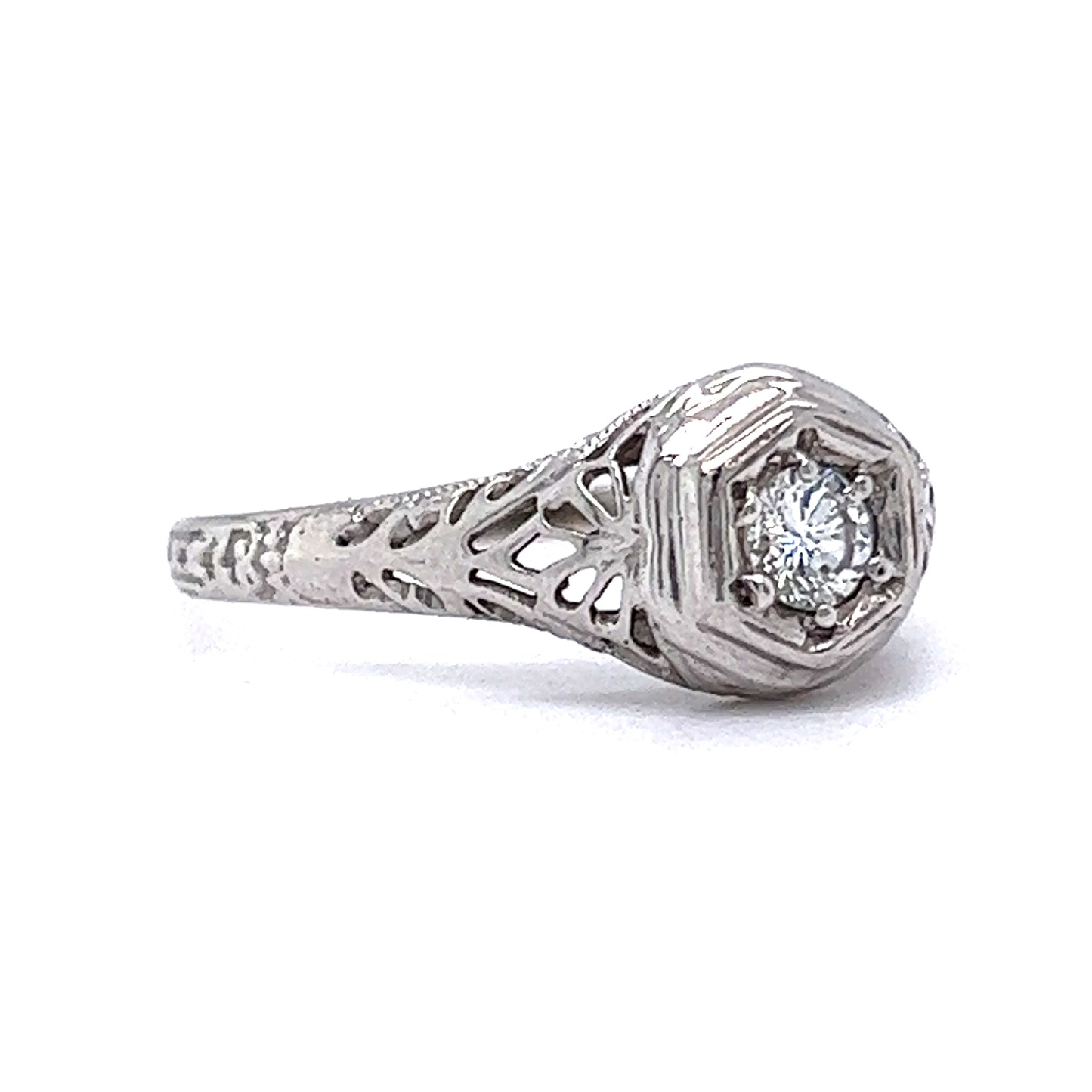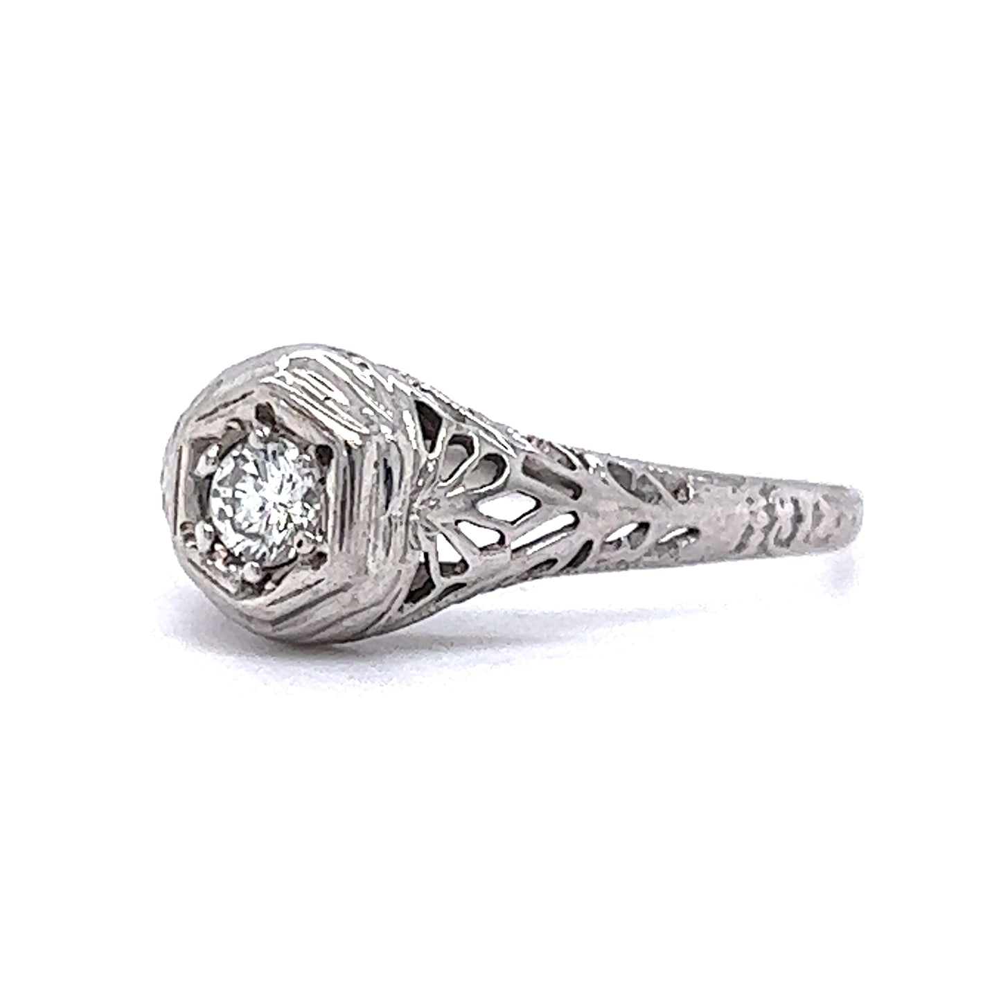 This Art Deco engagement ring features a .19 carat round brilliant cut diamond in 18 karat white gold. The white diamond has a beautiful clarity and a sparkling color. The diamond is set in a four prong solitaire setting, providing a classic and timeless look. The detailed filigree metalwork is featured around the center stone and extends down the shank of the ring, finished in polished 18 karat white gold.