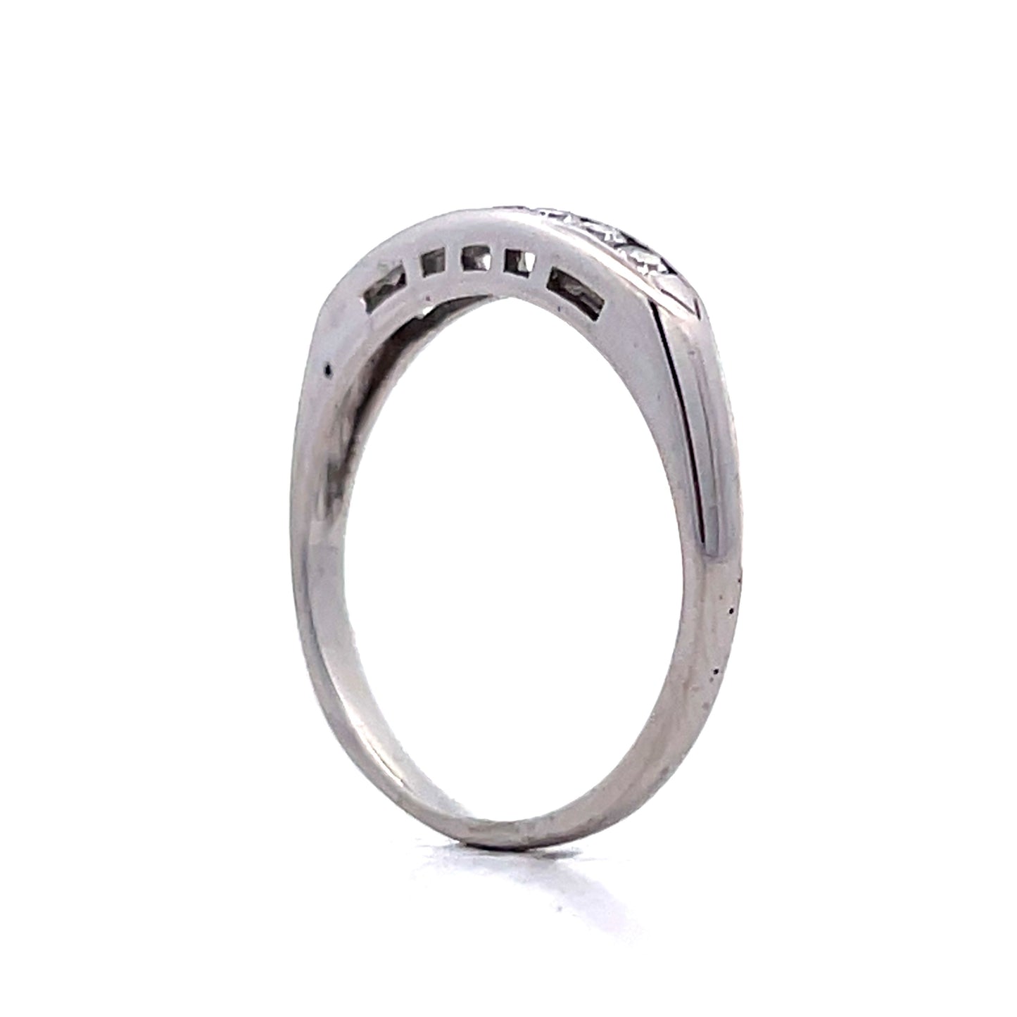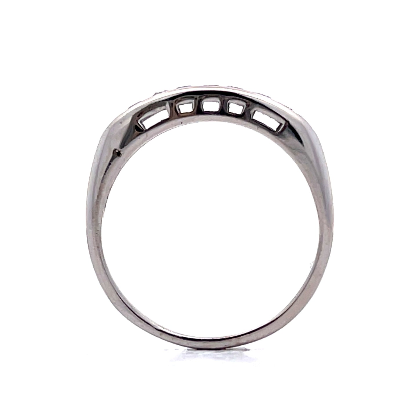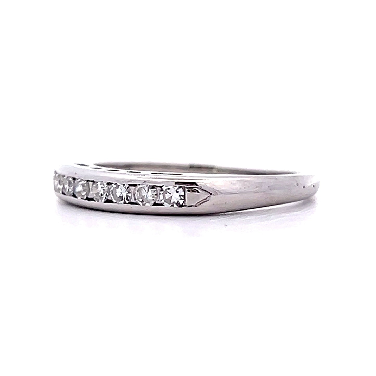 This Mid-Century channel set wedding band offers a classic combination of 14-karat white gold and a row of glittery diamonds. The .19 carat round single cut diamonds are securely held in a channel setting for a seamless and refined look. The design creates a continuous row of sparkle that wraps around the band, giving the ring a simple yet bold presence.