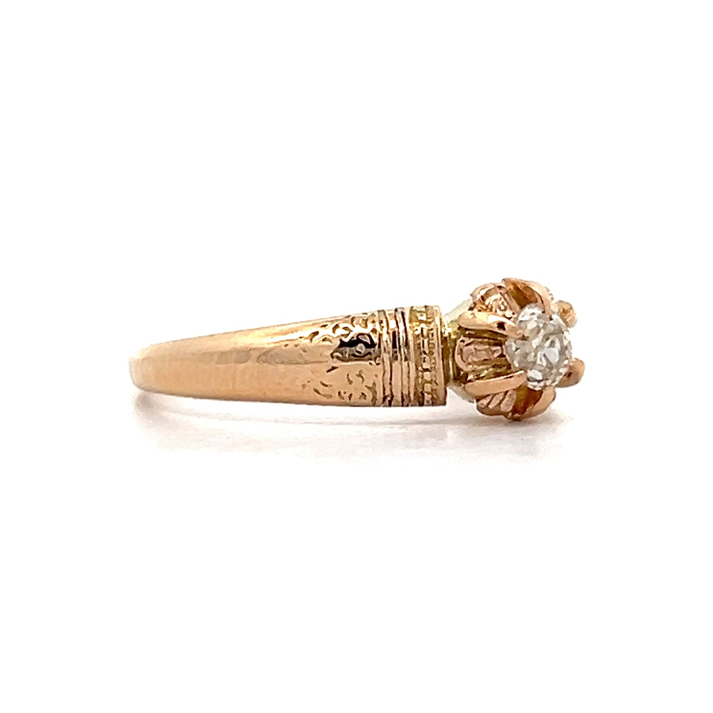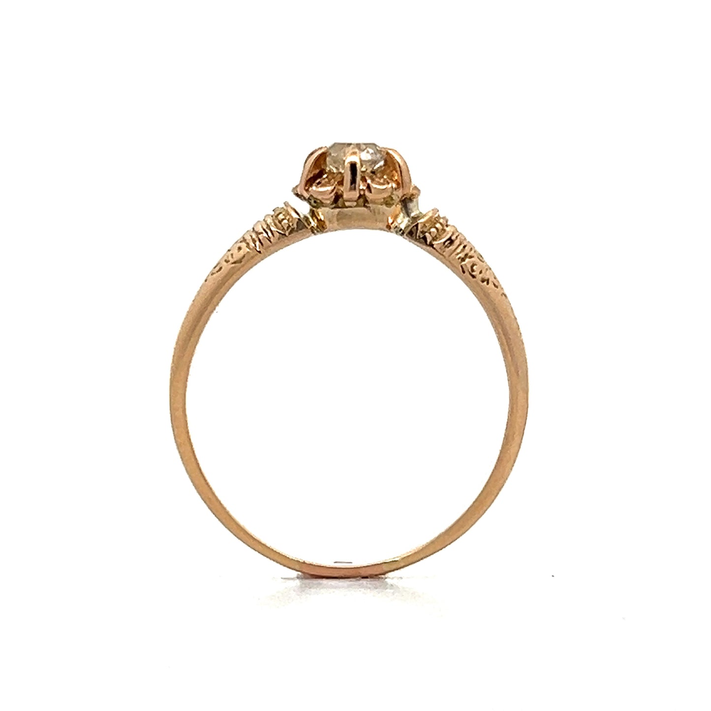 This Victorian-era solitaire diamond engagement ring is crafted in 14 karat yellow gold and features a .19 carat old European cut diamond. The diamond, with SI2 clarity and H color, sparkles warmly in a classic buttercup style setting. The band is polished and adorned with intricate engraved details, reflecting the craftsmanship of the Victorian period. This antique ring is a beautiful symbol of love with a rich history and timeless charm.