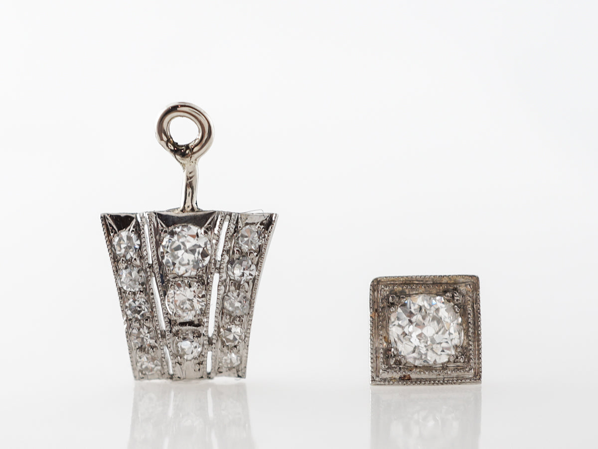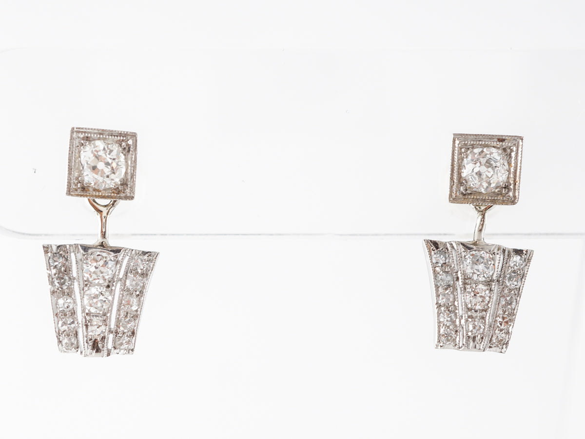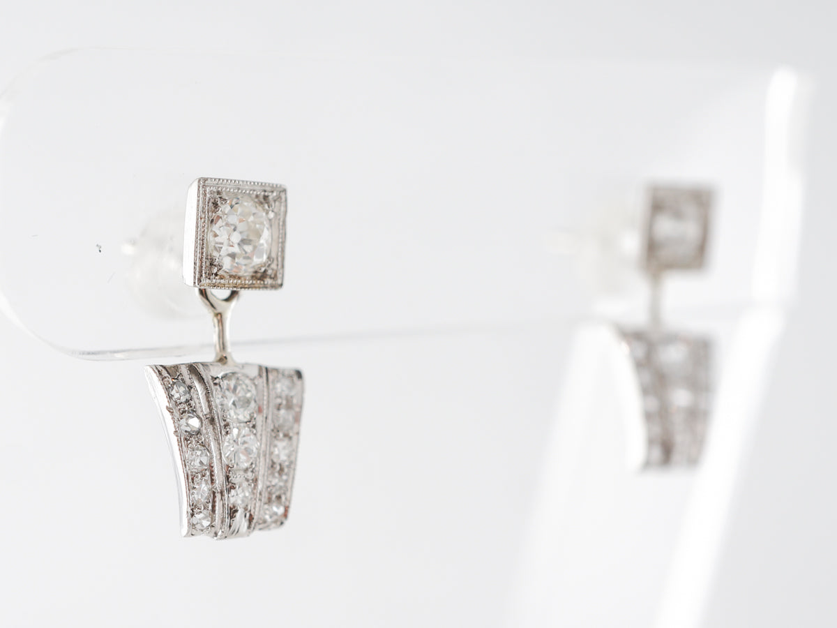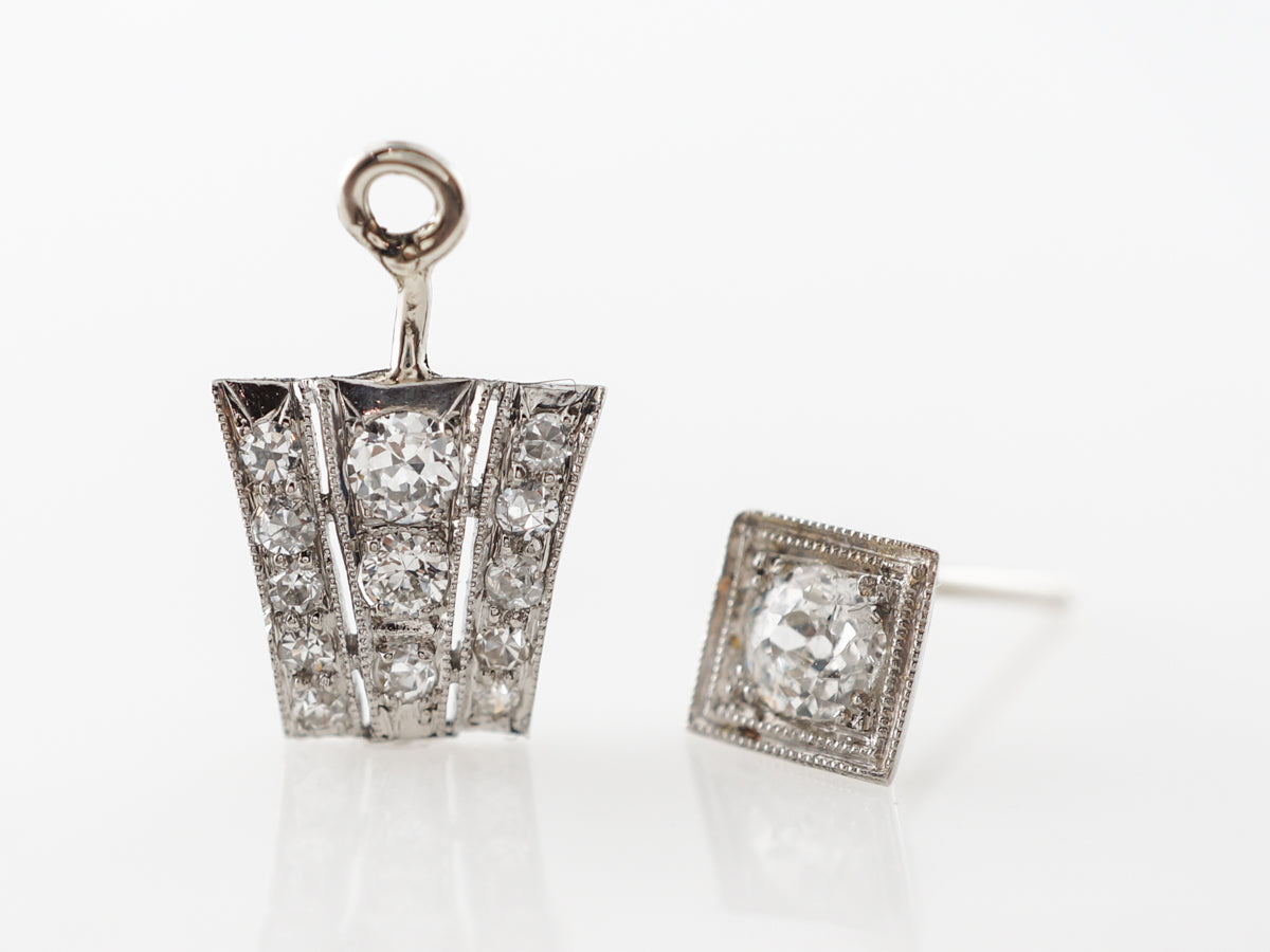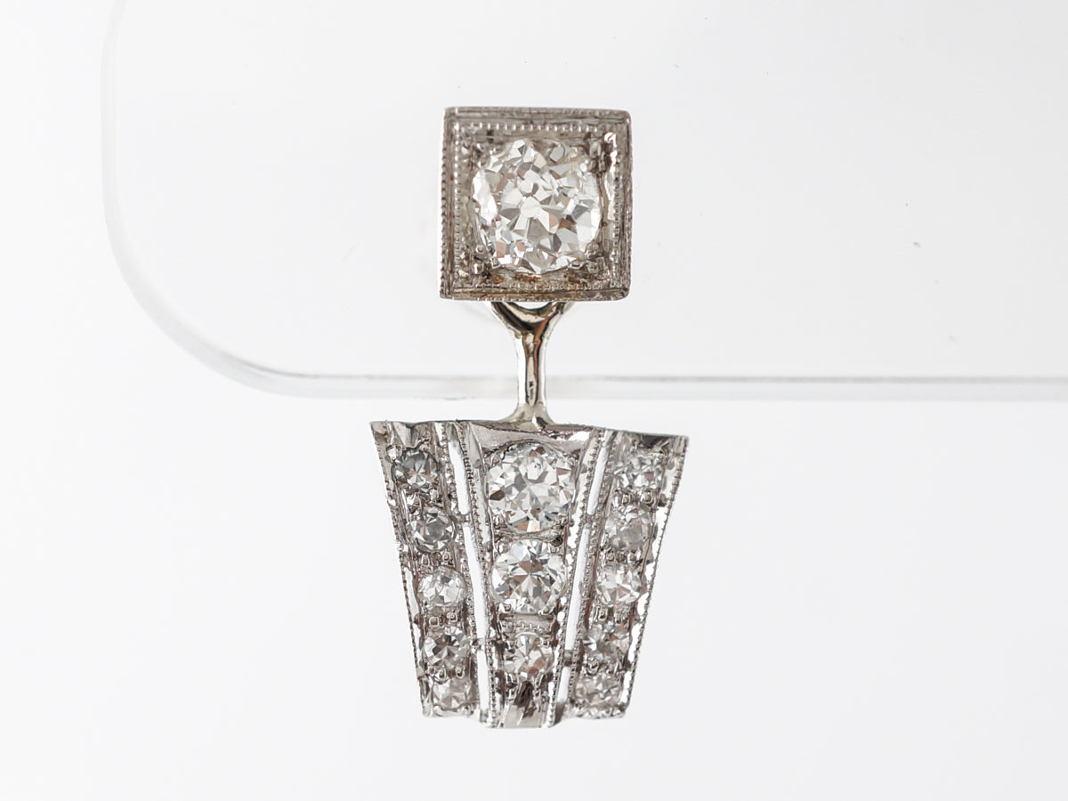 1920s Art Deco Earrings w/ Diamonds in Platinum. These dazzling Art Deco earrings feature .94 carats of Old European Cut diamonds and are finished in platinum. The earrings are really more like two sets of earrings in one, as they work with a stud that holds the drop portion through a loop that dangles from the stud. Such a fun and exciting piece of beautiful Art Deco style!