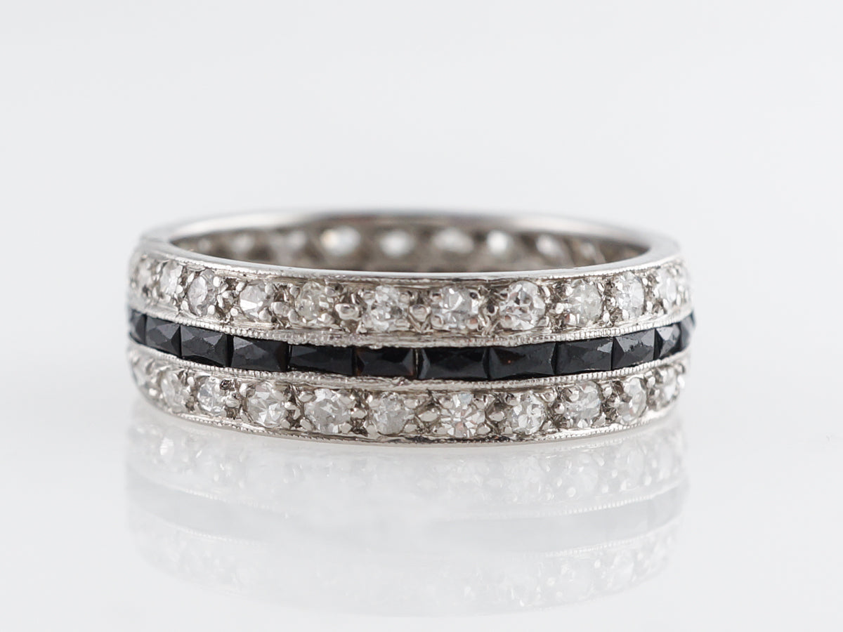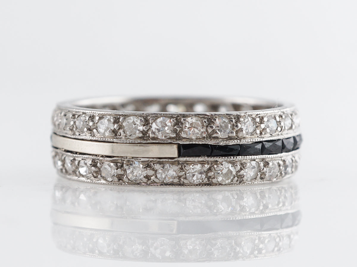 1920s Diamond Sapphire Wedding Band in 18K White Gold. This original Art Deco wide band features a sapphire center sandwiched by a row of pave diamonds on each side. There are 54 single cut diamonds set with shared prongs and with the addition of the dark sapphires in the center, it gives this ring so much dimension. This vintage band is large, full of contrast, and would look excellent if worn alone on your right hand.