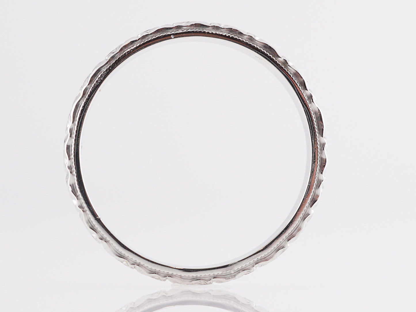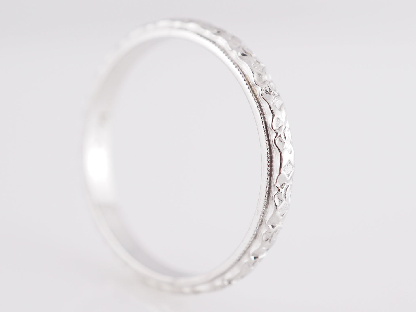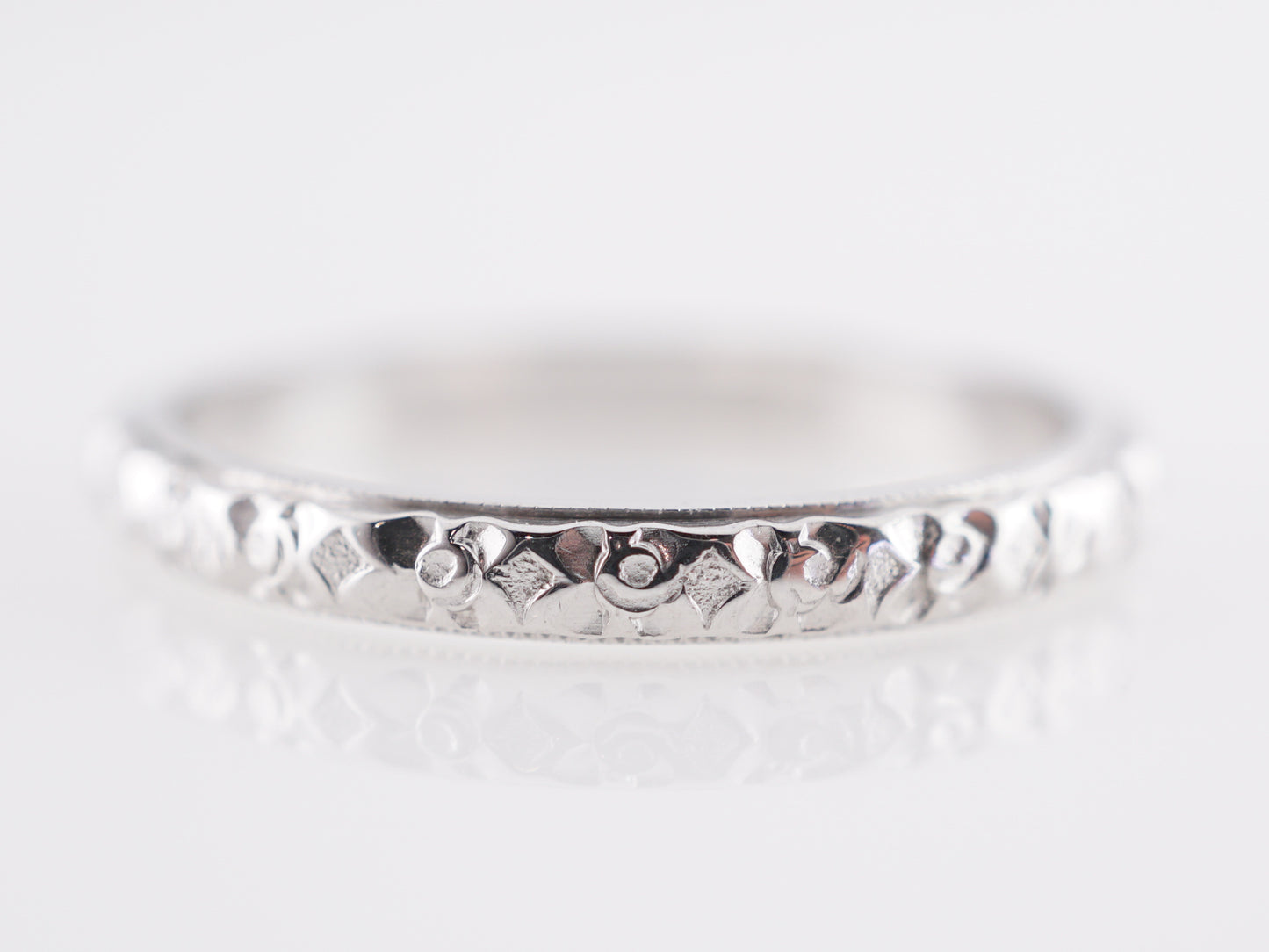 1930s Art Deco Orange Blossom Band in 14K White Gold. This engraved Art Deco wedding band features a stunning, textured design in 14k white gold. Beautiful orange blossoms abound, this vintage band is elegantly crafted and will sit beautifully next to any engagement ring!
