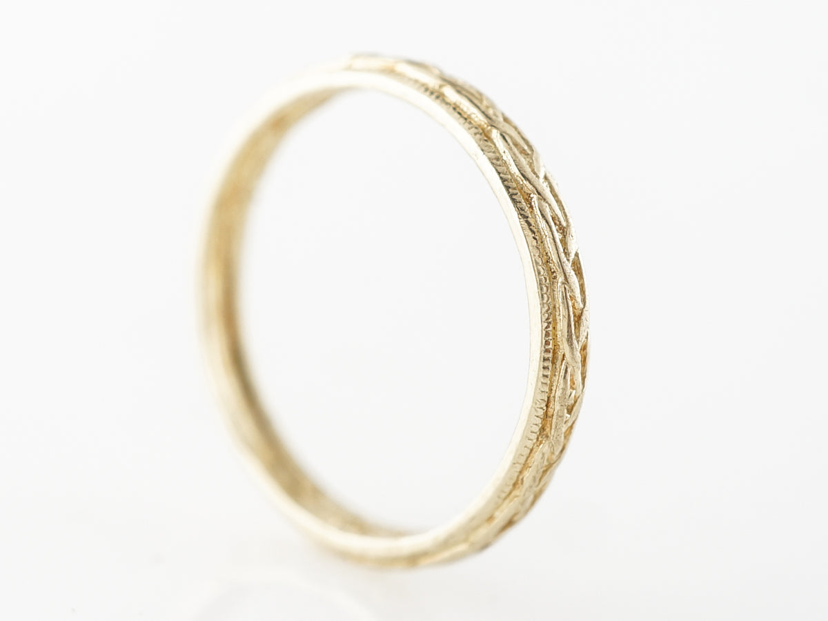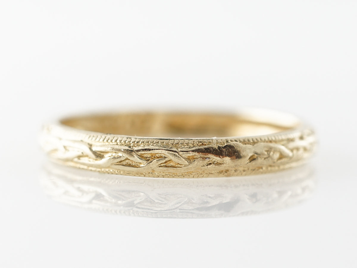 1930s Engraved Wedding Band in 10k Yellow Gold. This Art Deco wedding band features lovely flowing engraving and milgrain details on the outer edges. Finished in 10k yellow gold, this band features a flowing braided design around the entirety of the band.