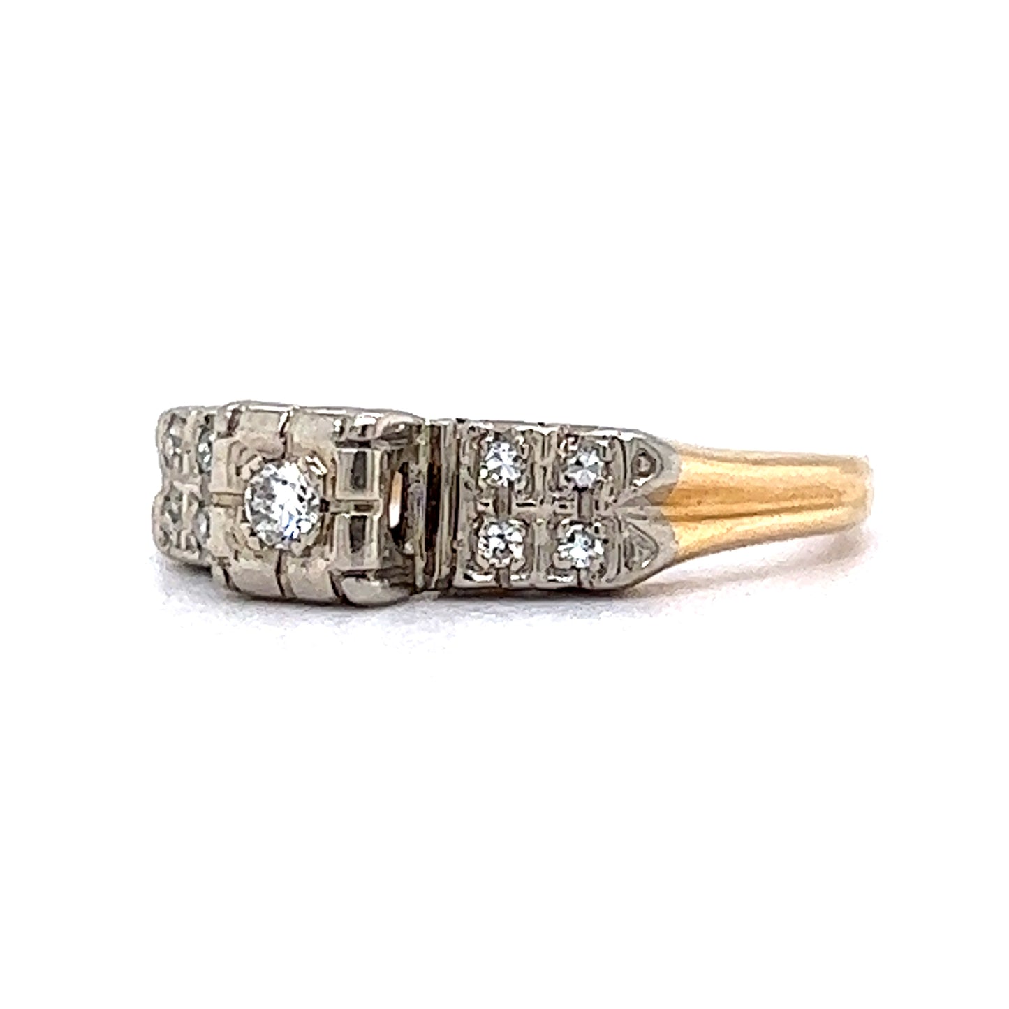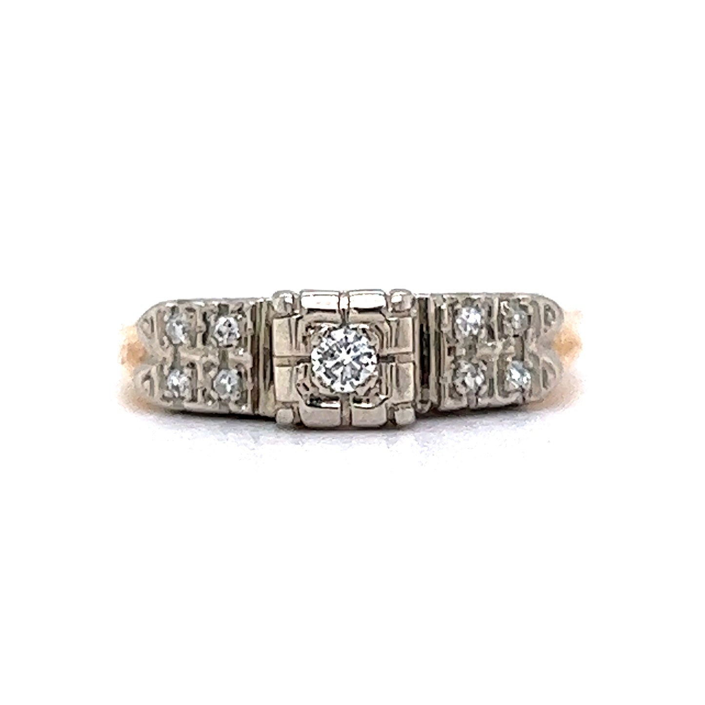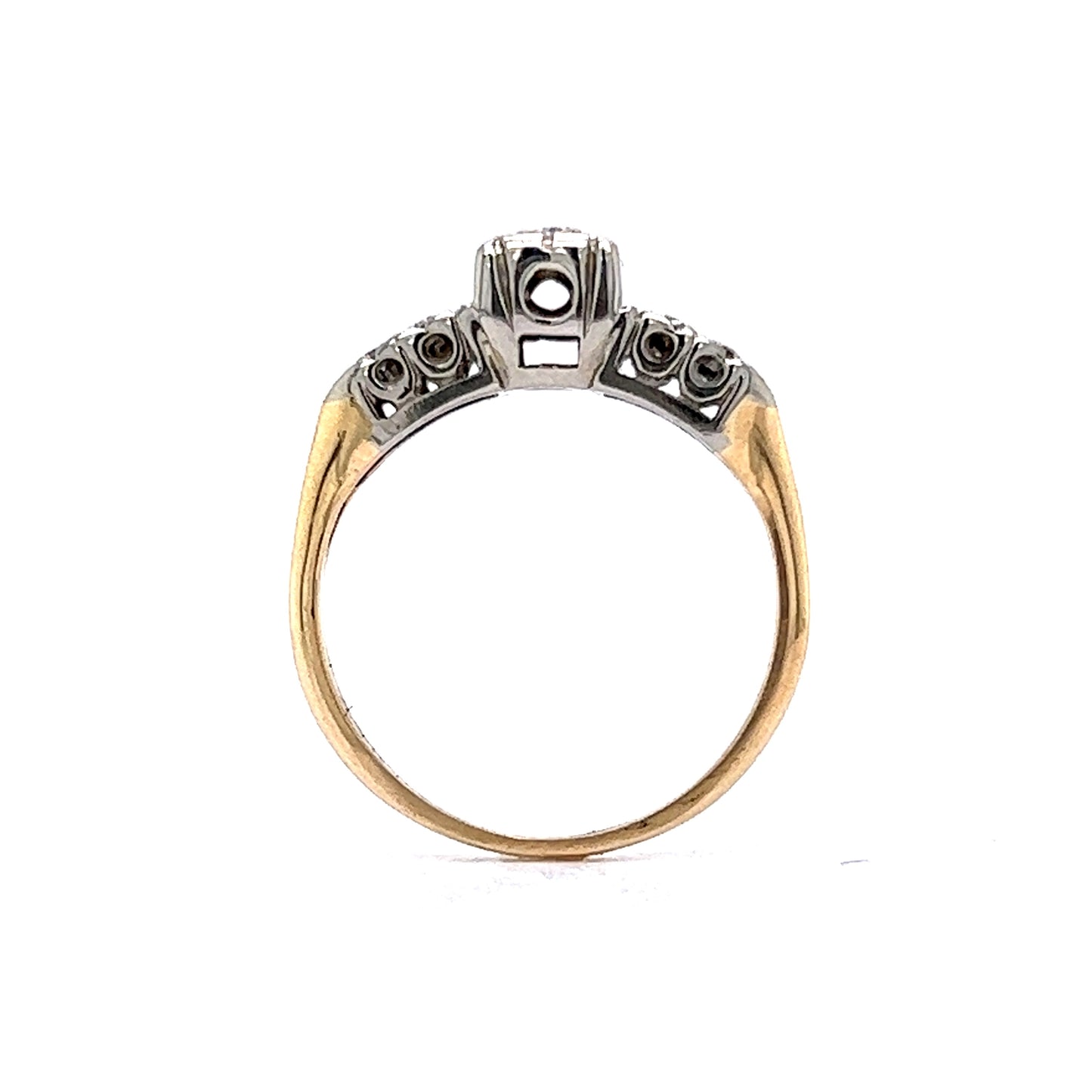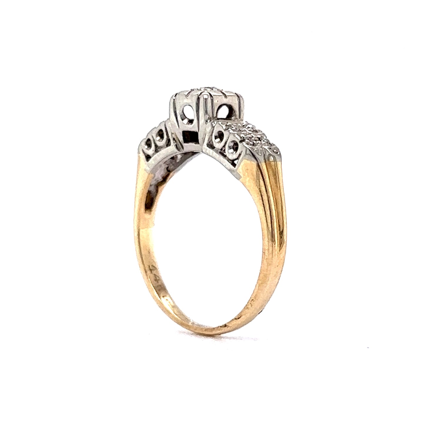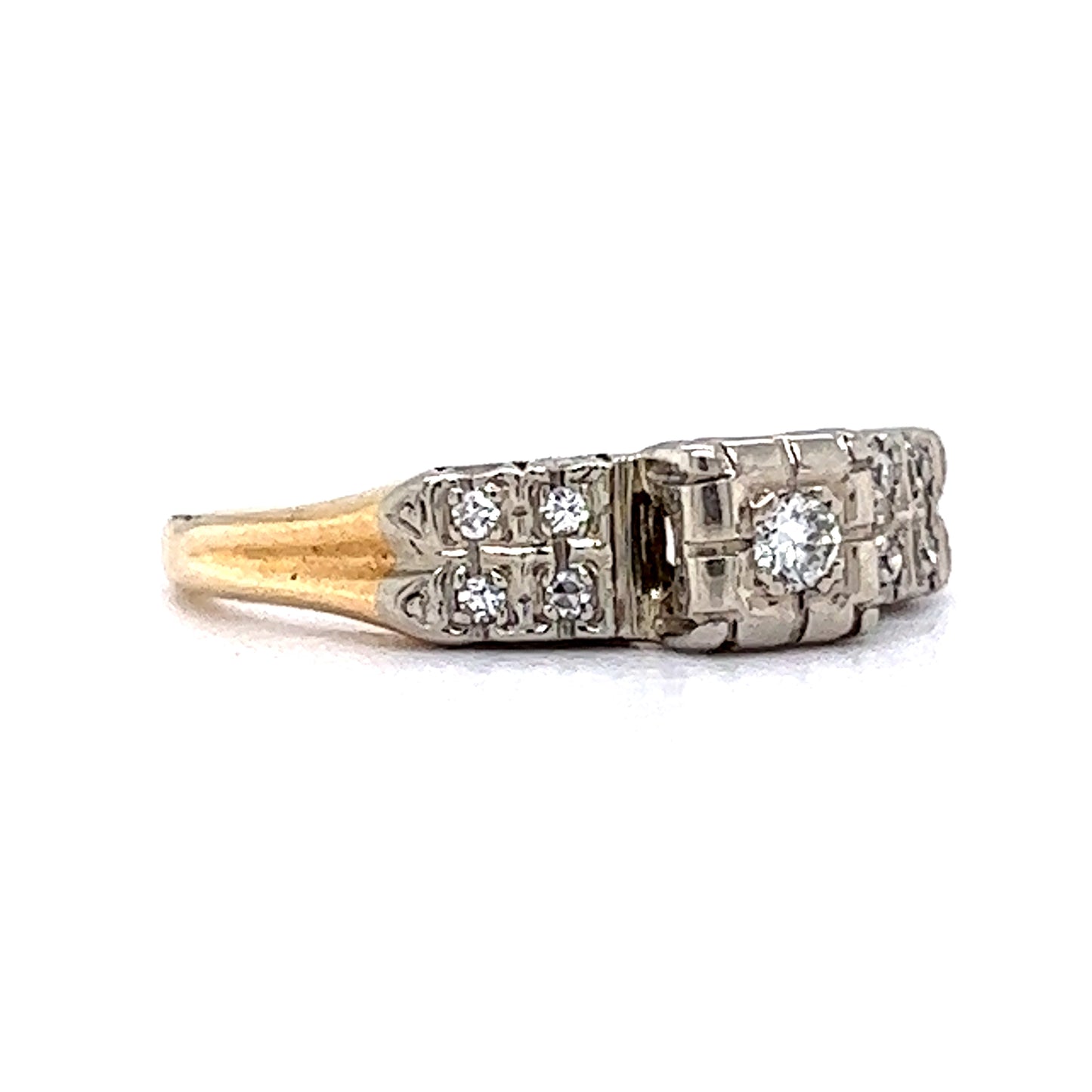 1940s Diamond Retro Engagement Ring in 14k Yellow Gold.  This beautiful Retro engagement ring features .08 carats of round brilliant cut diamonds set in 14 karat white gold with a 14 karat yellow gold band. At the shoulders the shank splits into two and holds the white gold mounting. The diamonds are set in neat geometric spaces with a square shaped mounting underneath the primary stone.