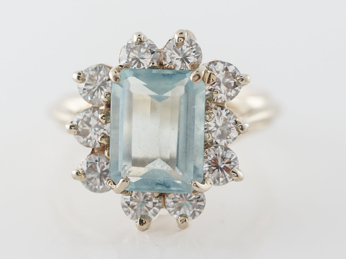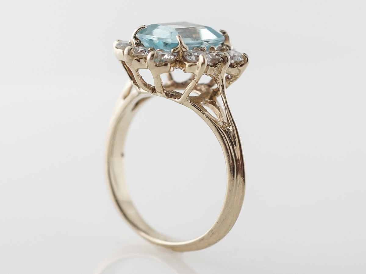 1950s Aquamarine Diamond Cocktail Ring in Yellow Gold. This aquamarine and diamond cluster cocktail ring is so classic in design that the ring could have been made yesterday rather than almost 70 years ago during the 1950s. Set in 14 karat yellow gold the 2.06 icy blue aquamarine is set in prongs with round brilliant diamonds prong set creating a large diamond halo. The total diamond weight is .60 carats. The ring is finished in a high polish.
