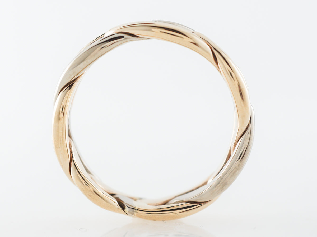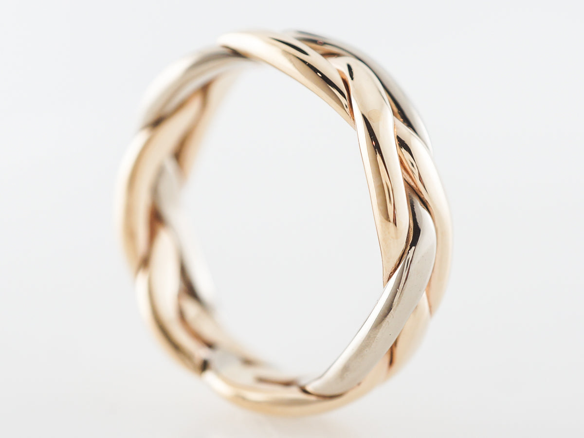 1960s Braided Wedding Band in White, Yellow Rose Gold. This mid-century braided wedding is finished in white, yellow, and rose gold. The high polish finish of this ring makes it very interesting to gaze at, as the difference in color can actually get quite subtle depending on the light youre in.