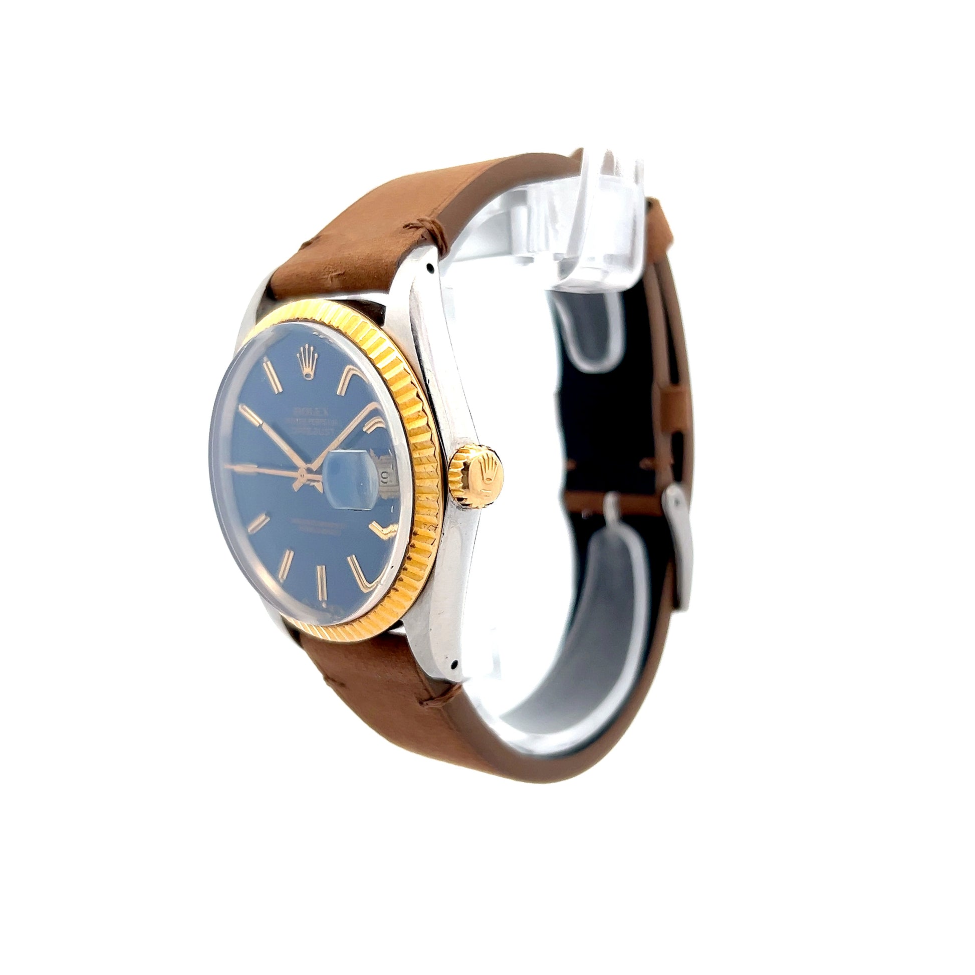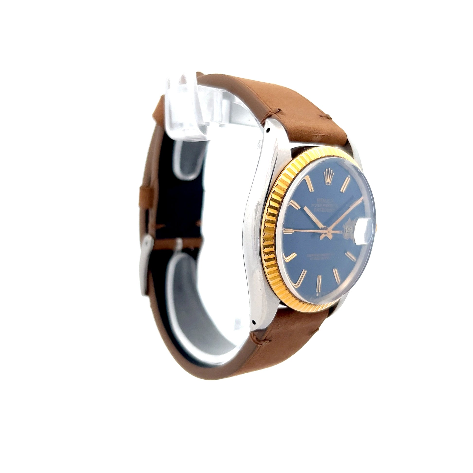 A blue dial creates strong contrast against the two-tone case and bezel. The watch comes on a new brown leather strap that offers a different look from the traditional metal bracelet while staying comfortable for daily wear. Reference number 9887392 identifies this specific model.