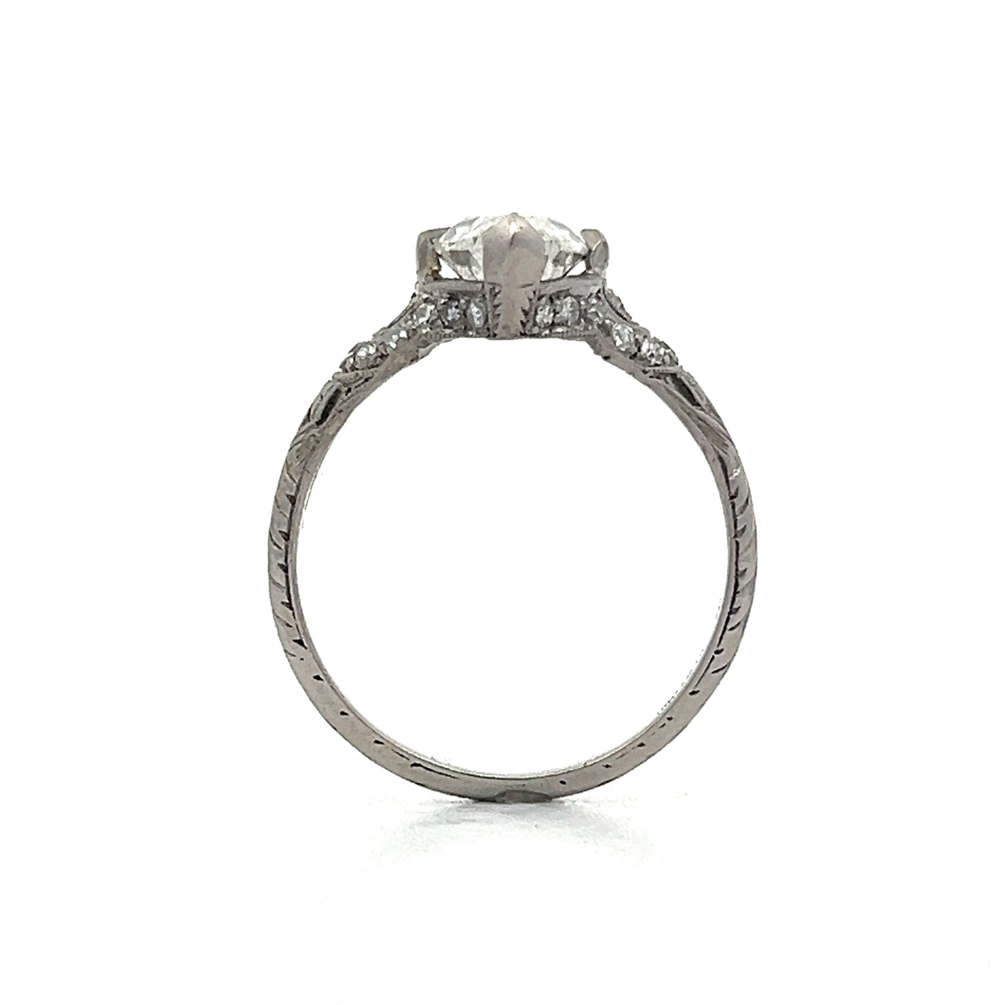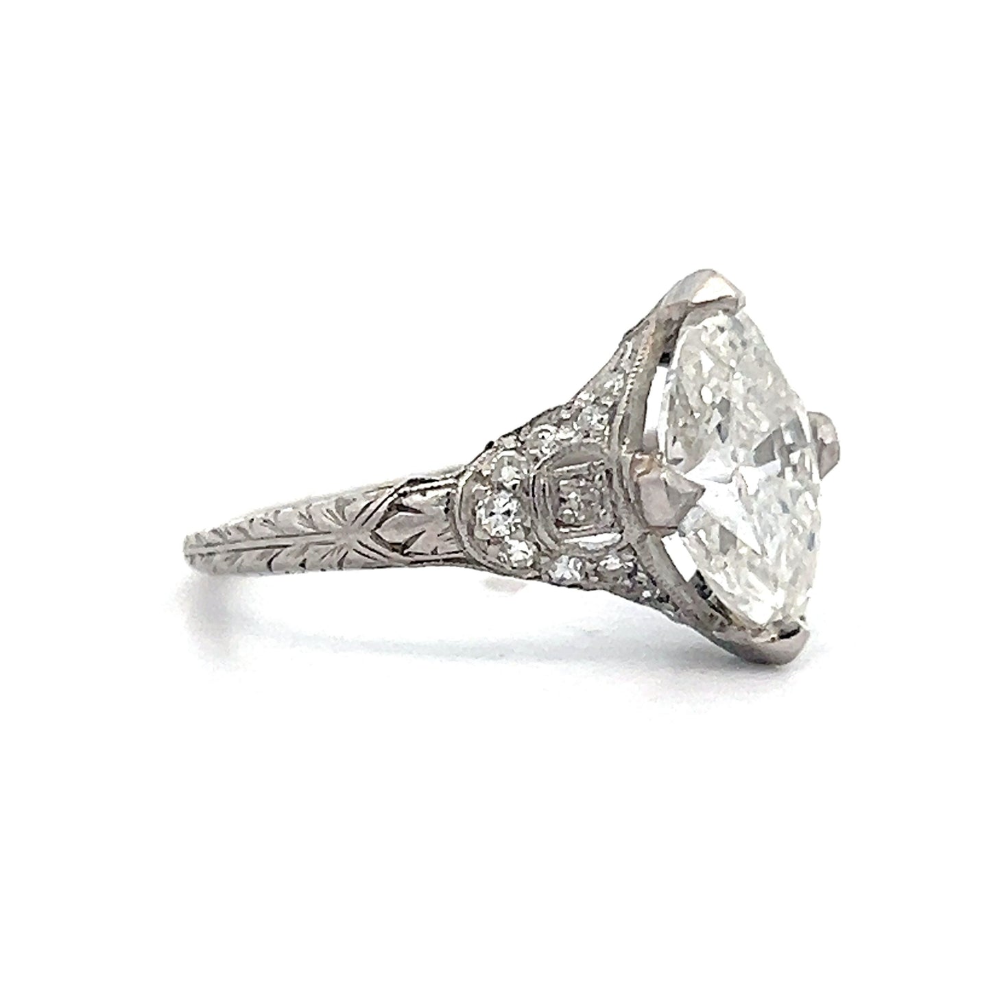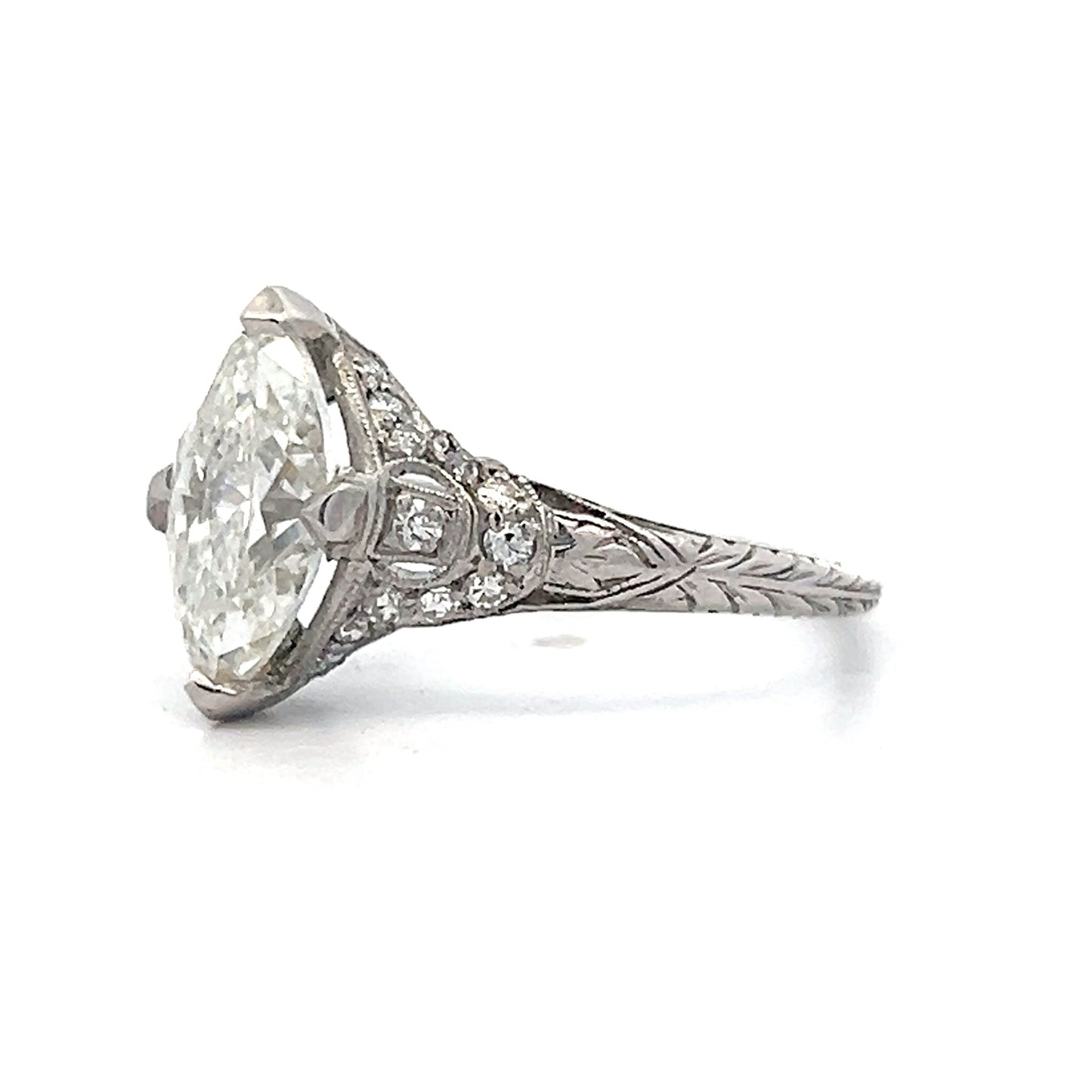 This exquisite Art Deco engagement ring is a true masterpiece from a bygone era. Crafted in platinum, this ring features a beautiful 2.00 carat marquise cut diamond as its centerpiece. The intricate milgrain detailing and ornate engravings on the band add a touch of vintage charm to this ring. The band is also adorned with 24 shimmering single cut accent diamonds, totaling .24 carats. From the classic four prong setting to the delicate engravings, every detail of this ring is classic Art Deco.