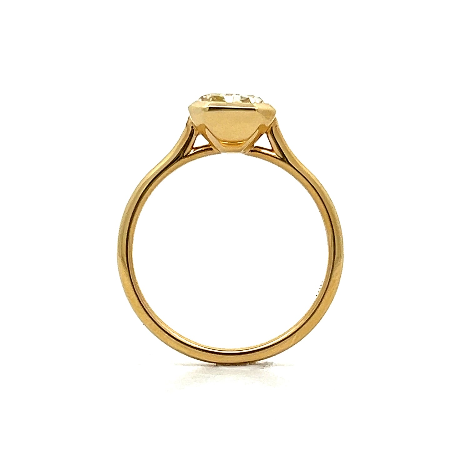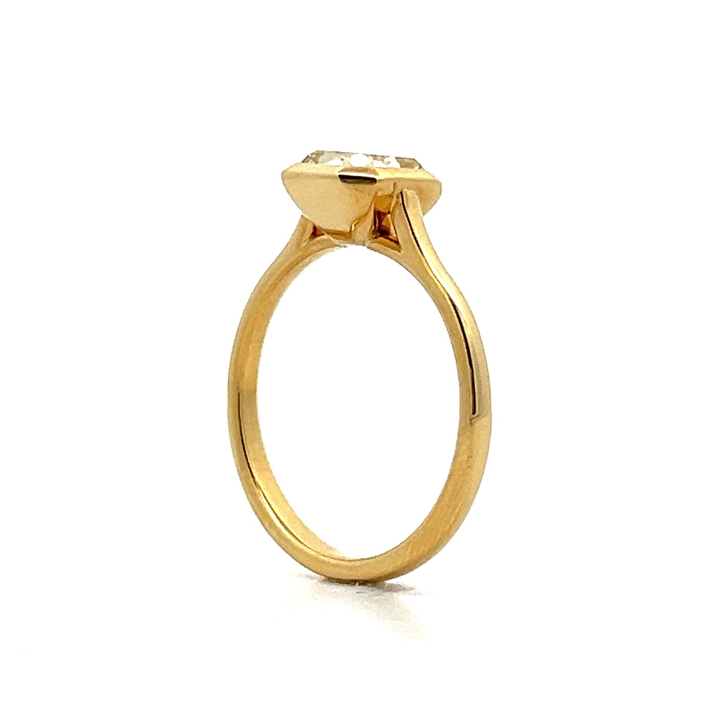 This modern engagement ring is a true showstopper! Crafted in high polished 18 karat yellow gold, this ring features a 2.00 carat cushion cut diamond at its center. The bezel setting adds a contemporary touch to this classic solitaire design, ensuring the diamond is secure and prominently displayed. The GIA-certified diamond boasts a VVS2 clarity, making it almost completely flawless to the naked eye. Adding to its unique allure, the diamond is graded with a rare W-X color, giving it a warm and luxurious hue. Timeless and elegant, this modern cushion cut diamond engagement ring is the perfect symbol of your love and commitment.