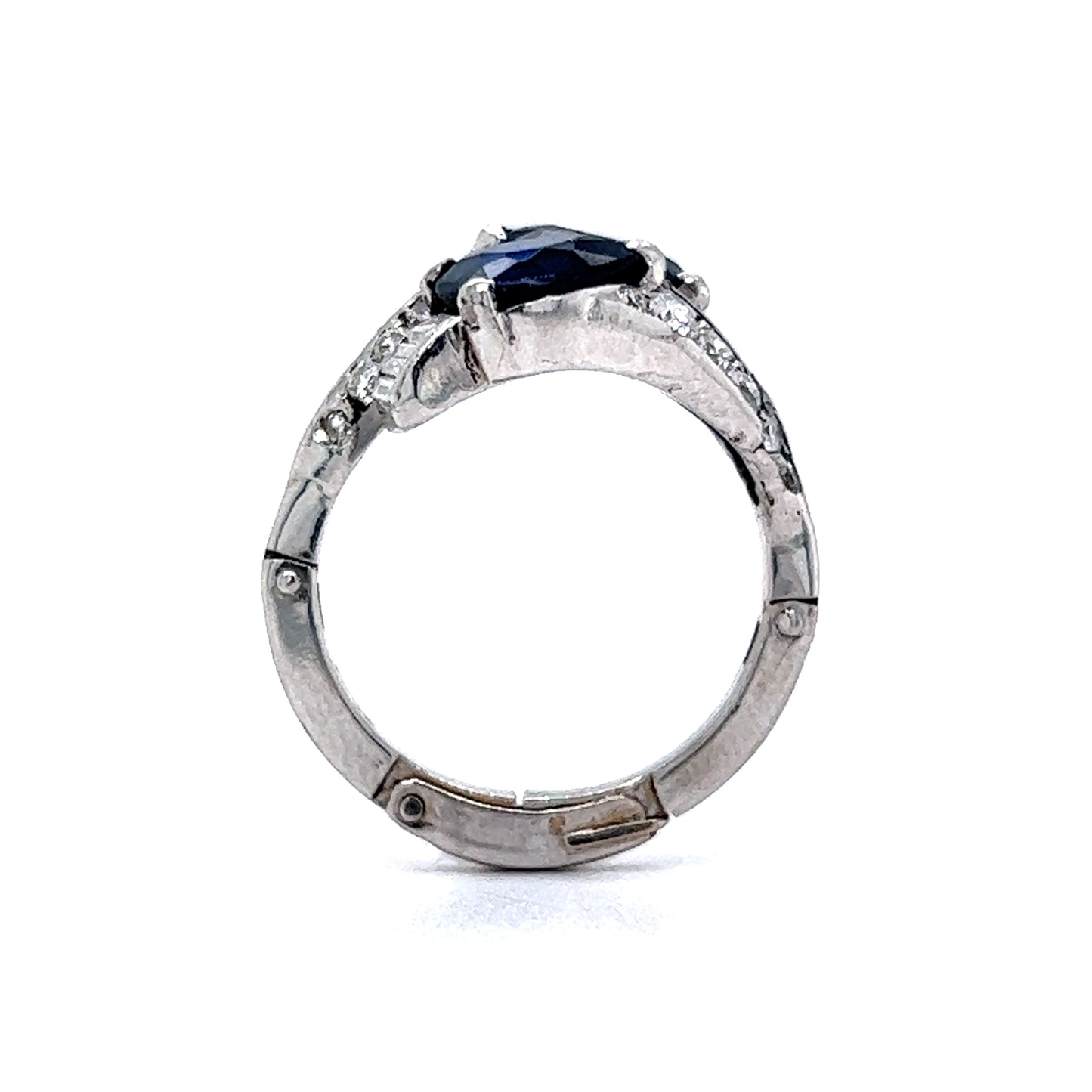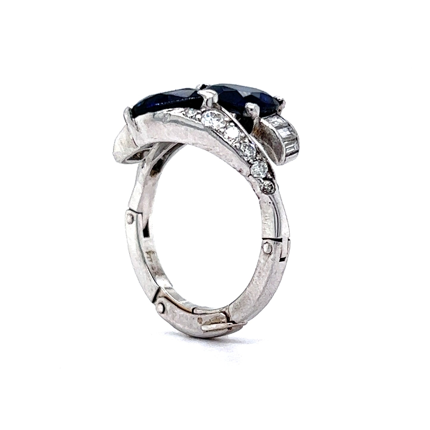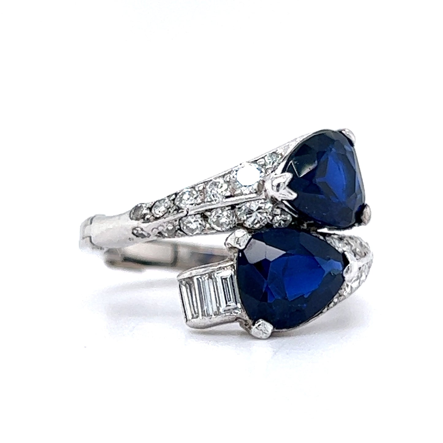 This stunning right hand ring features 2.00 total carats of blue sapphires and accent diamonds in shimmering platinum. Two (2) pear cut sapphires are prong set at the head of the ring. The sapphires have a deep, royal blue hue and are accented by four (4) .06 carat diamonds at the base curve of the pear. Twenty (20) .03 carat diamonds accent the shoulders of the ring. This custom band comes with an adjustable finger mechanism to perfectly fit fingers sized anywhere from 5.5 6.5. A fabulous ring with style function!