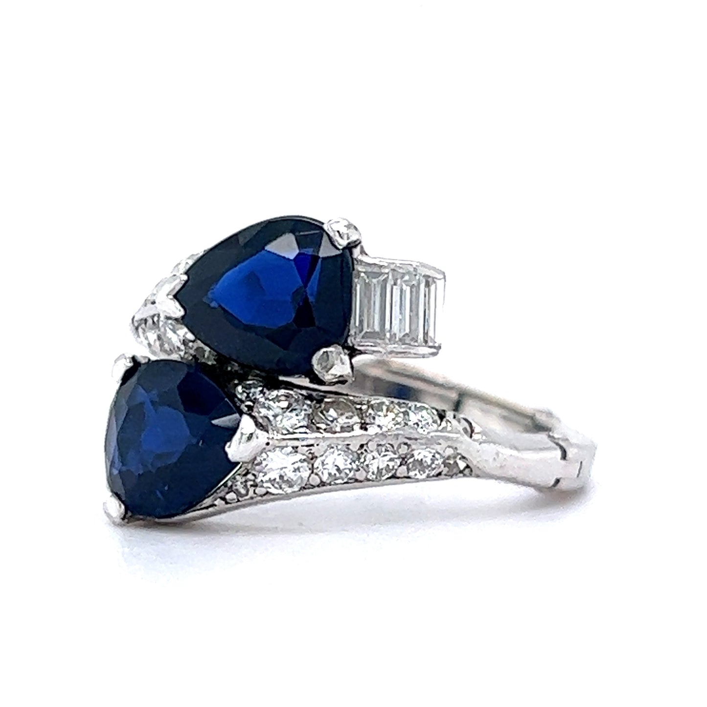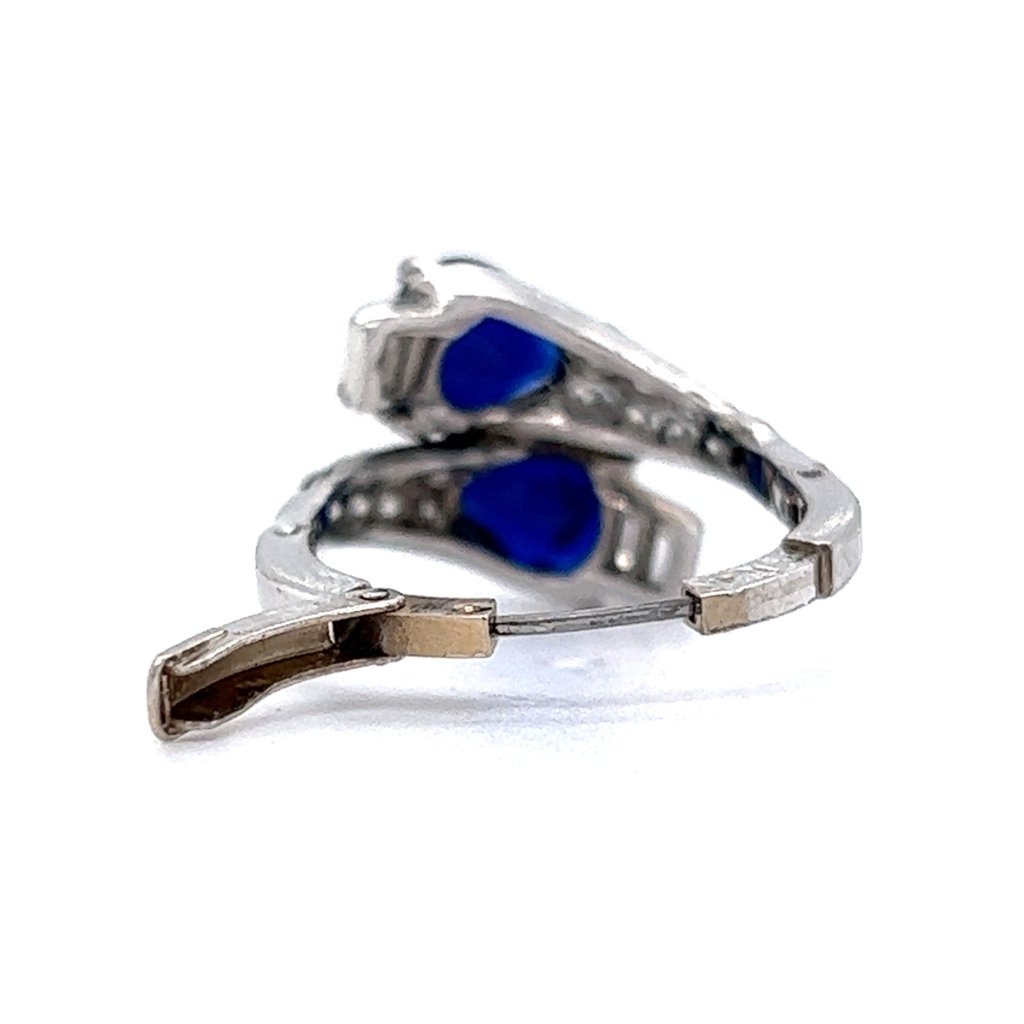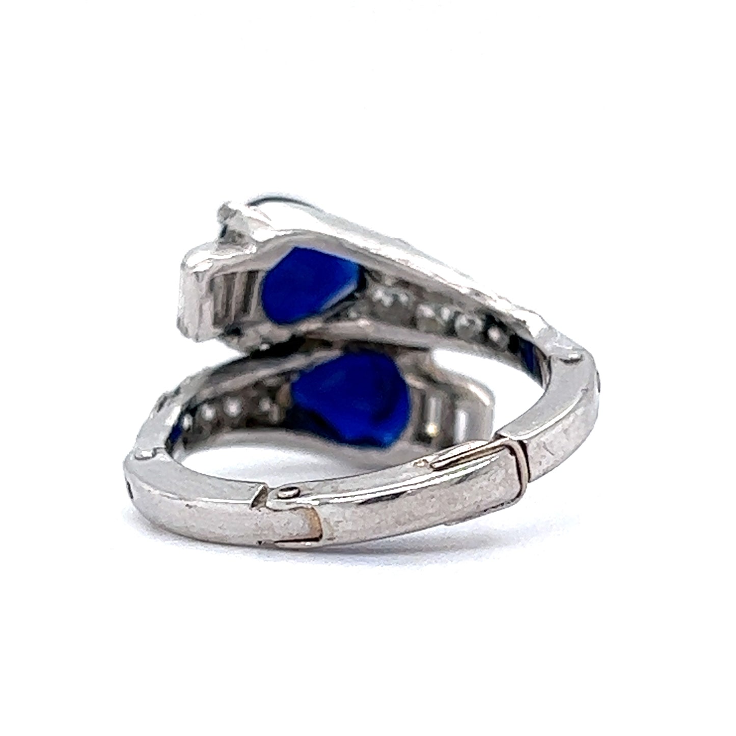 This stunning right hand ring features 2.00 total carats of blue sapphires and accent diamonds in shimmering platinum. Two (2) pear cut sapphires are prong set at the head of the ring. The sapphires have a deep, royal blue hue and are accented by four (4) .06 carat diamonds at the base curve of the pear. Twenty (20) .03 carat diamonds accent the shoulders of the ring. This custom band comes with an adjustable finger mechanism to perfectly fit fingers sized anywhere from 5.5 6.5. A fabulous ring with style function!