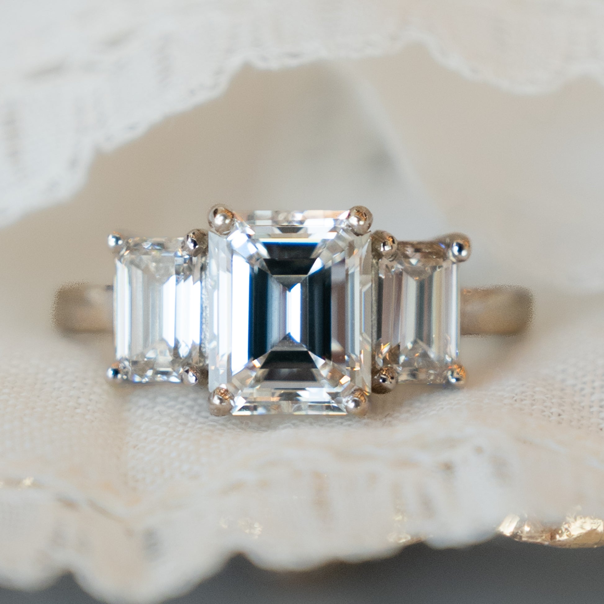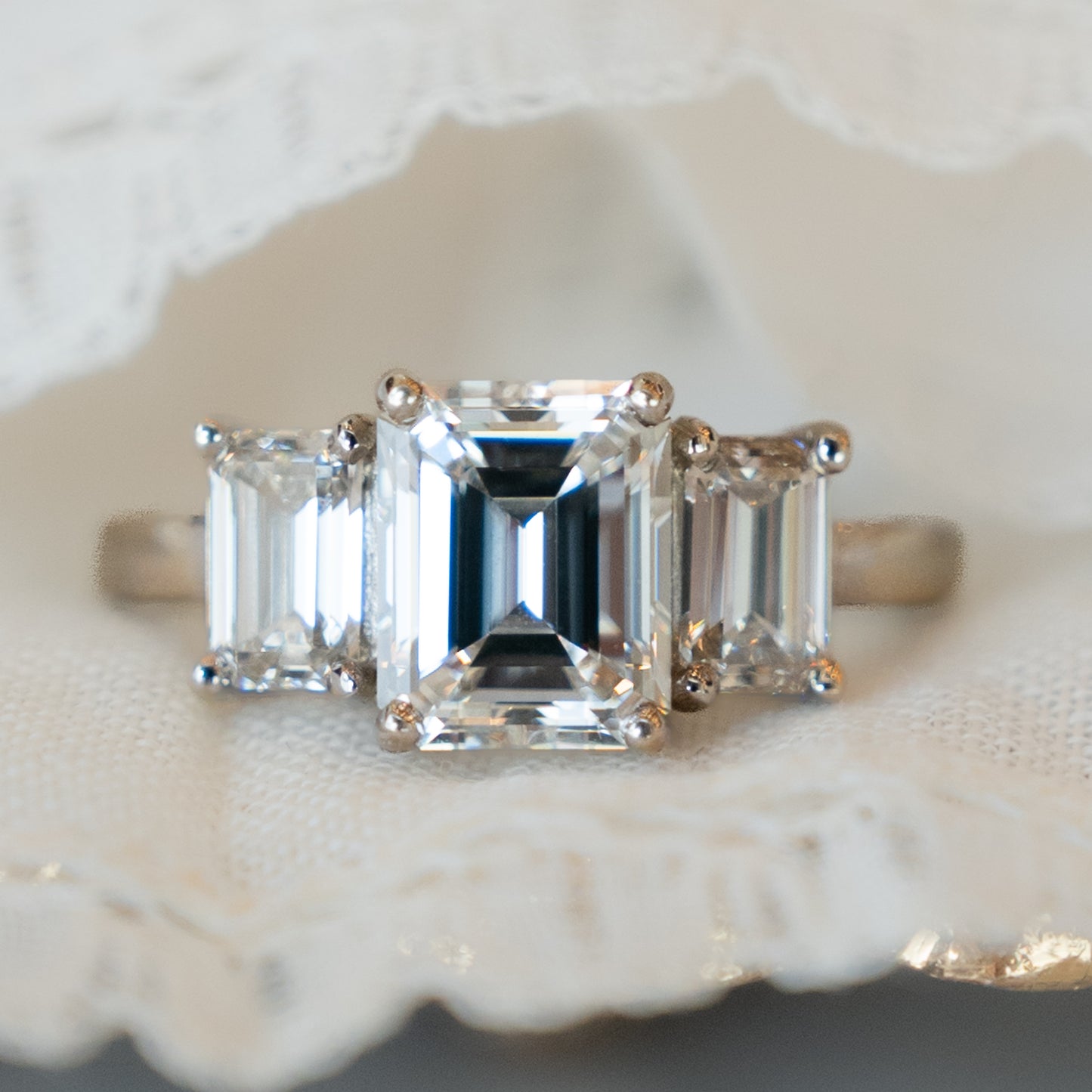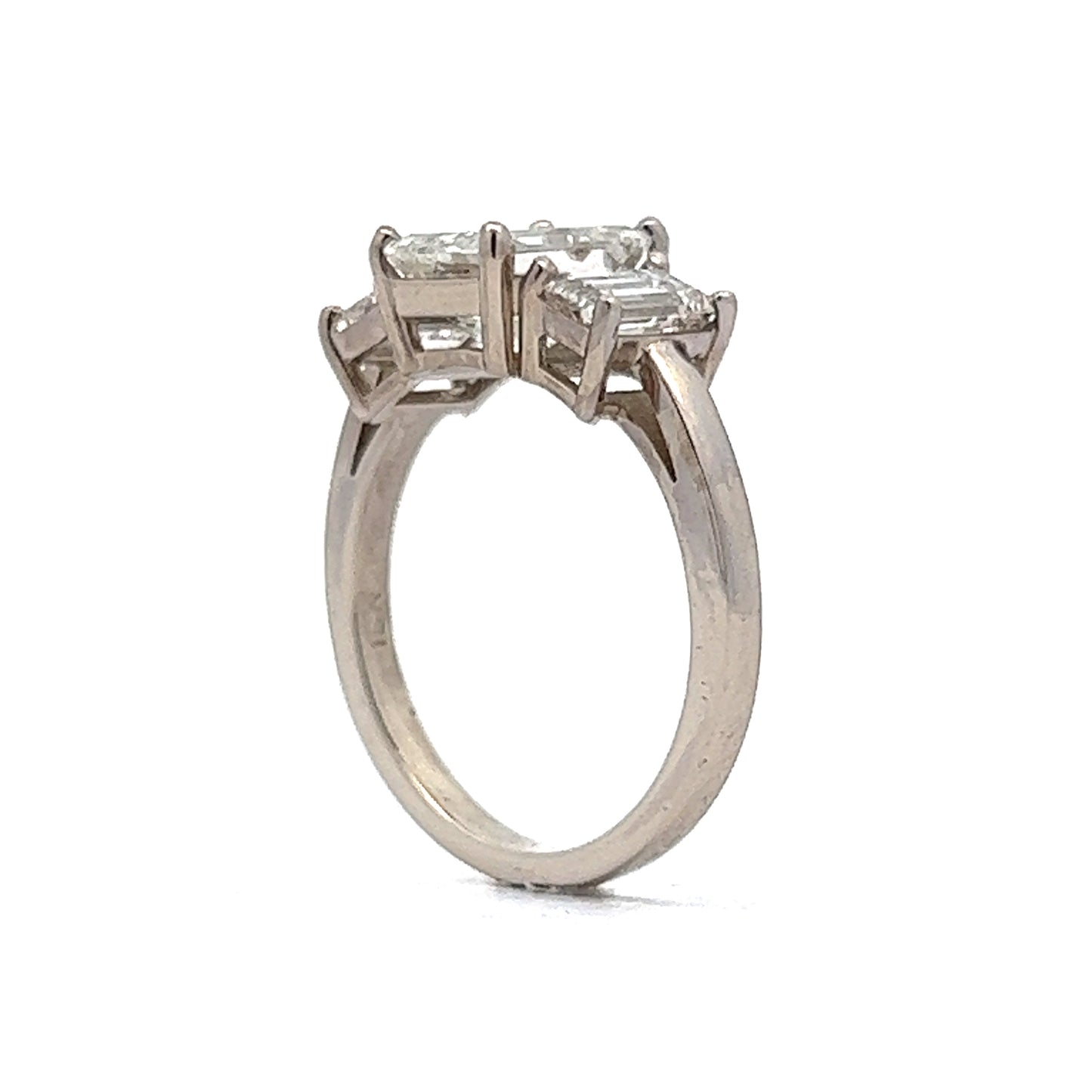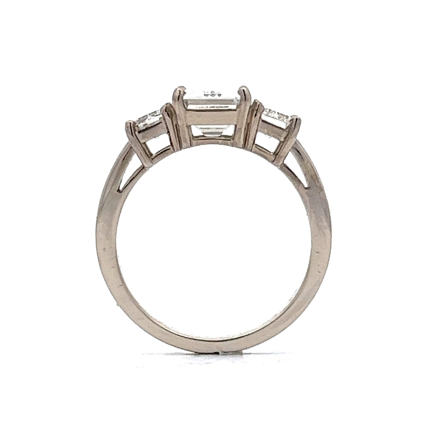 2.02 Emerald Cut Diamond Three Stone Engagement Ring in 18k White Gold