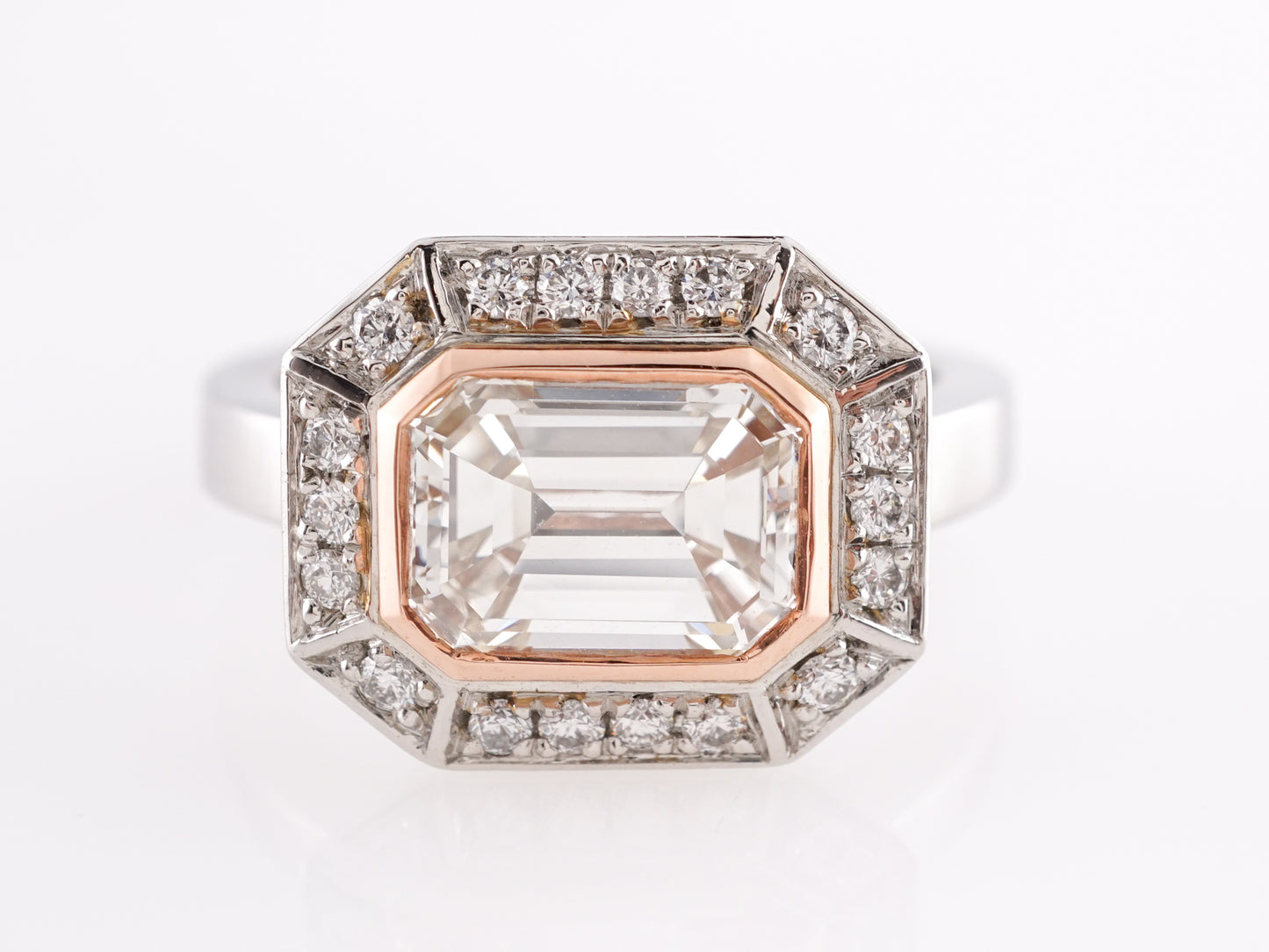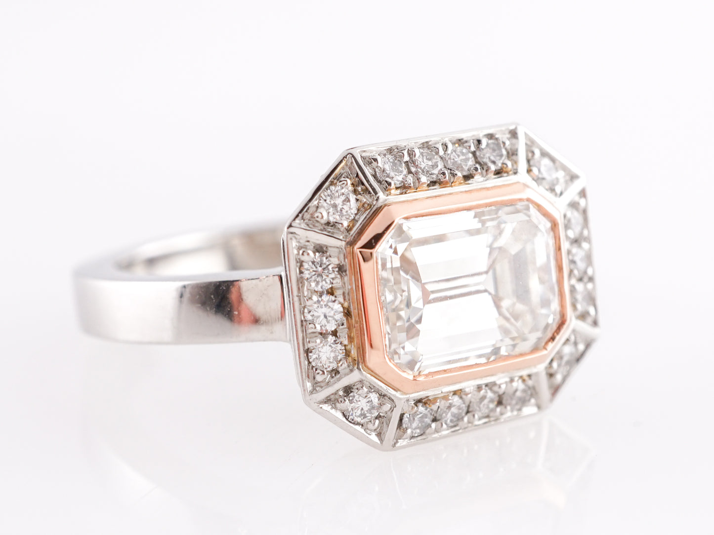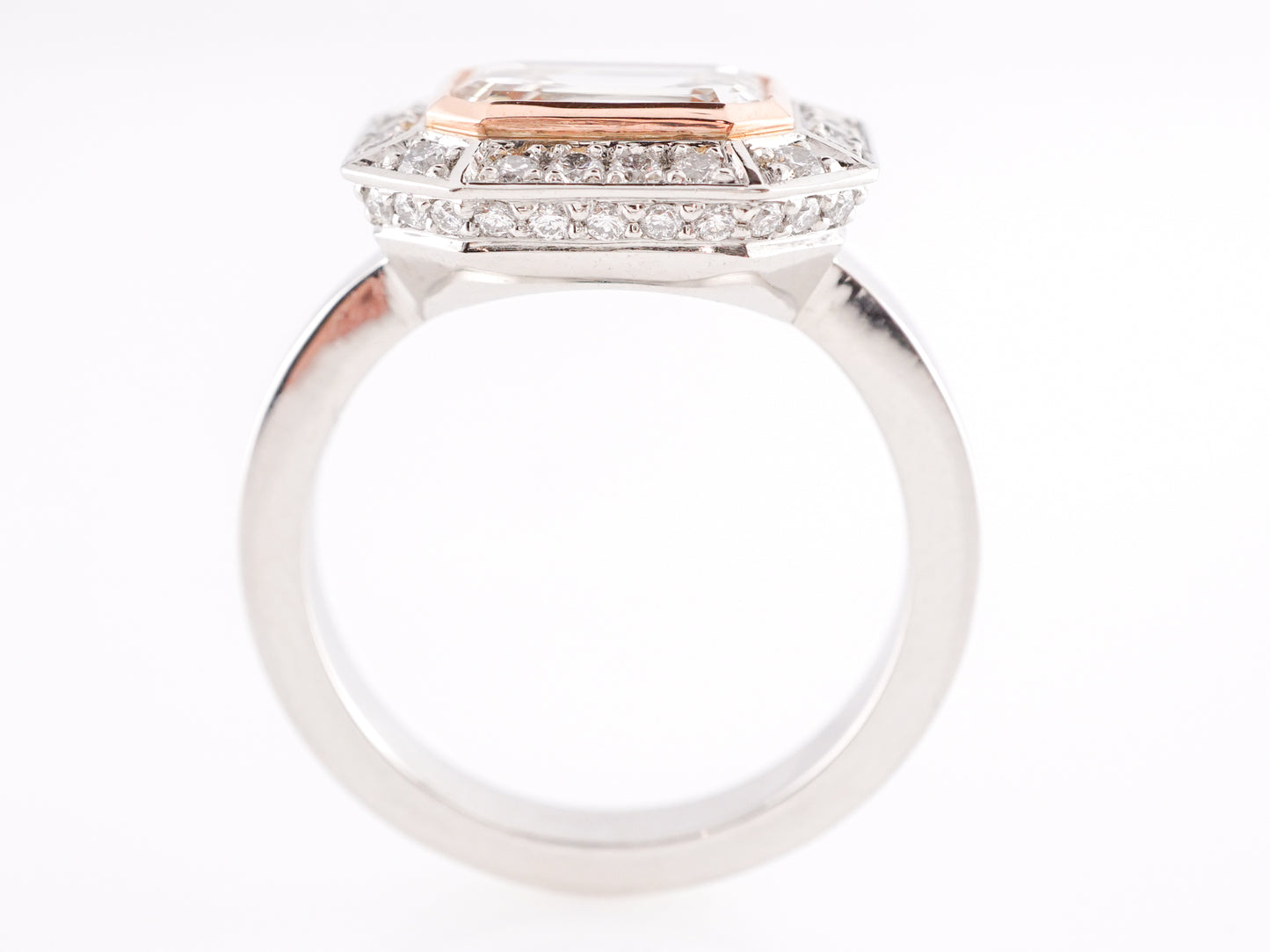 2.03 Emerald Cut Diamond Engagement Ring in Platinum and Rose Gold. This opulent engagement ring features a GIA-certified, 2.03 carat Emerald cut diamond in platinum and 18k rose gold. The near colorless diamond is on the high end of the clarity scale, eye clean and high in brilliance. The center stone has elongated facets that compliment the size of the stone. The center diamond is bezel set in 18k rose gold and surrounded by a halo of eighteen (18) accent diamonds, each weighing .01 carat. From the profile, thirty-two (32) petite accent diamonds line the gallery, each weighing .005 carats. Finished in a satin-matte platinum band for comfort and durability, this Modern engagement ring is a gorgeous future classic!