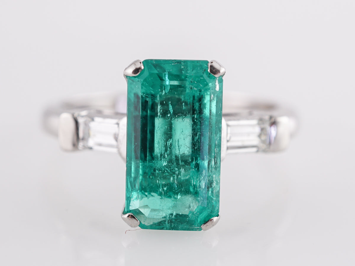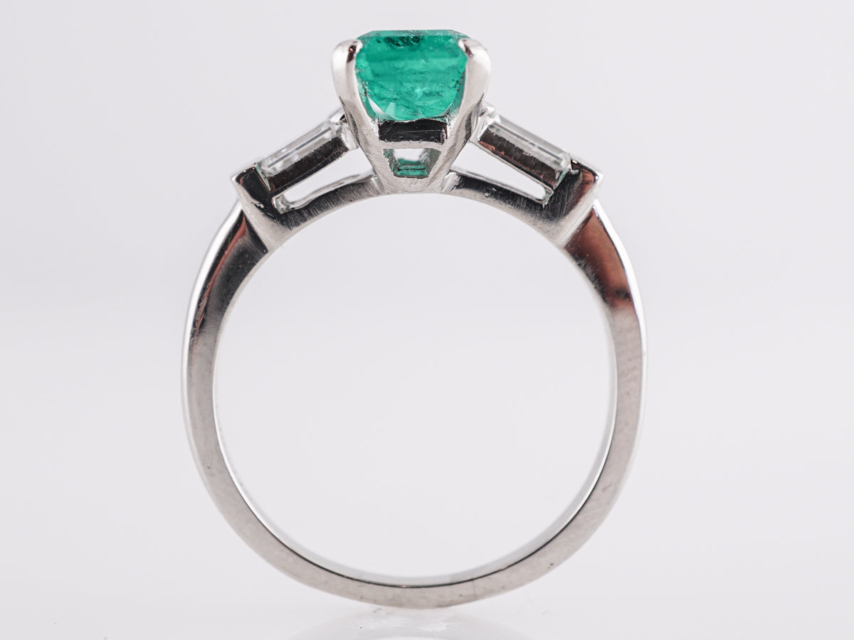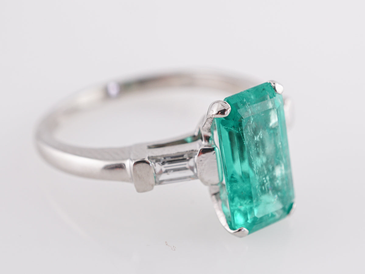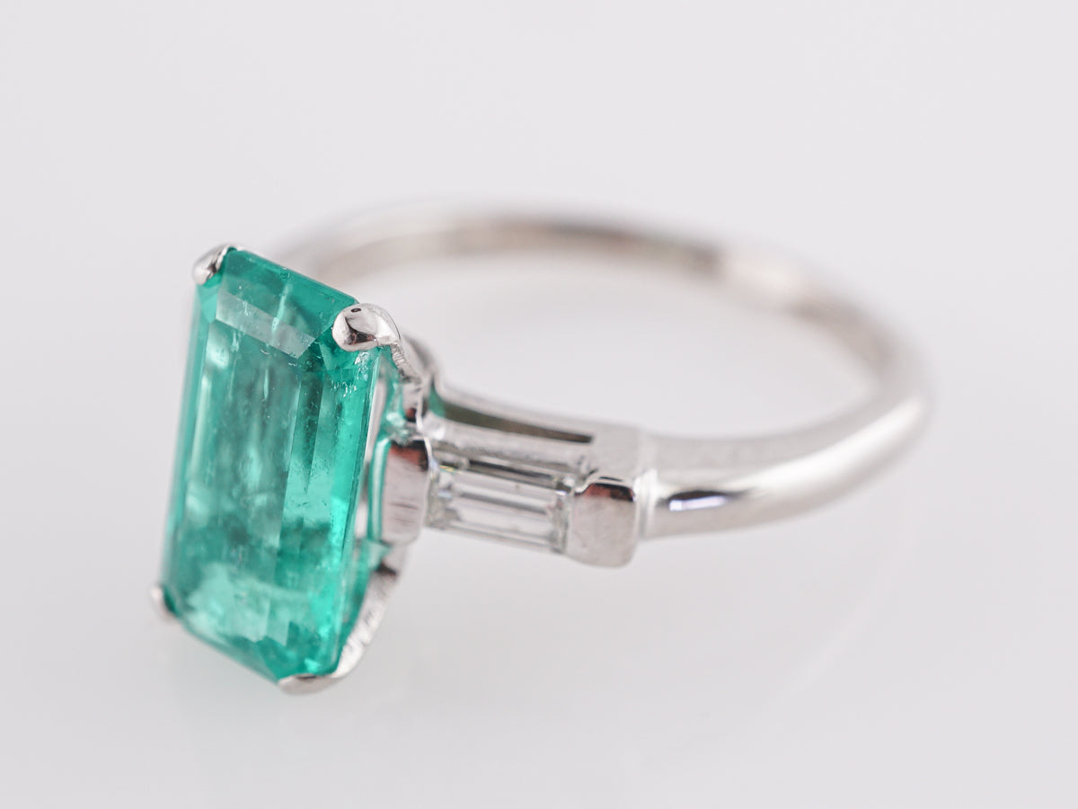 This modern ring features a 2.06 carat natural emerald in platinum. The hue of the primary emerald is an intense bluish-green. This beautiful, light emerald has rectangular facets and fits perfectly into four platinum prongs. Two .14 carat baguette cut diamonds accent the shoulders of the band. The mounting is a modern openwork design on a classic shaped band. This right hand ring is a marvel!