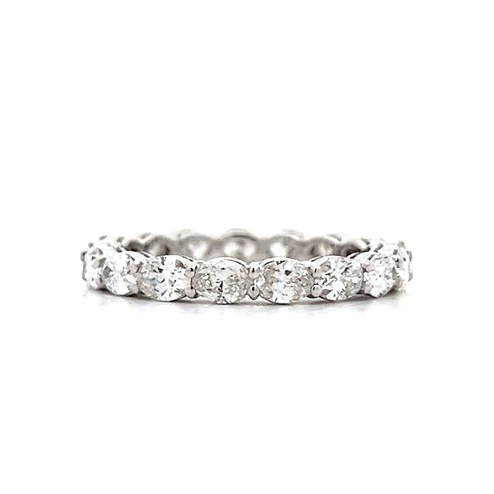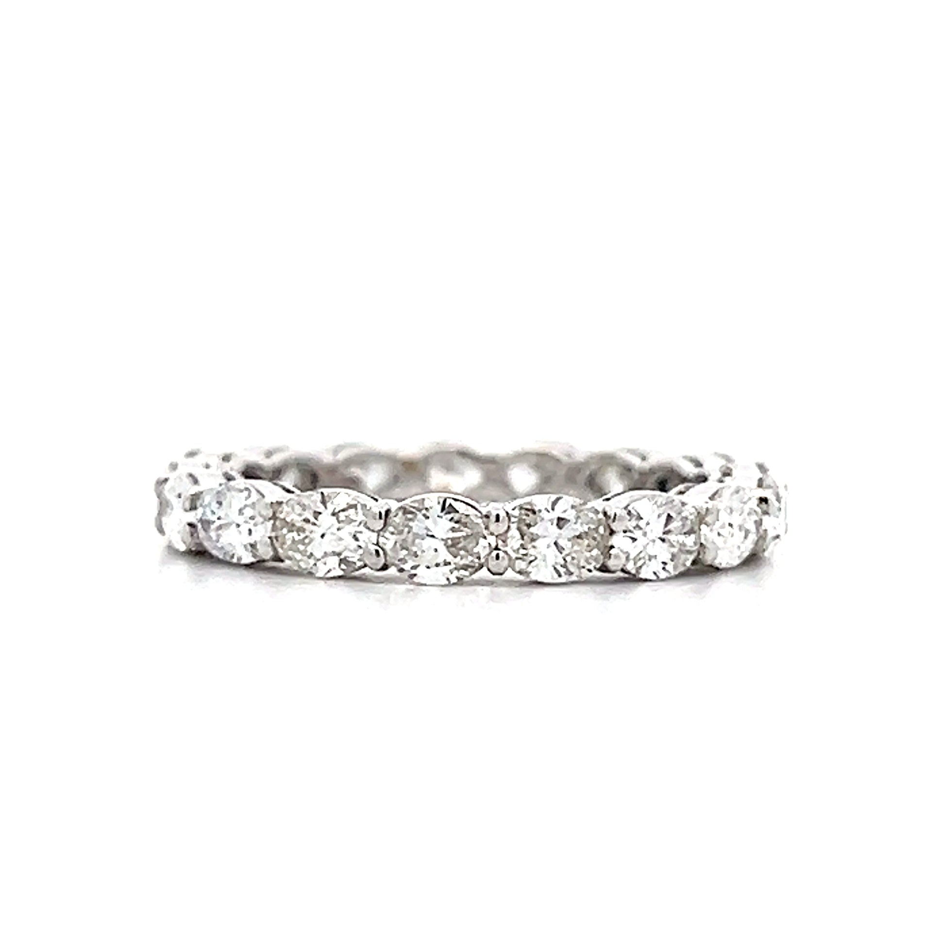 This 18 karat white gold eternity band features oval cut diamonds arranged in an east/west orientation around the entire band. Each diamond has VS2 clarity and an I color grade, totaling 2.08 carats in shared prong settings that maximize light exposure from multiple angles. The stackable design allows for versatility and showcases clean lines and sparkly minimalist aesthetics.