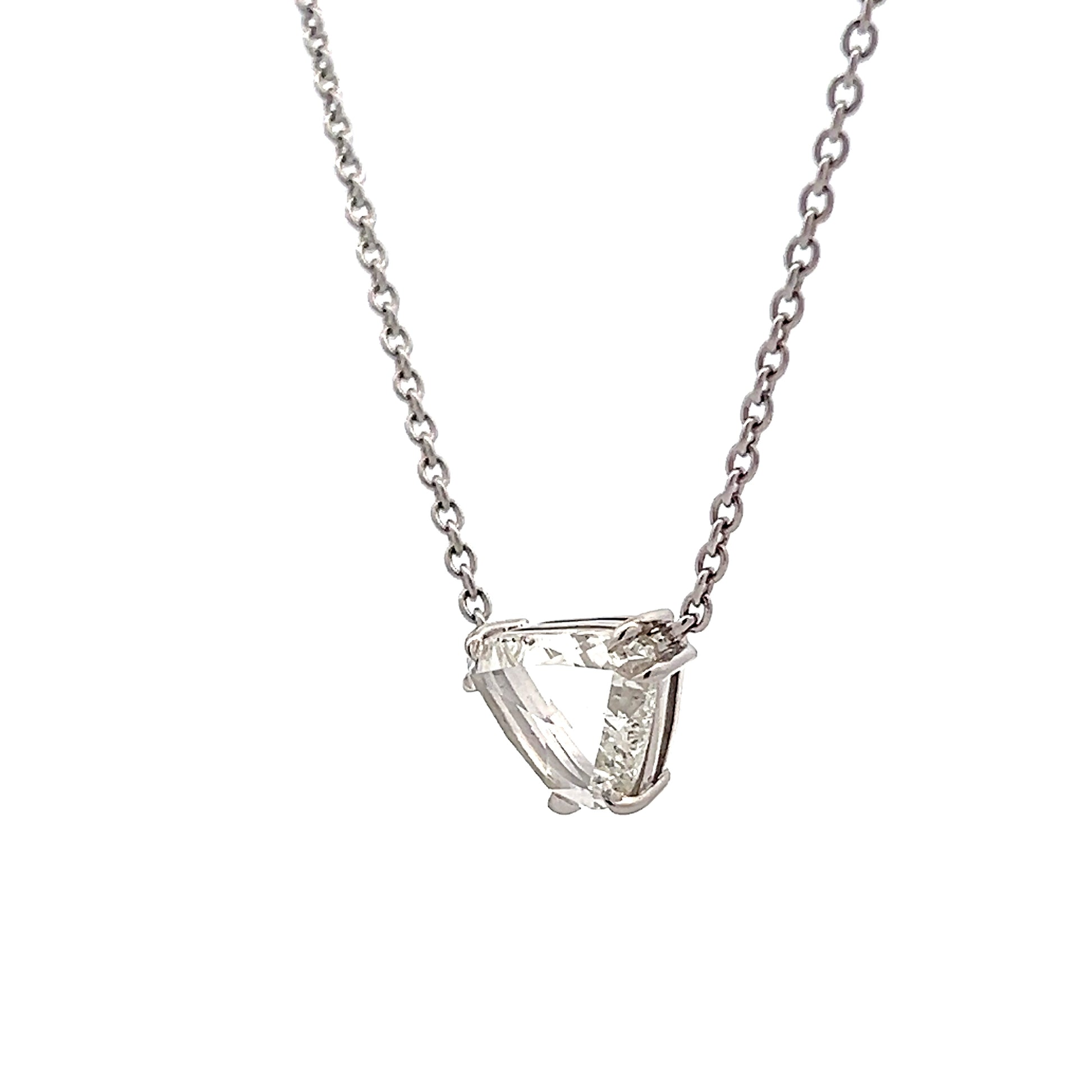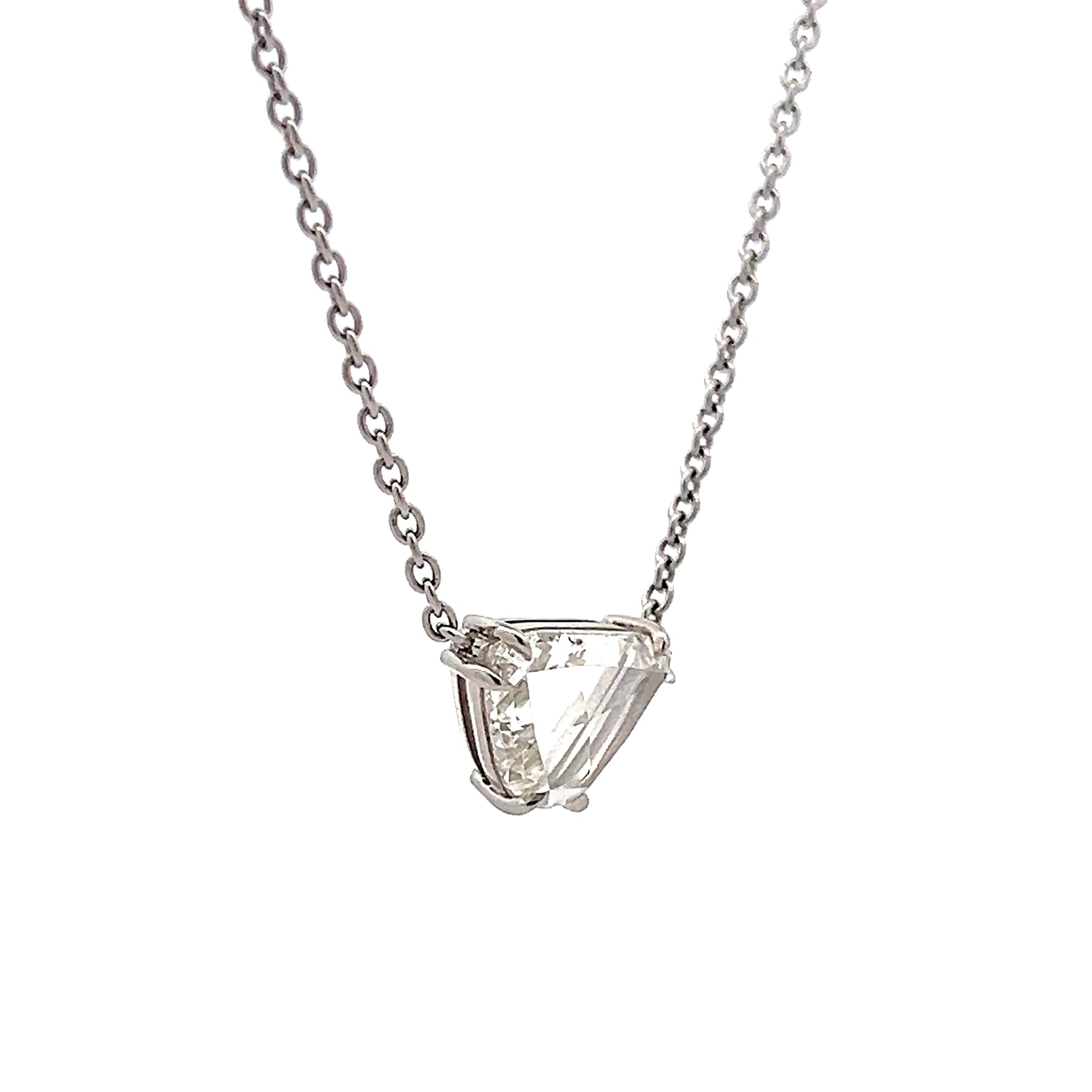 This pendant necklace features a 2.08 carat trillion rose-cut diamond set in four claw prongs. The diamond, with an SI2 clarity and J color, has a portrait-style cut that enhances its natural brilliance. Crafted in platinum, the setting allowes the diamond to take center stage. The adjustable chain length, ranging from 16.5 to 18.5 inches, makes it easy to wear with different necklines.