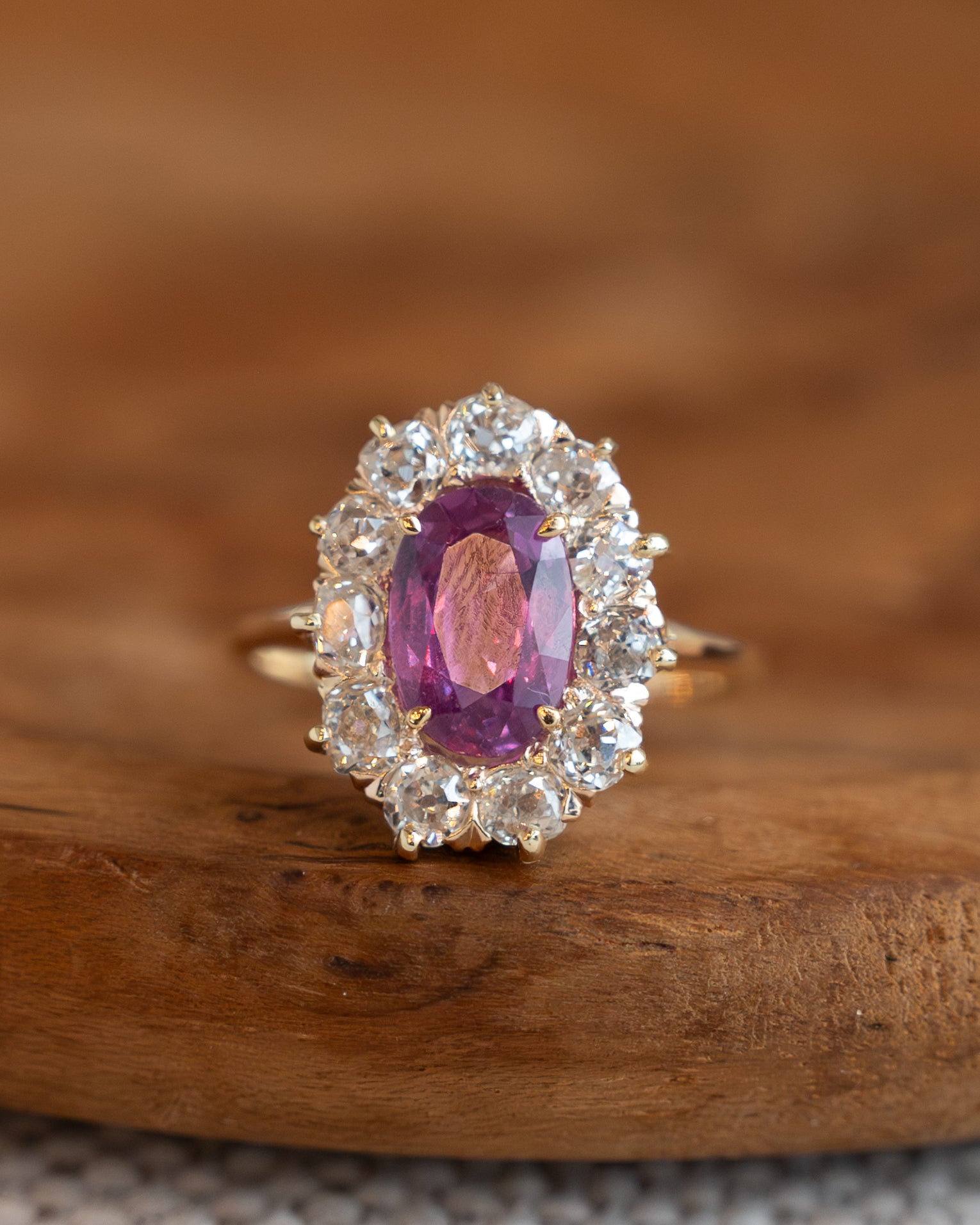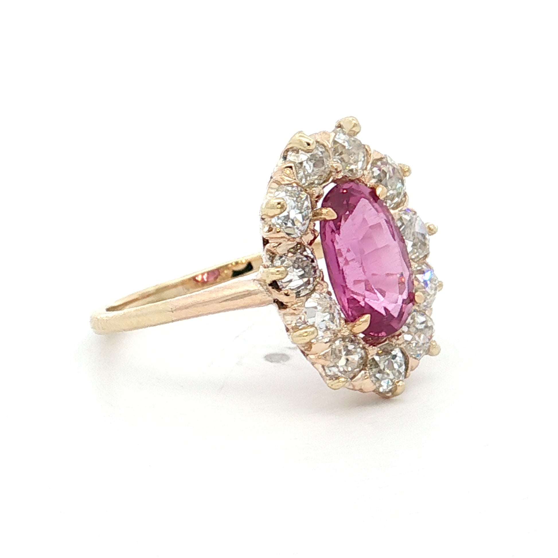 This Victorian era engagement ring features a 2.09 carat oval pink sapphire surrounded by a halo of 11 old mine cut diamonds totaling 1.21 carats. Each diamond measures 3.0mm and weighs .11 carats. The pink sapphire displays the soft blush tones, ranging from pale to medium pink depending on the lighting. Old mine cut diamonds from the Victorian period have a cushion-like shape with a high crown and small table, creating a softer, more romantic sparkle than modern cuts with their larger facets catching candlelight and natural light differently than electric light.