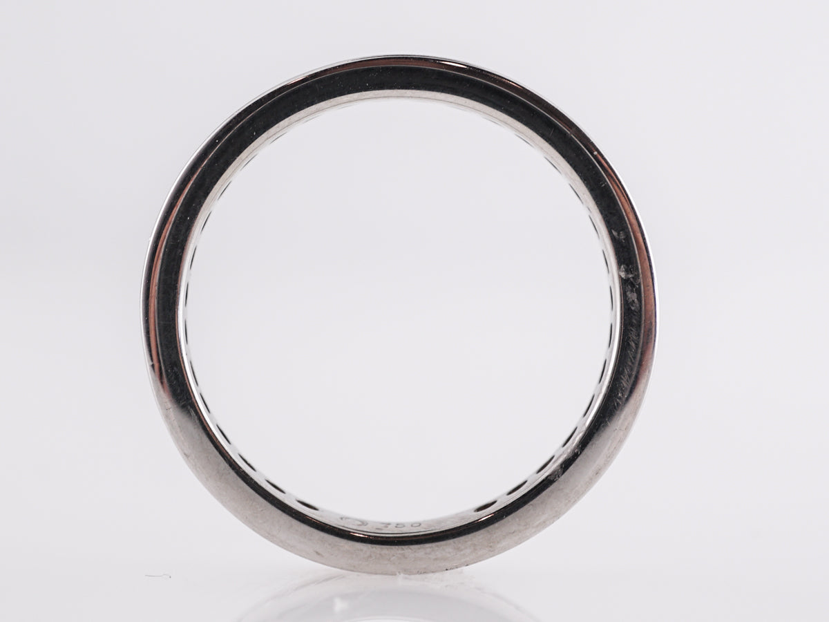 2.10 Princess Cut Diamond Eternity Band in 18k White Gold. This diamond eternity wedding band features a row of princess cut, genuine natural diamonds weighing a total of 2.10 carats. Thirty-five(35) petite .06ct diamonds sparkle against the 18k white gold band. The diamonds have no eye-visible imperfections. This ring is a modern creation and has a small inscription of “750” on the inside of the band.